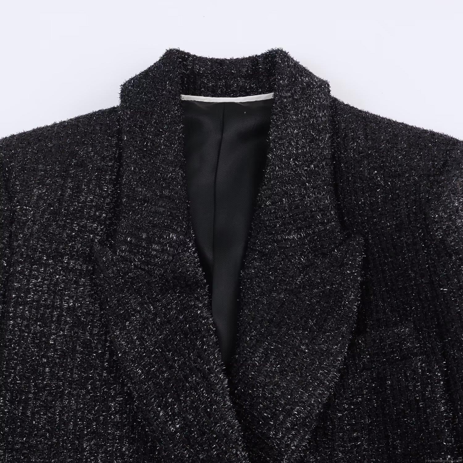 Women's Elegant Metallic Yarn Tweed Blazer Double Breasted Black Suit Jacket Casual Office Long Sleeve Outerwear With Gold Buttons