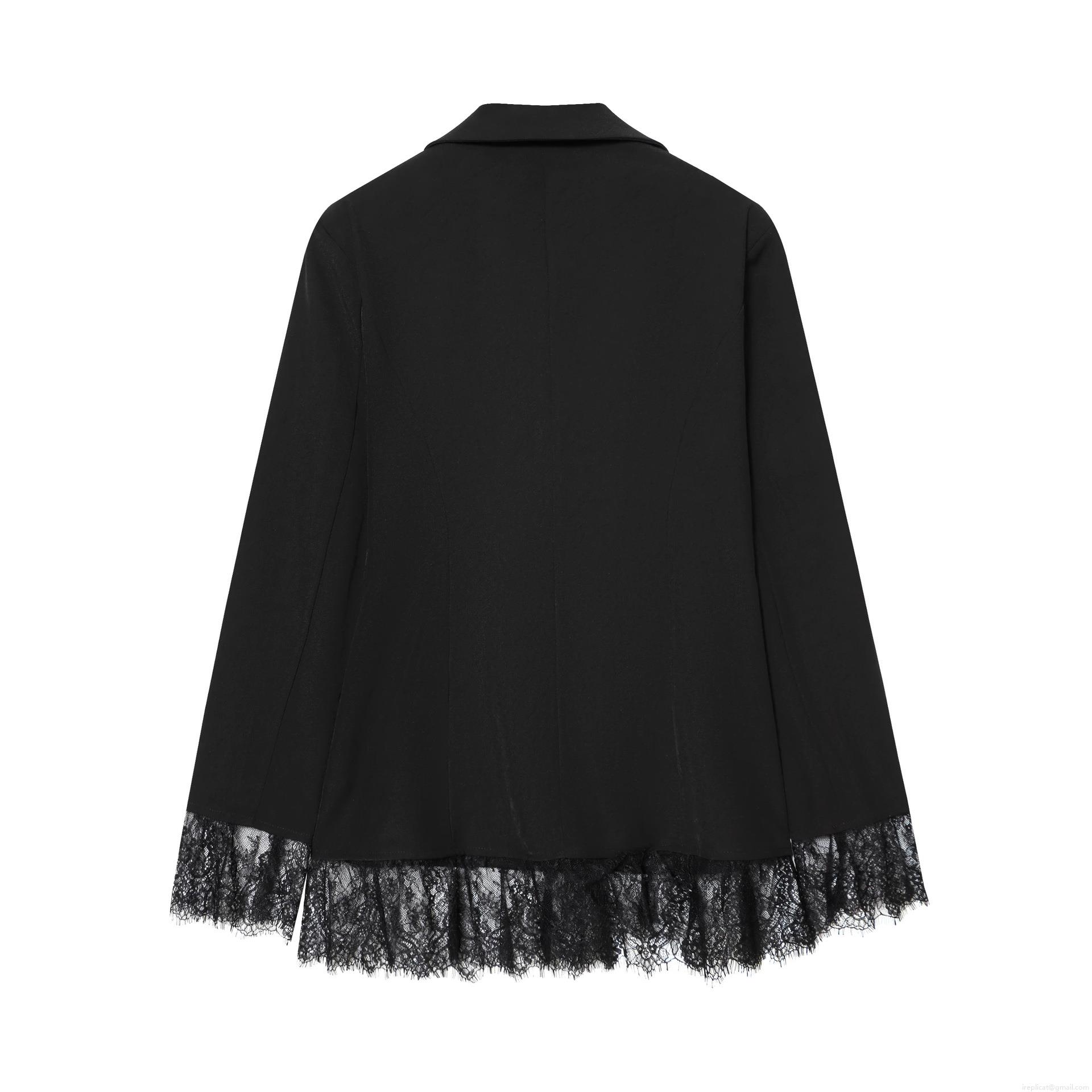 Women's Elegant Slim Fit Polyester Blazer Jacket With Exquisite Lace Patchwork Hem Cuffs Single Breasted Suit Collar Long Sleeve Outerwear For Office