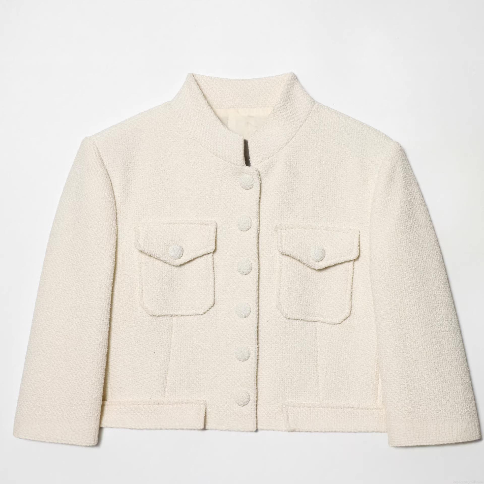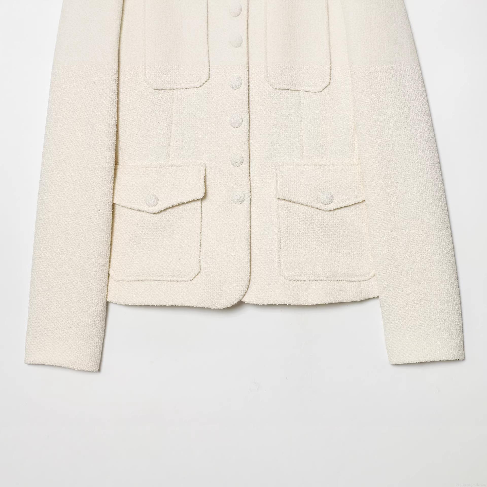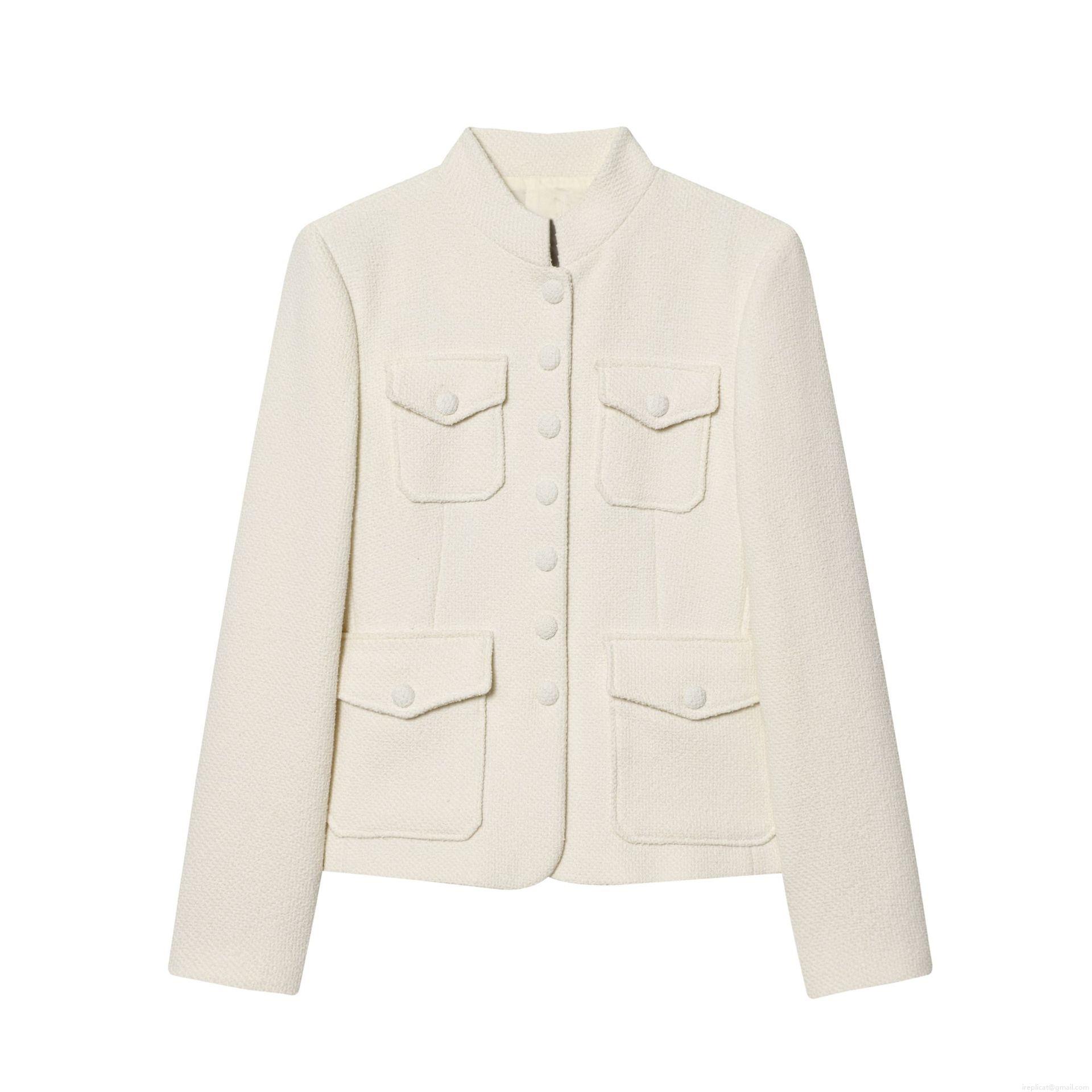 • Women's Elegant Tweed Blazer Jacket Stand Collar Single Breasted With Four Flap Pockets Cream Beige 100% Polyester Long Sleeve Suit Outerwear For Women Office Casual
