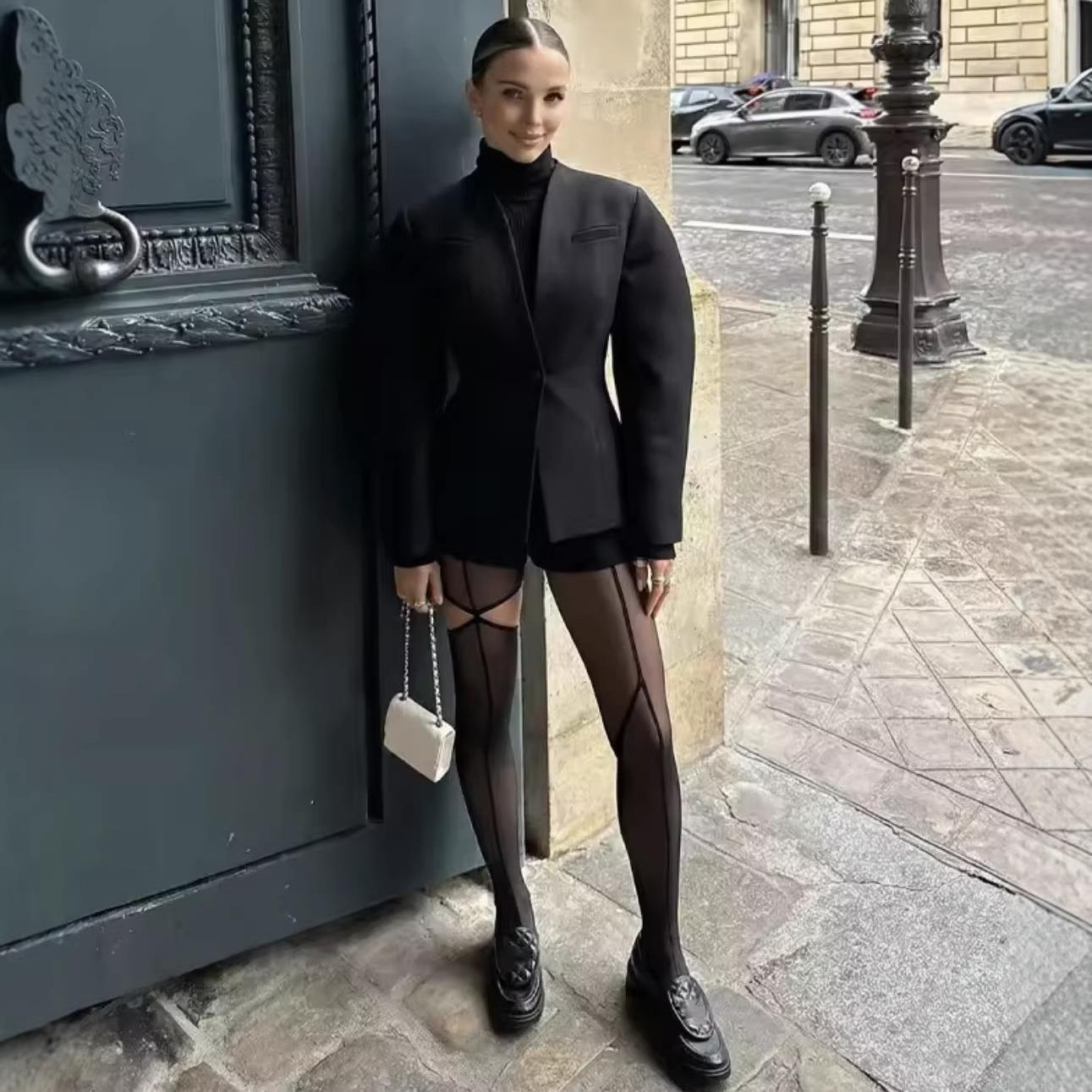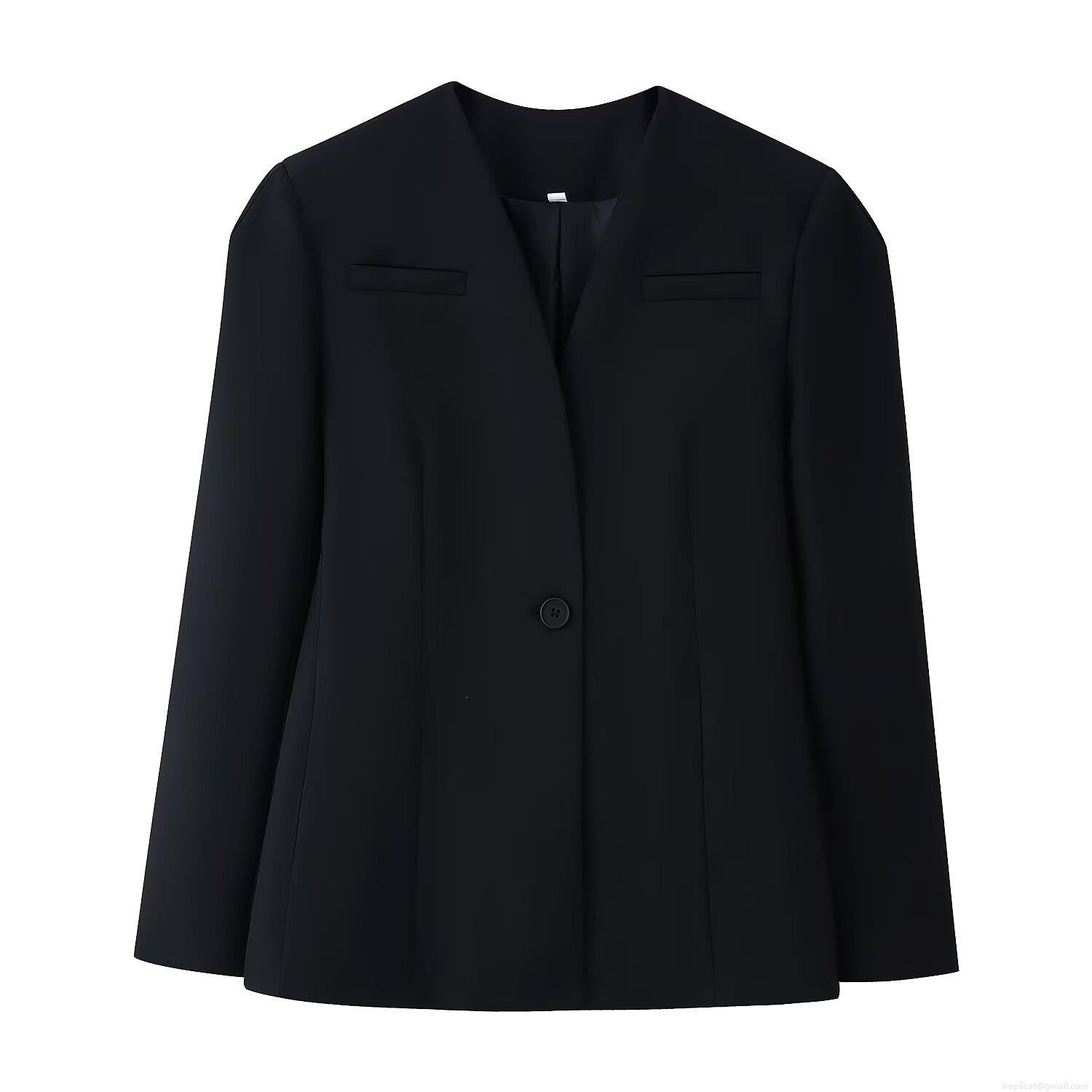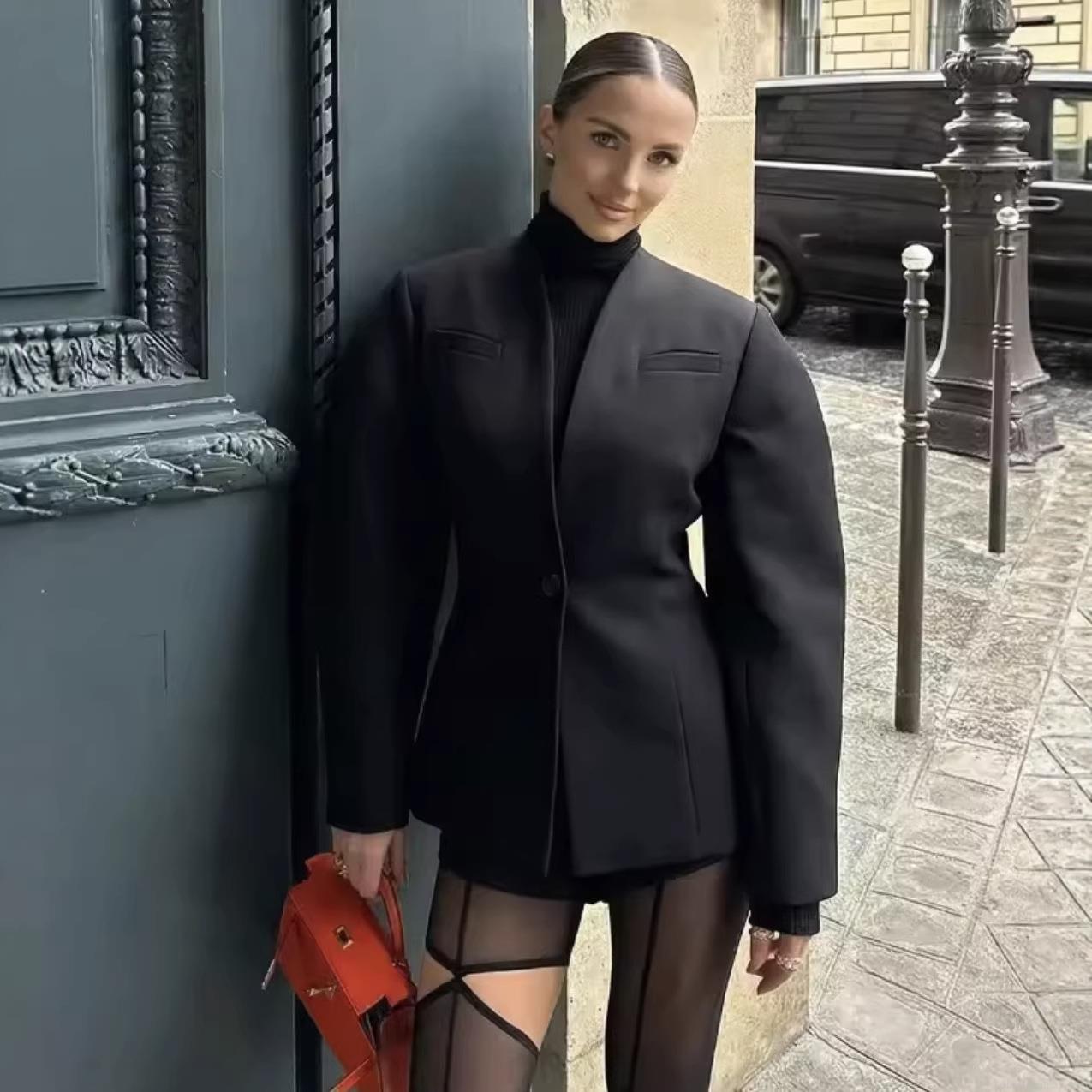 • Women's Elegant V-Neck Puff Sleeve Black Blazer Jacket Office Lady Loose Single Breasted Polyester Outerwear For Casual Daily Wear