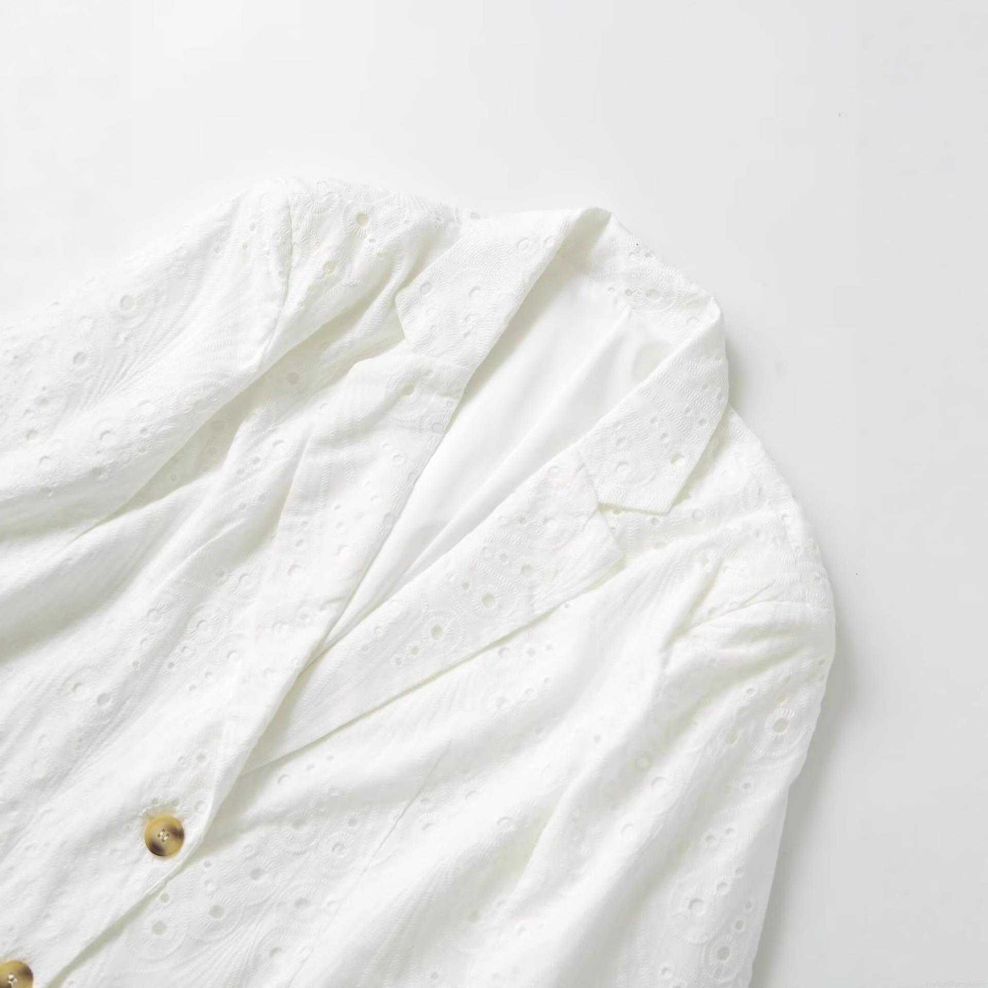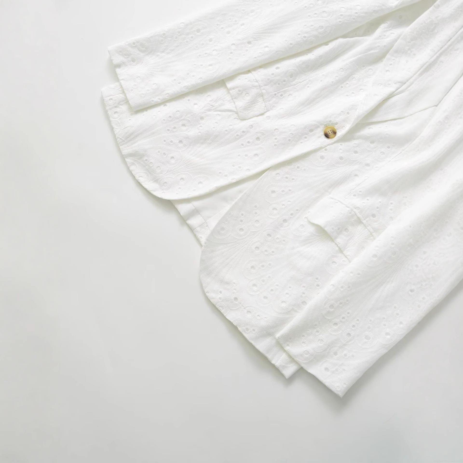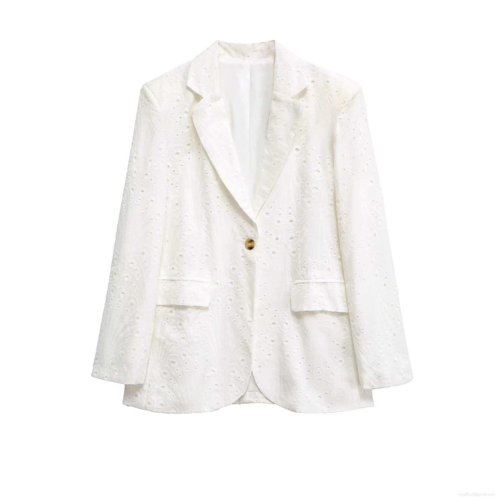 • Women's Elegant White Eyelet Embroidery Blazer Jacket Single Breasted Lapel Long Sleeve Polyester Outerwear For Office Commute Casual Wear
