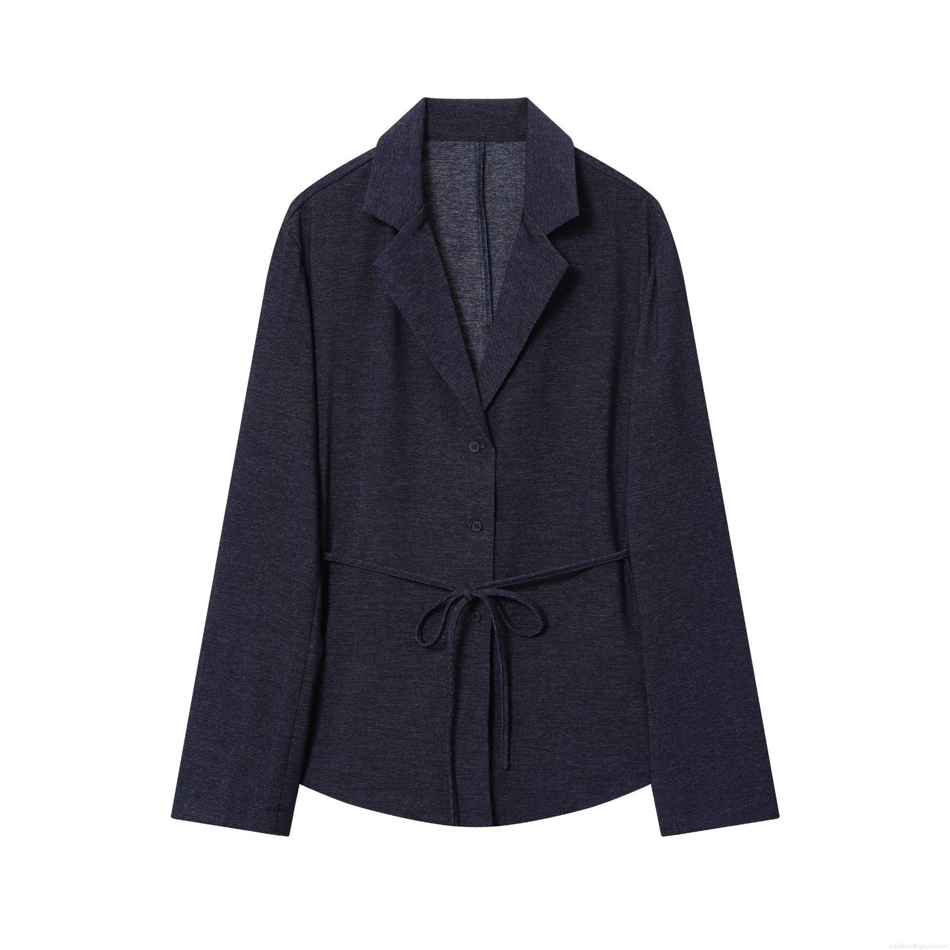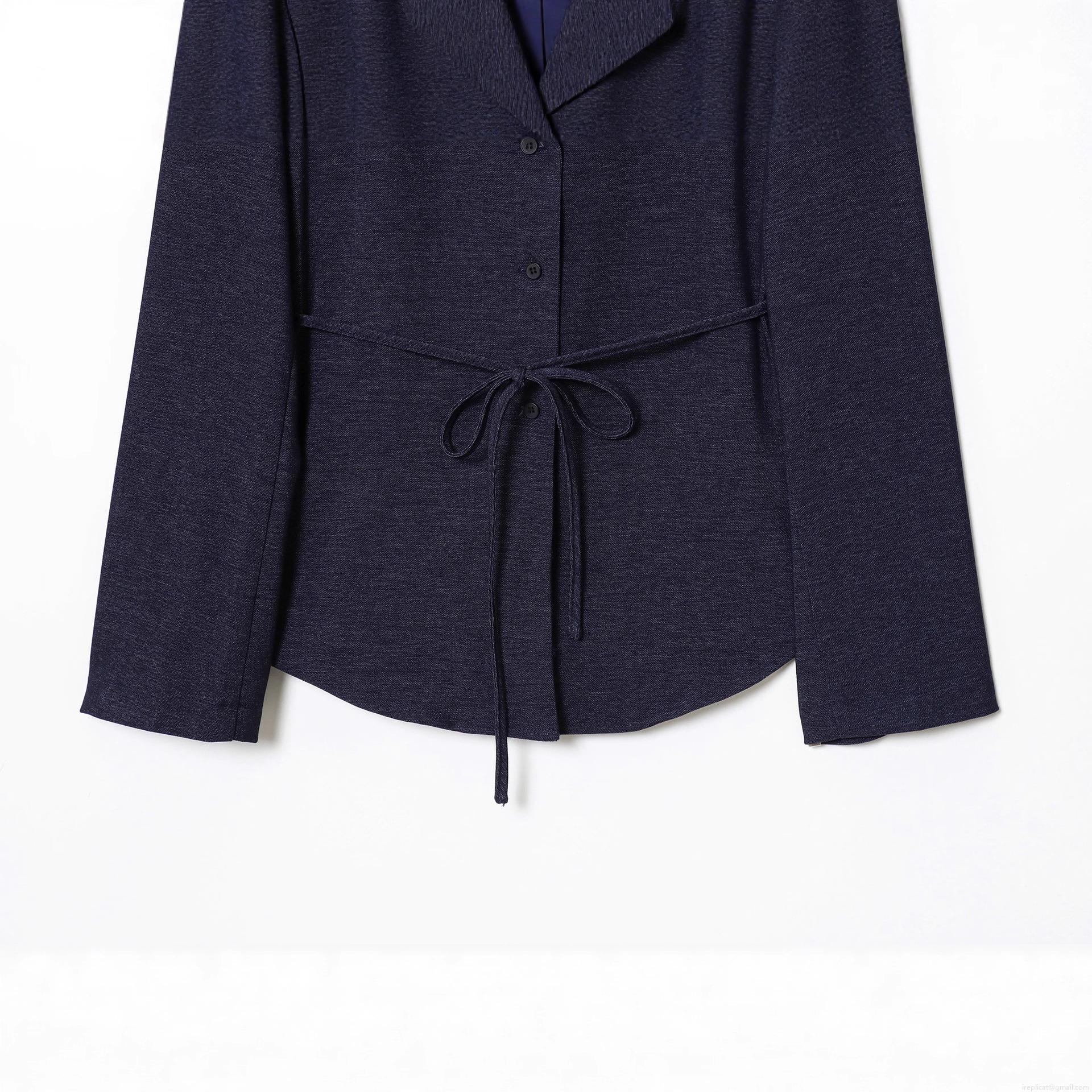 Women's Fashion Navy Blue Polyester Blazer Jacket With Belt Single Breasted Turn Down Collar Mid Length Outerwear For Office Lady Casual Elegant Coat