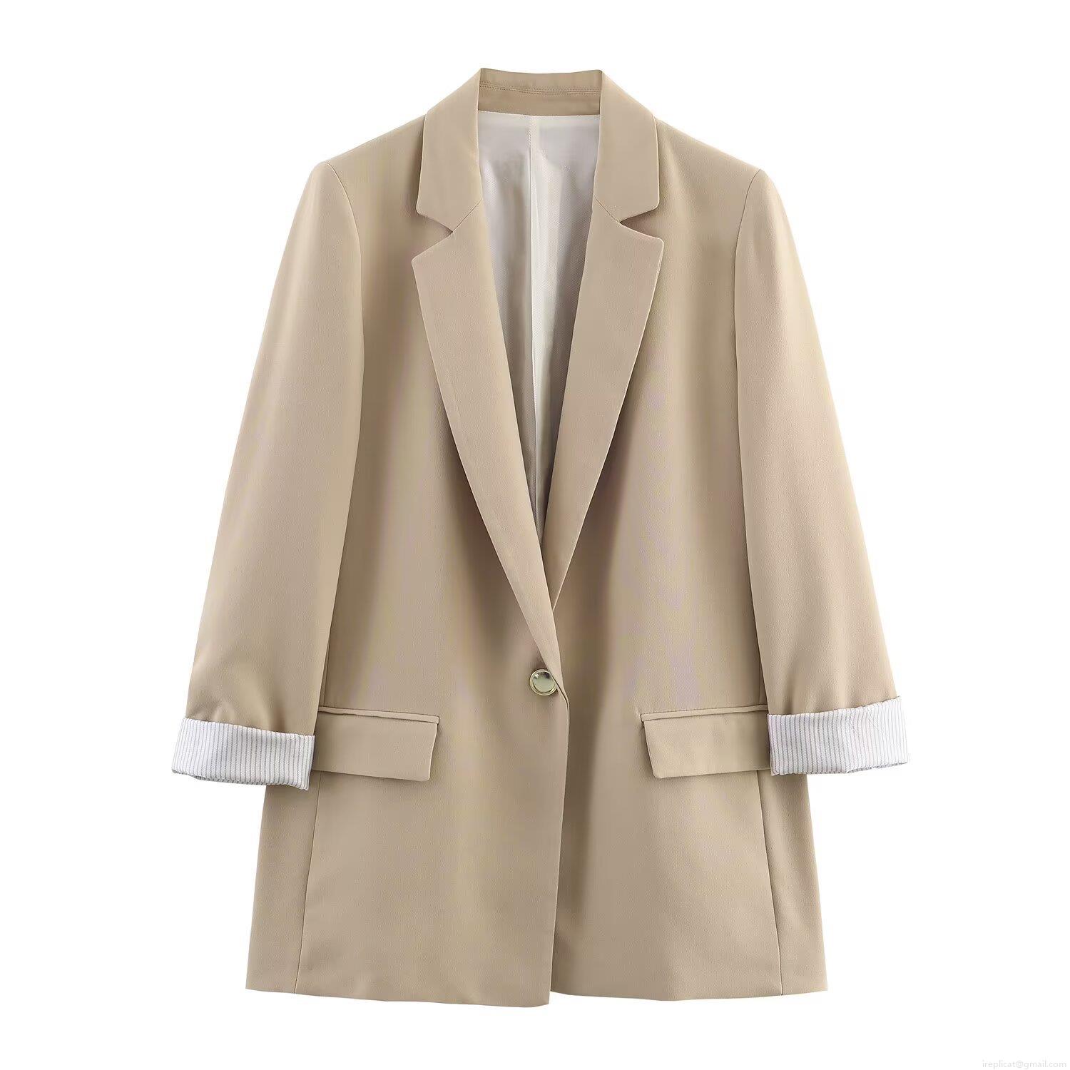 Women's Fashion Polyester Blazer Jacket Street Style One Button Long Sleeve Loose Outwear With Printed Cuffs For Casual Office Wear Khaki Brown Black