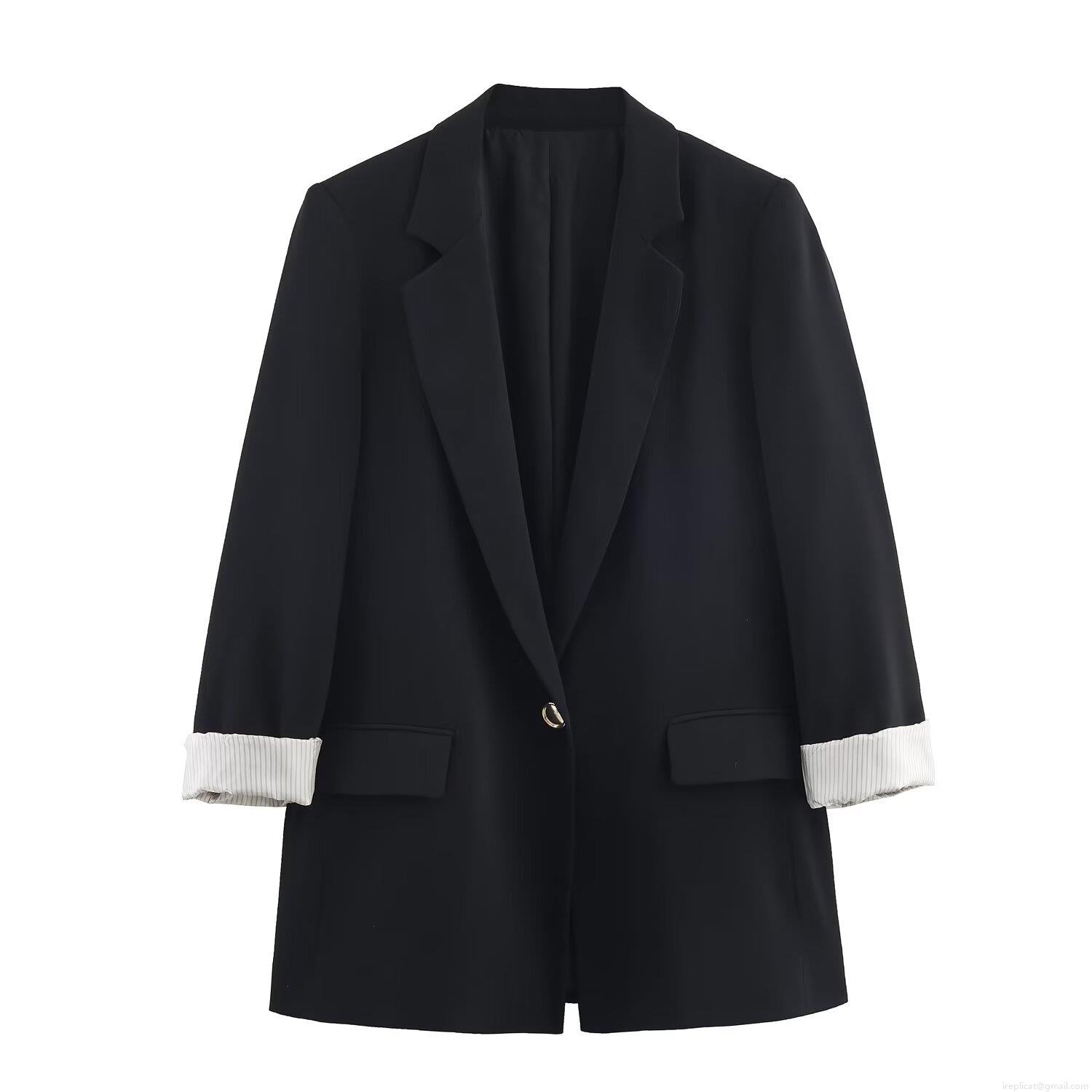 • Women's Fashion Polyester Blazer Jacket Street Style One Button Long Sleeve Loose Outwear With Printed Cuffs For Casual Office Wear Khaki Brown Black