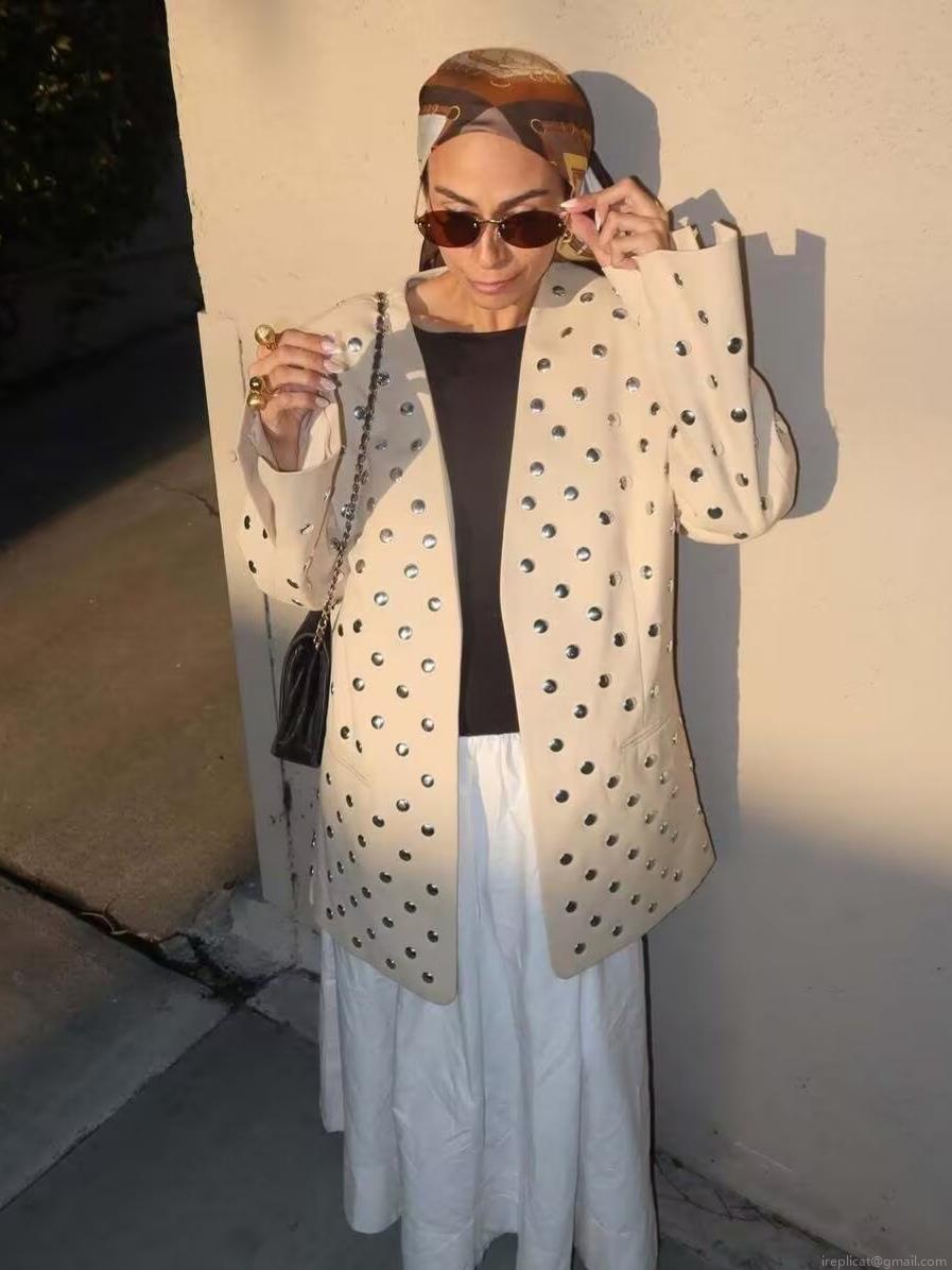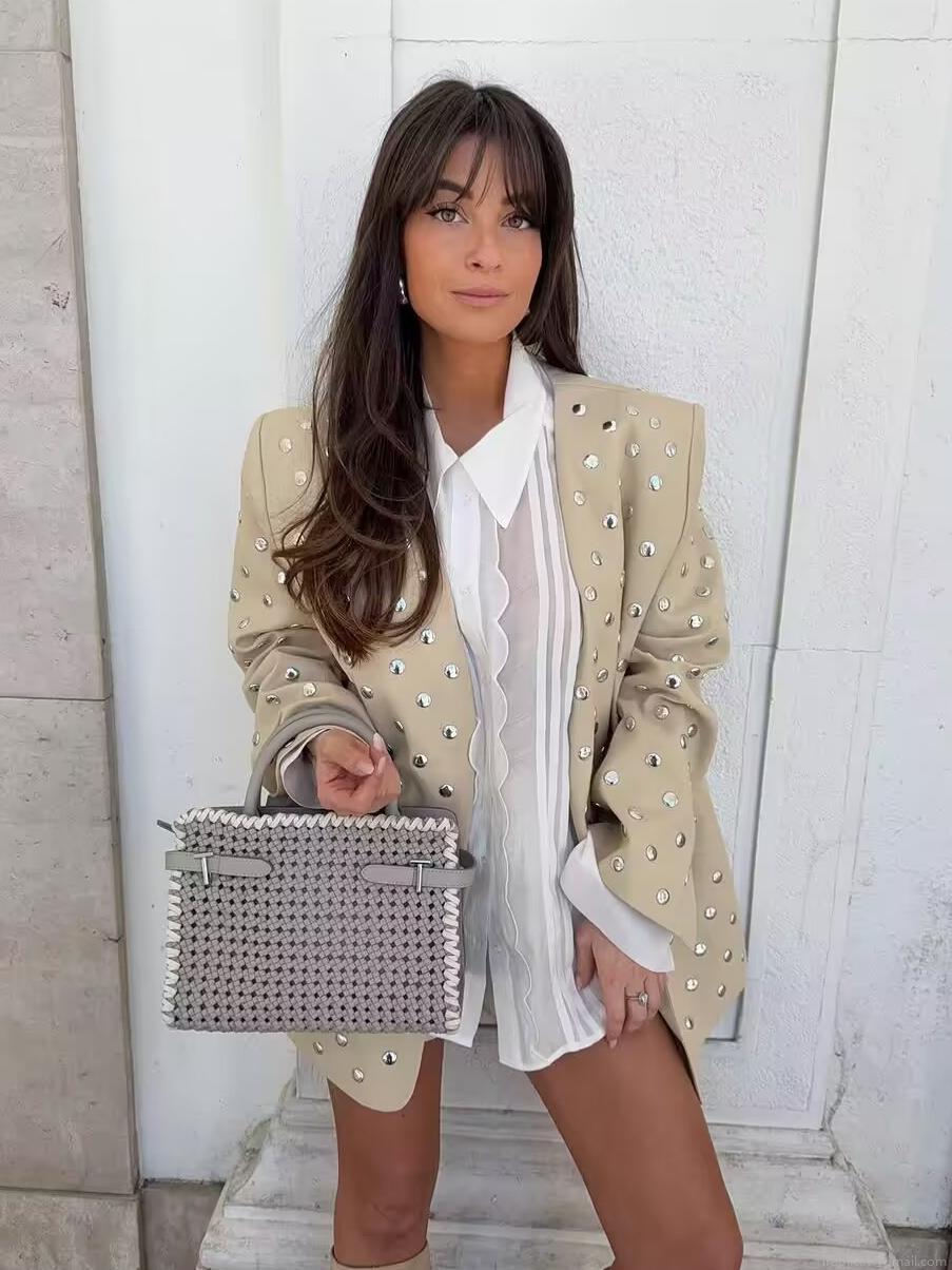 Women's Fashion Rivet Decor Blazer Oversized Long Sleeve Beige Polyester Jacket For Streetwear Daily Party Ladies Outerwear