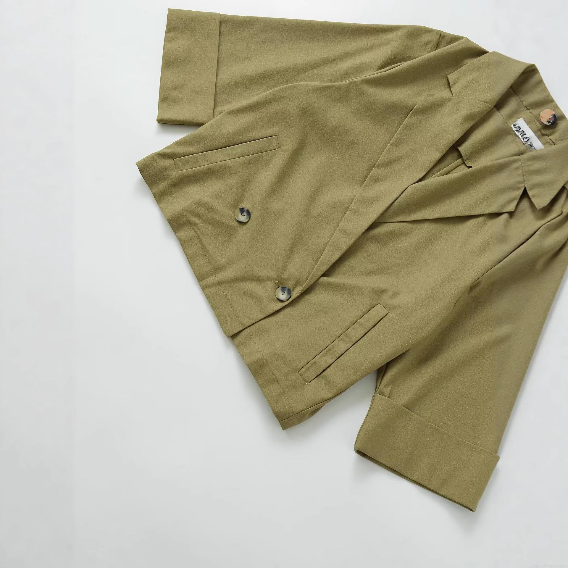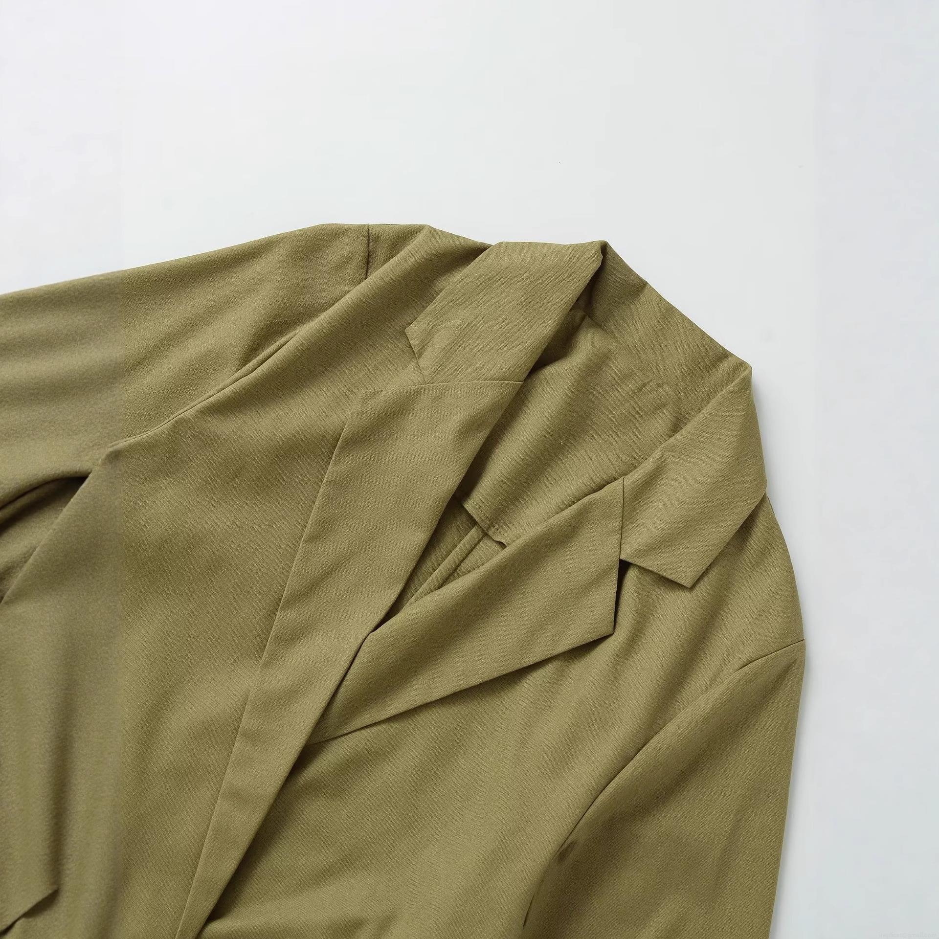 • Women's Fashion Short Blazer Jacket Solid Olive Green Double Breasted Three Quarter Sleeve Lapel Collar Casual Outerwear Linen Look Suit Coat For Ladies