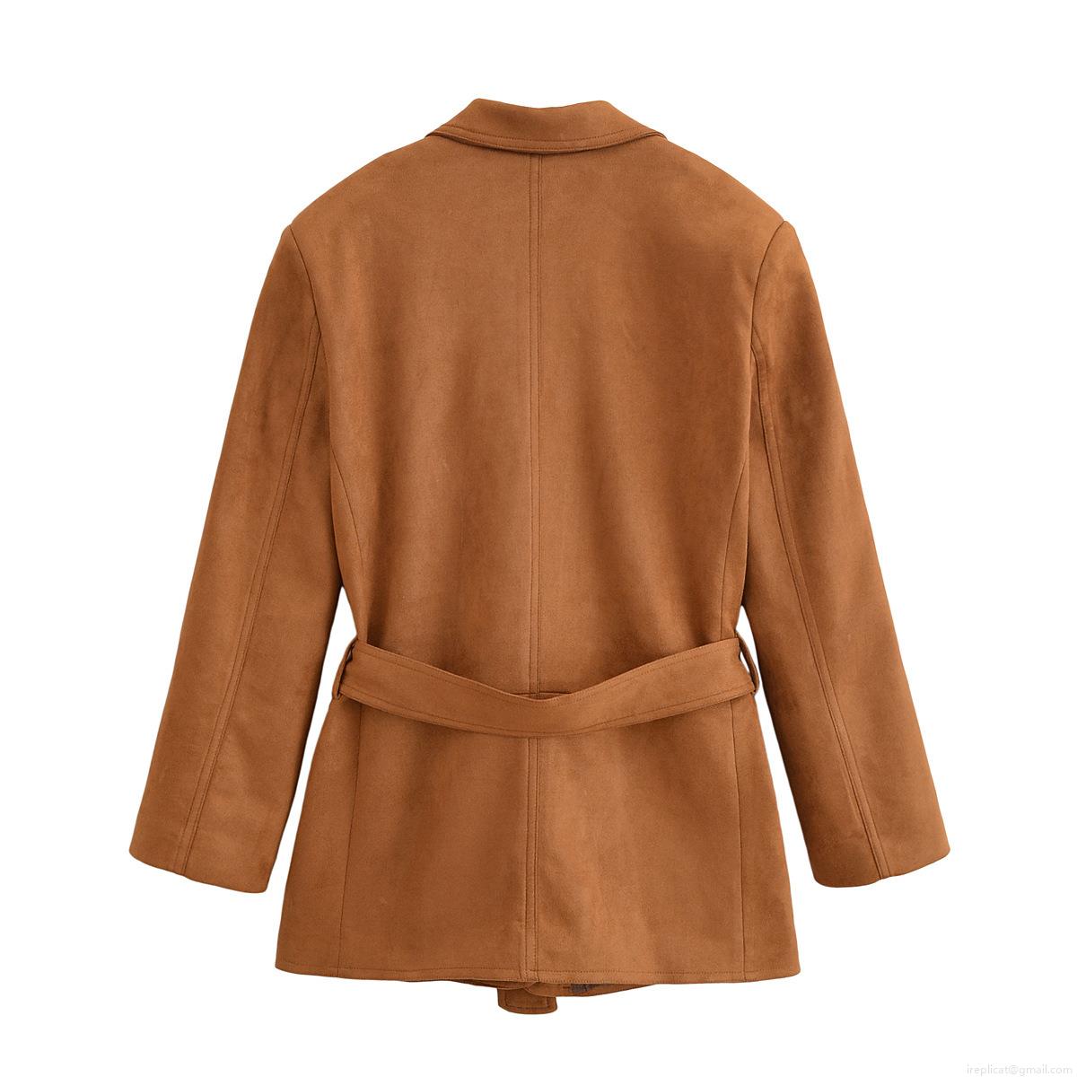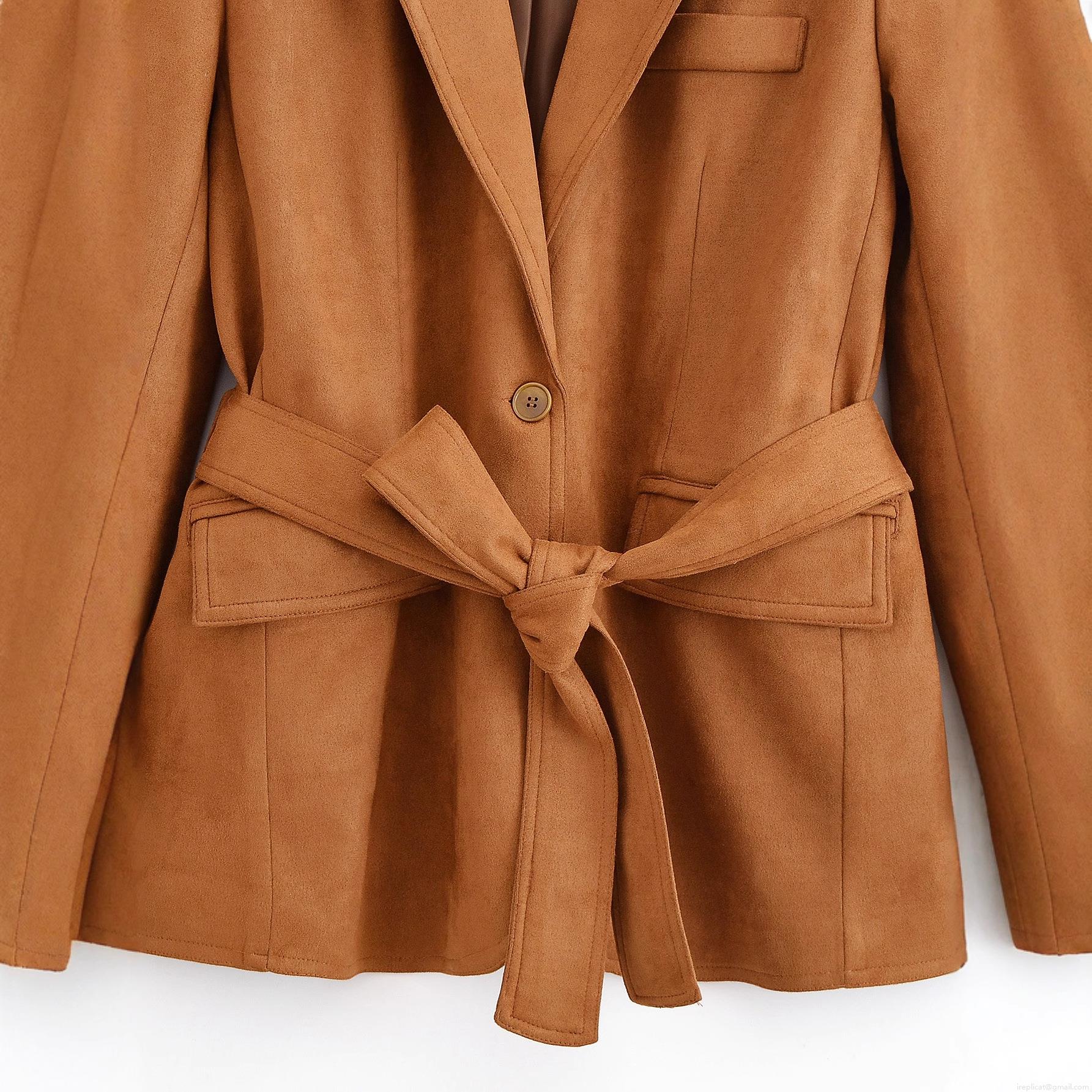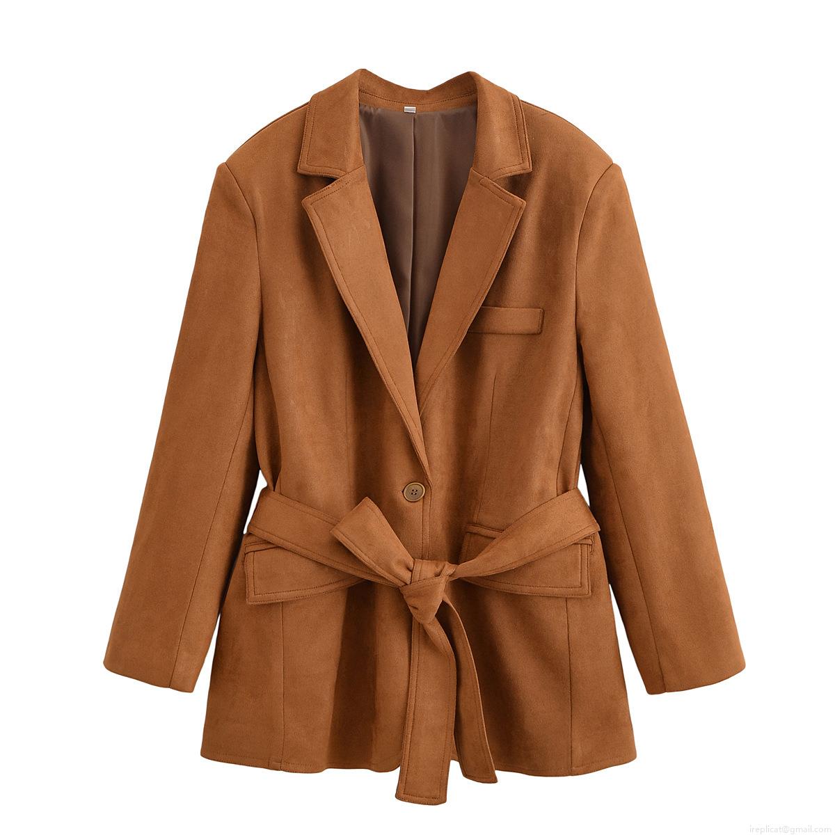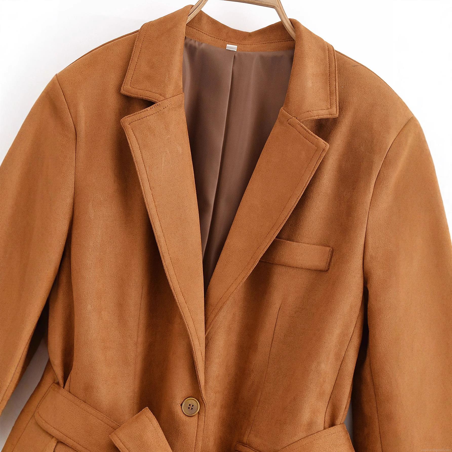 • Women's Faux Suede Blazer Jacket With Waist Tie Belt Lapel Collar Long Sleeve Solid Color Casual Autumn Spring Coat For Women