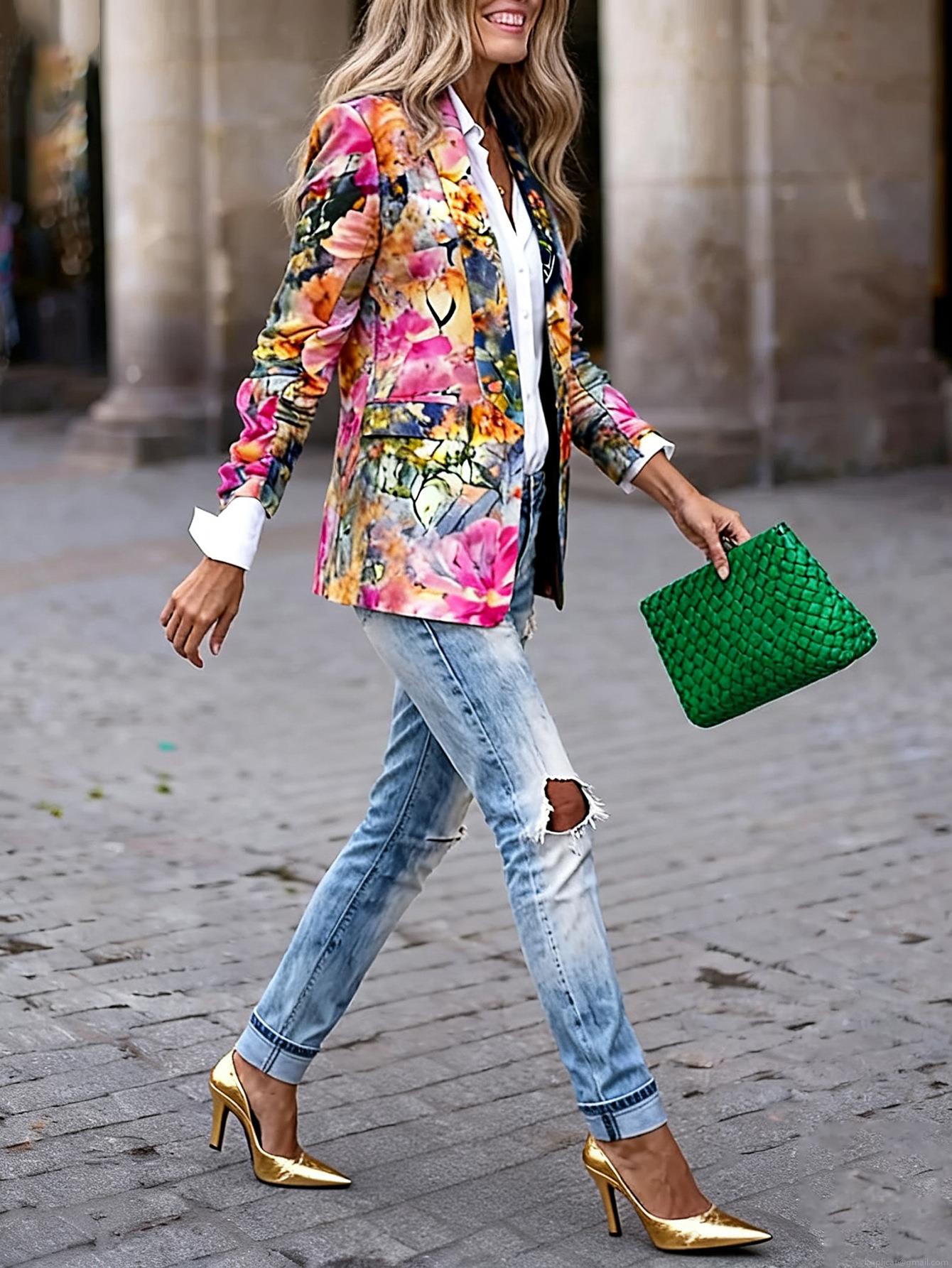 • Women's Floral Print Blazer Jacket Slim Fit Lightweight Polyester Nine-Point Sleeve Open Front Casual Fashion Streetwear Office Lady Autumn Outerwear