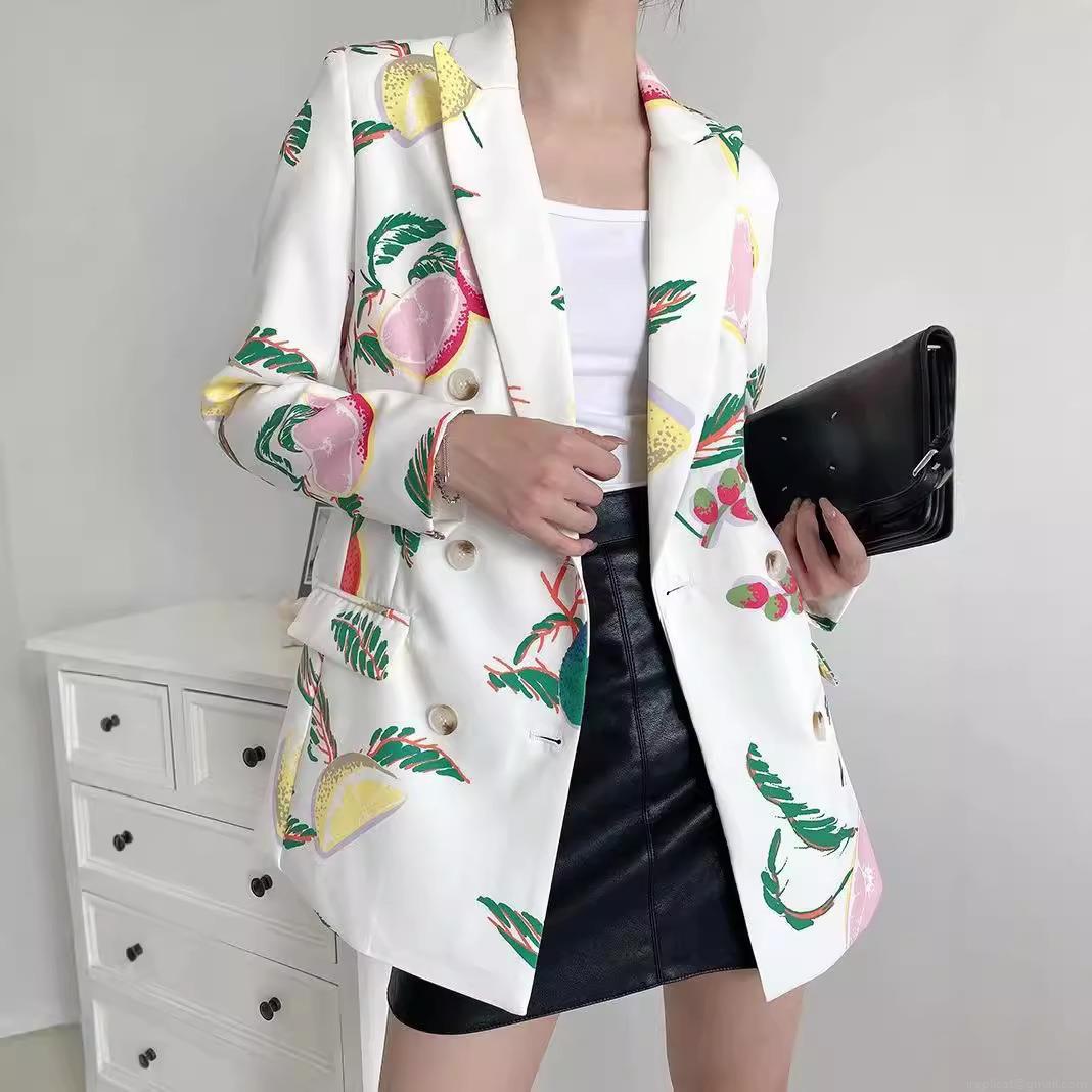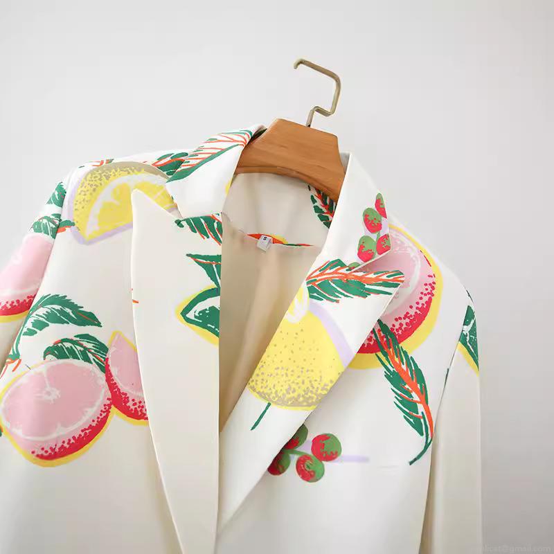 • Women's Fruit Print Blazer Jacket Fashion Double Breasted Lapel Outerwear Elegant Polyester Cotton Blend Long Sleeve Coat for Women Streetwear Casual Style