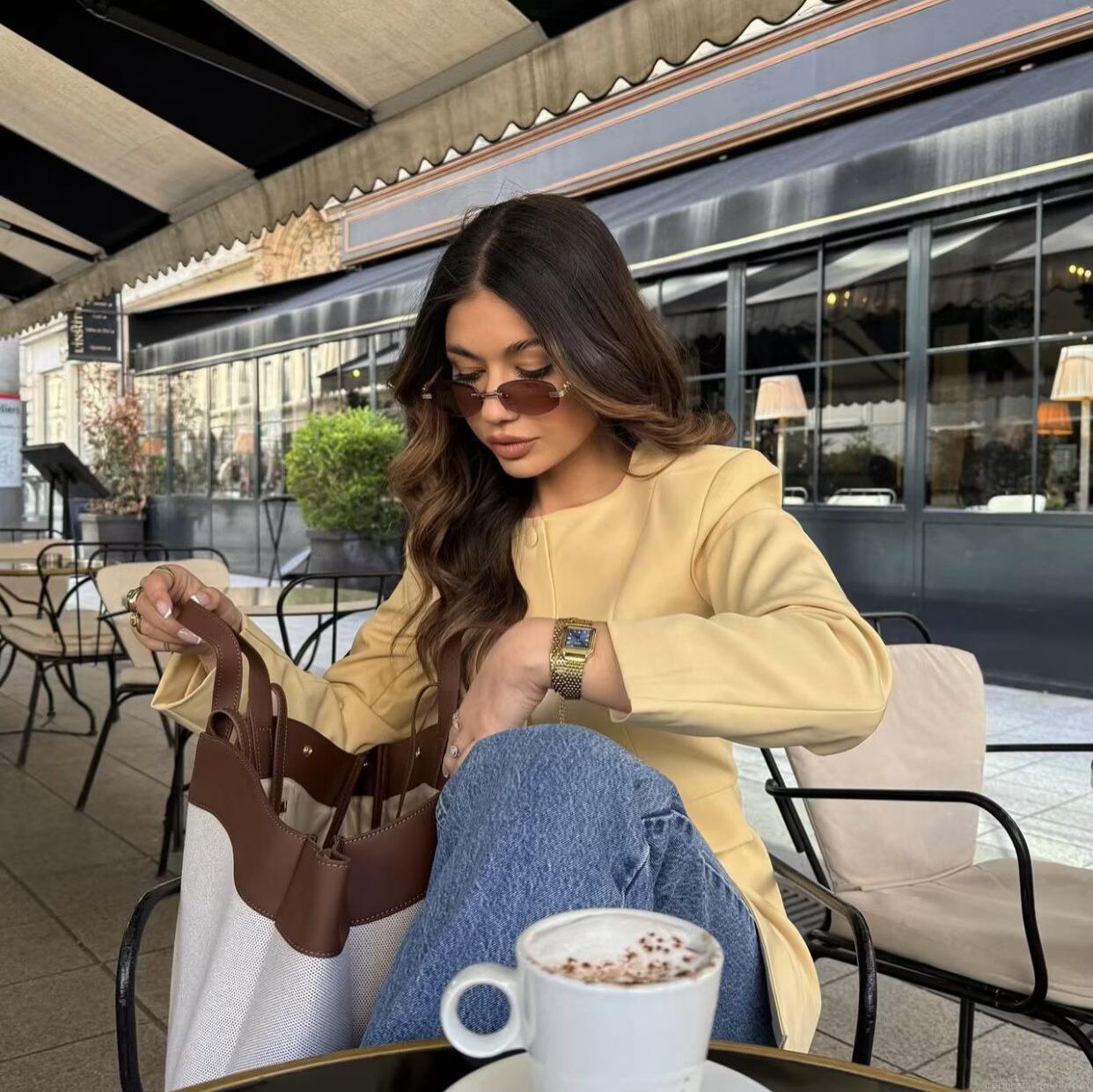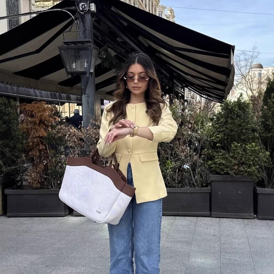 • Women's Intellectual Elegant Round Neck Blazer Jacket Single Breasted Polyester Outerwear For Office Commute Ladies Slim Fit Coat With Pocket Flaps Pale Yellow