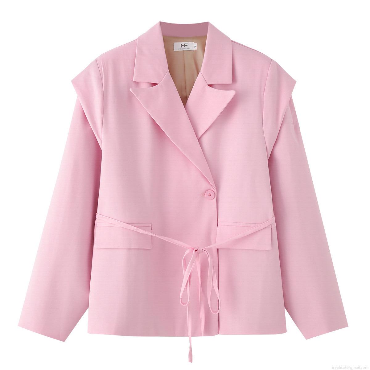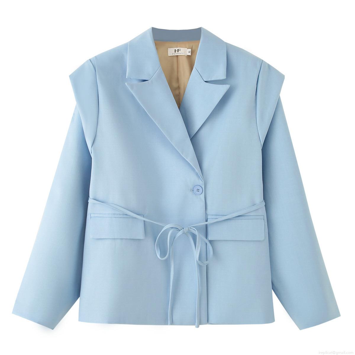 • Women's Long Sleeve Lapel Blazer Outerwear Polyester Twill Solid Color With Waist Tie Pocket Loose Fit Casual Office Lady Suit Jacket