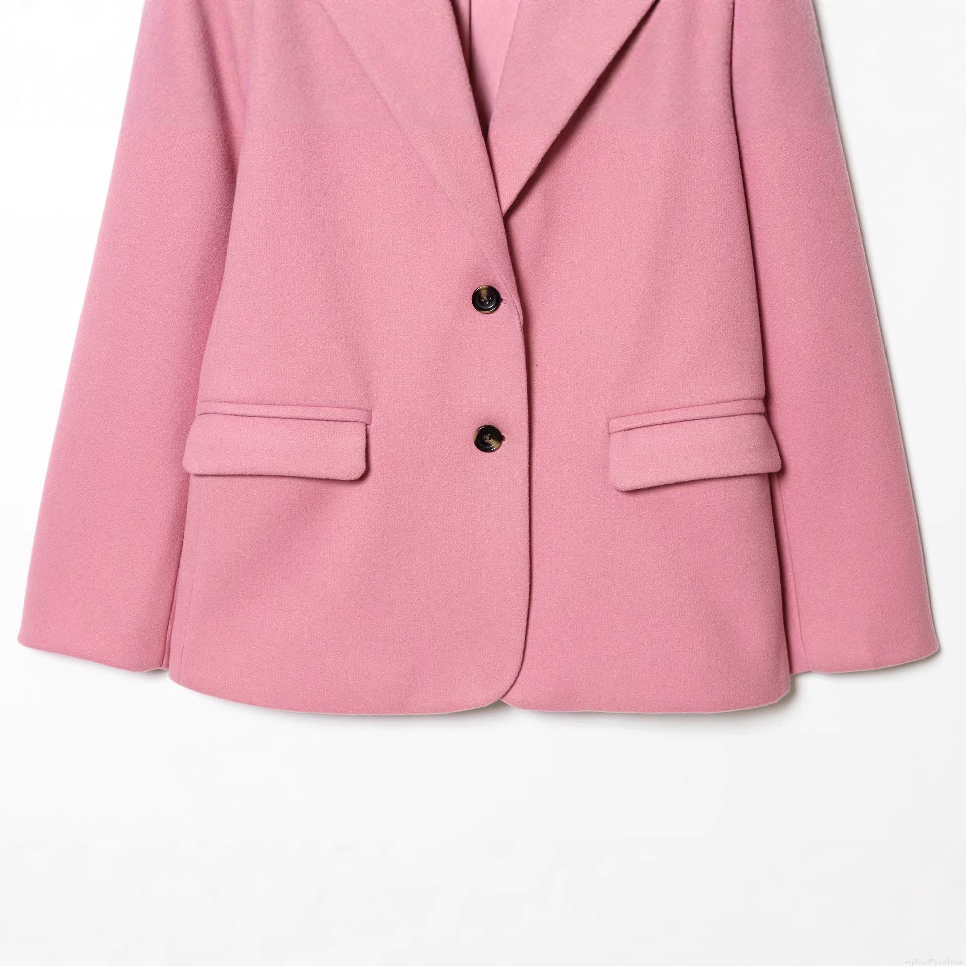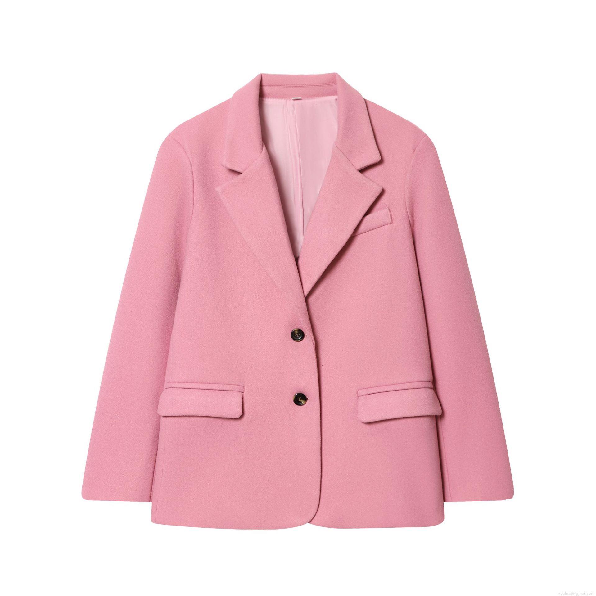 Women's Pink Blazer Jacket Woolen Blend Lapel Long Sleeve Two Button Coat For Office Daily Streetwear Chic Outerwear With Pockets