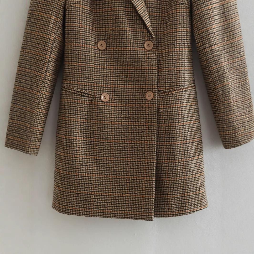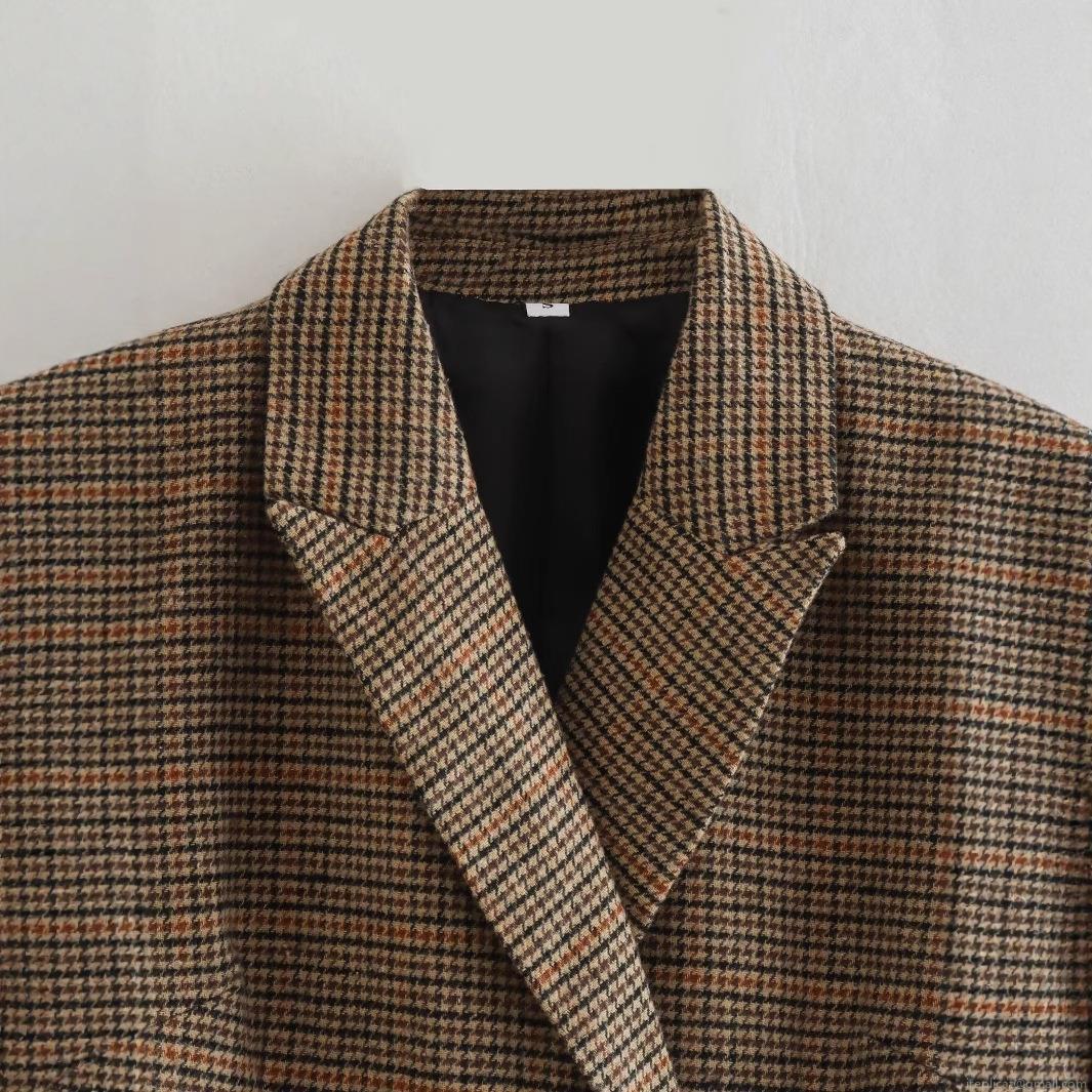 • Women's Retro Houndstooth Plaid Double Breasted Blazer Jacket Mid-Length Loose Fit Polyester Casual Suit Coat Streetwear
