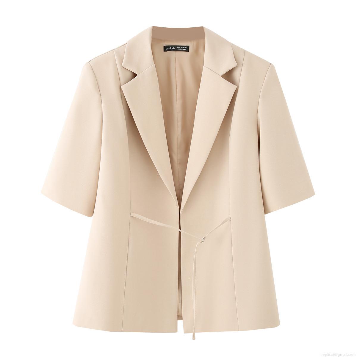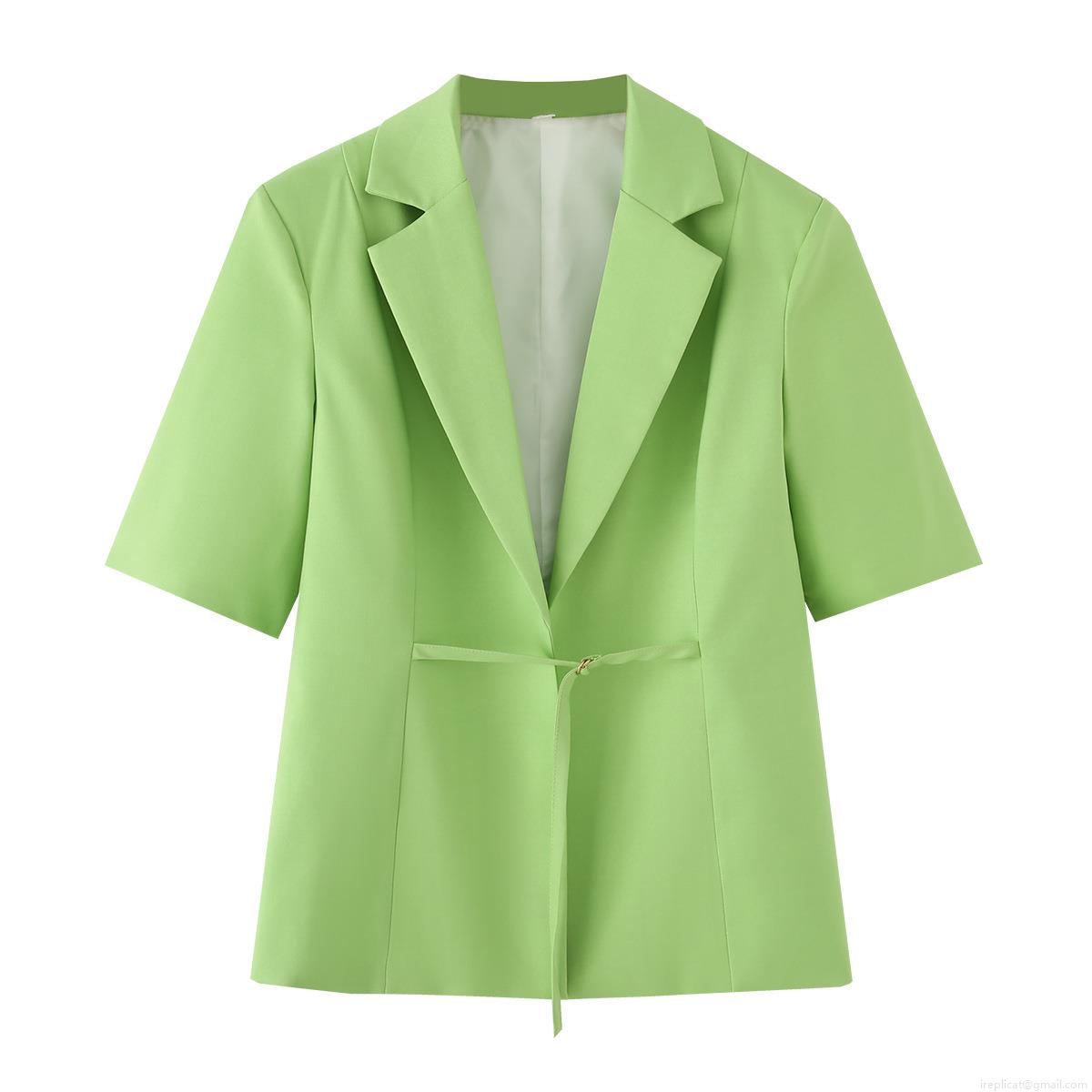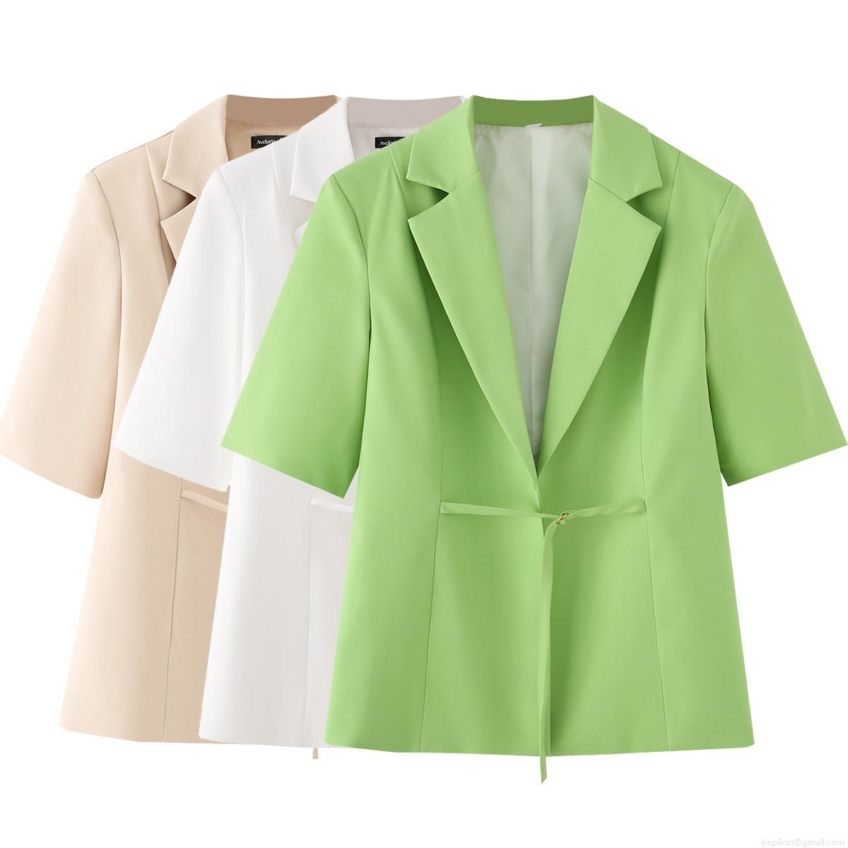 Women's Short Sleeve Blazer Jacket Polyester Slim Fit Belted Waist Suit Lapel Office Lady Solid Color Fashion Outerwear