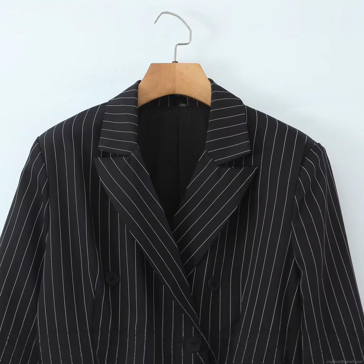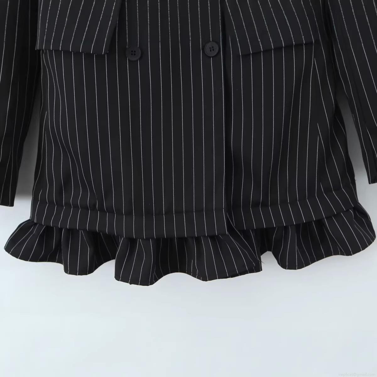 • Women's Vertical Stripe Blazer Jacket Ruffle Hem Double Breasted Peaked Lapel Long Sleeve Polyester Coat For Office Lady Workwear Daily Casual Fashion