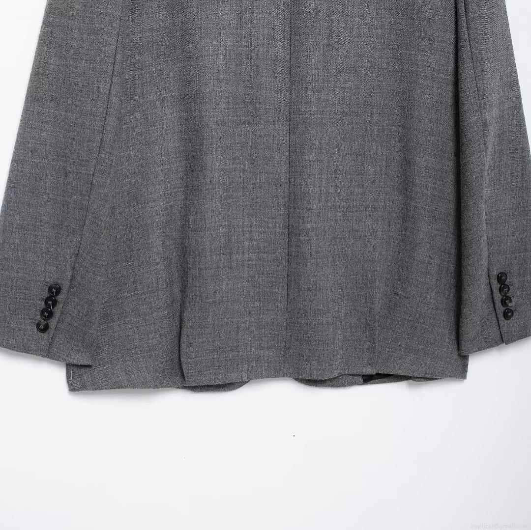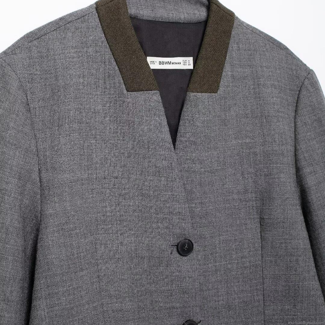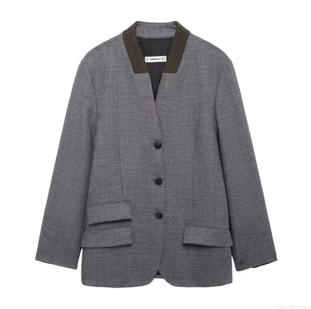 Women's Vintage Grey Blazer Jacket With Contrast Brown Collar Loose Single Breasted Tweed Texture Commuter Suit Coat For Autumn Winter