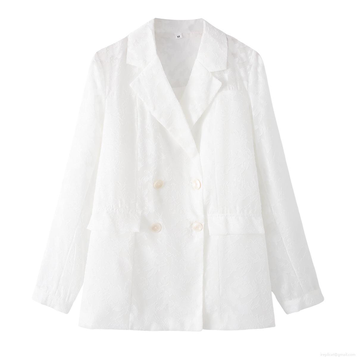Women's White Jacquard Chiffon Blazer Double Breasted Long Sleeve Lapel Semi Transparent Loose Streetwear Casual Outerwear Jacket For Summer Ladies