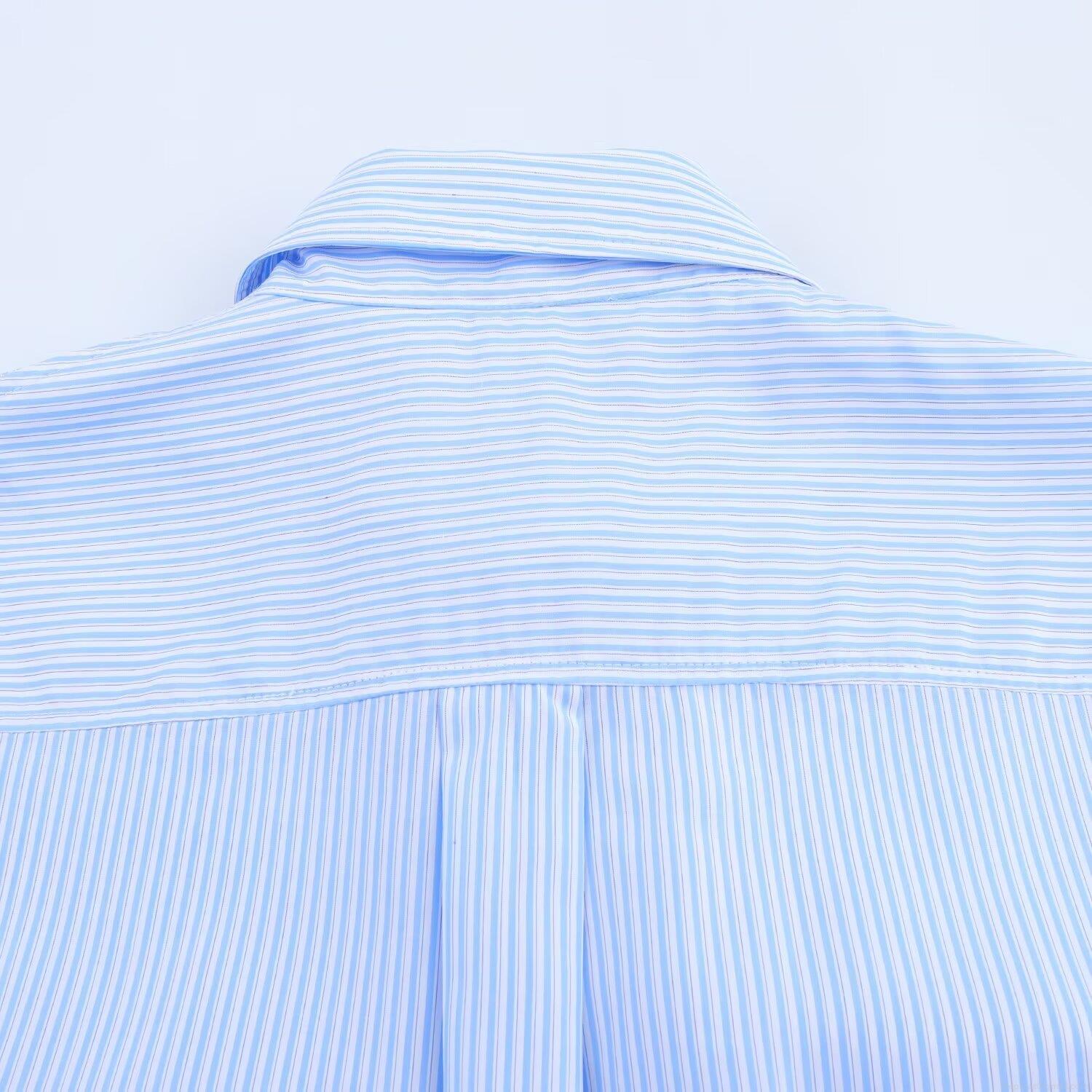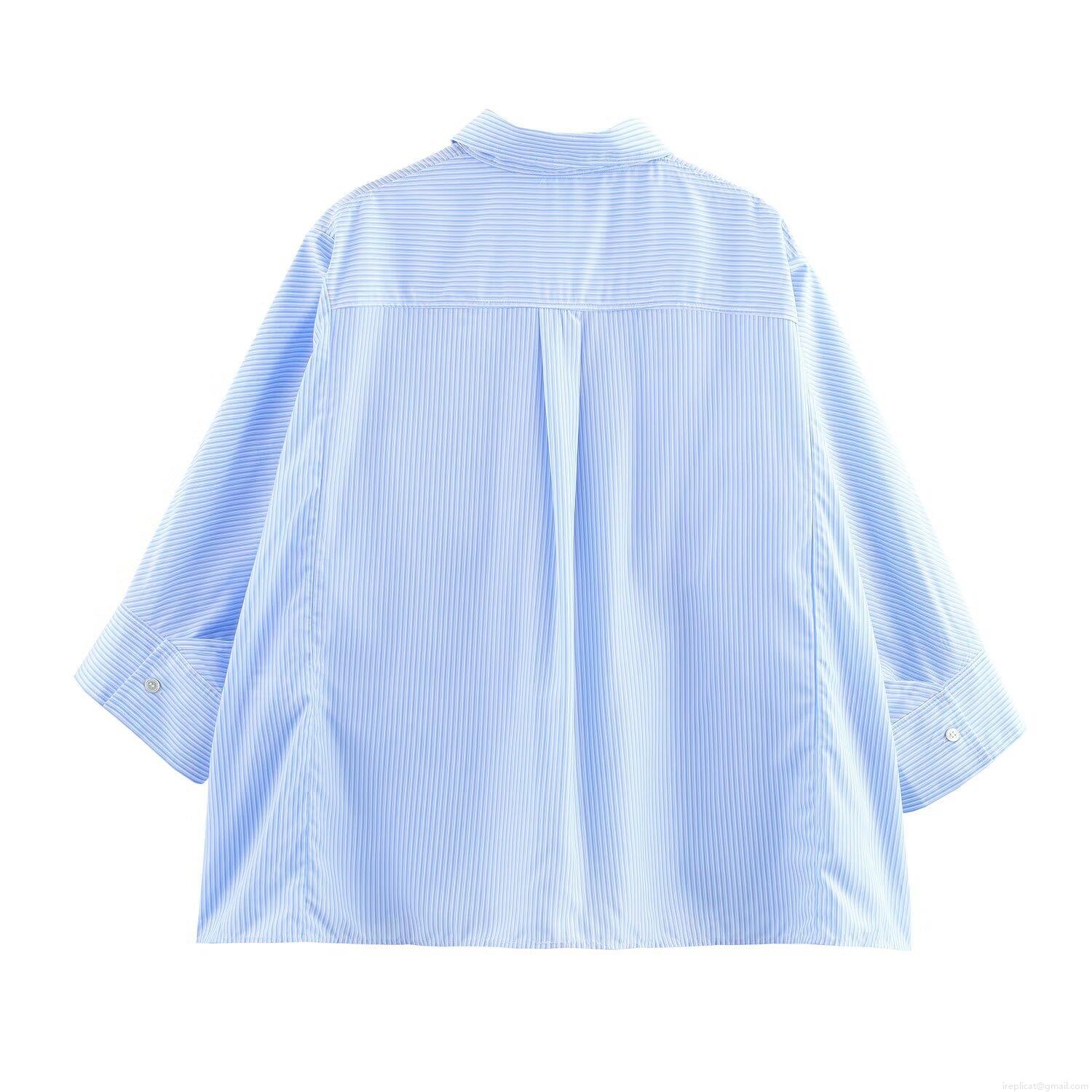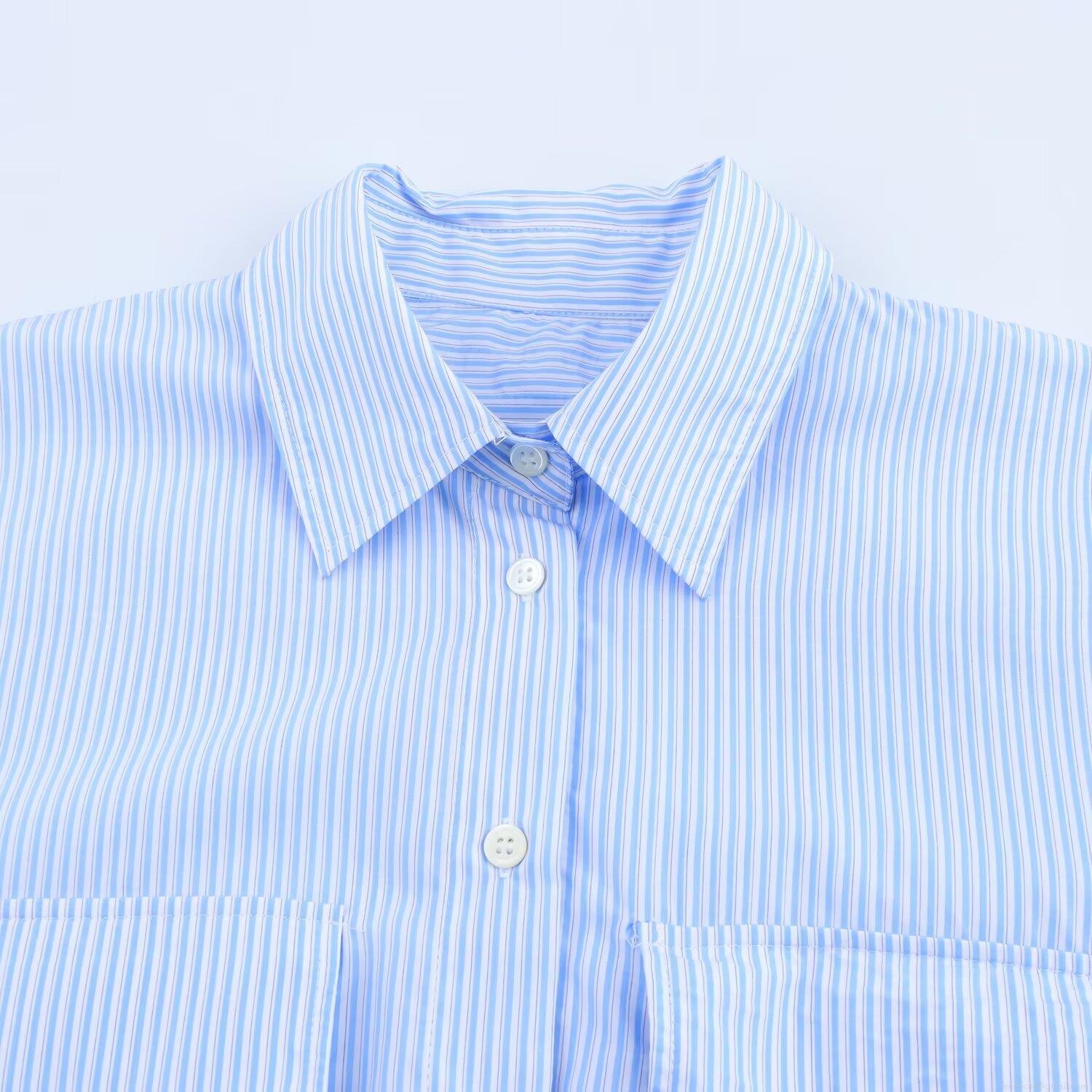 • Blue White Striped Long Sleeve Satin Shirt Women Oversized Loose Fit Office Blouse With Dual Pockets Single Breasted Casual Spring Fashion Top