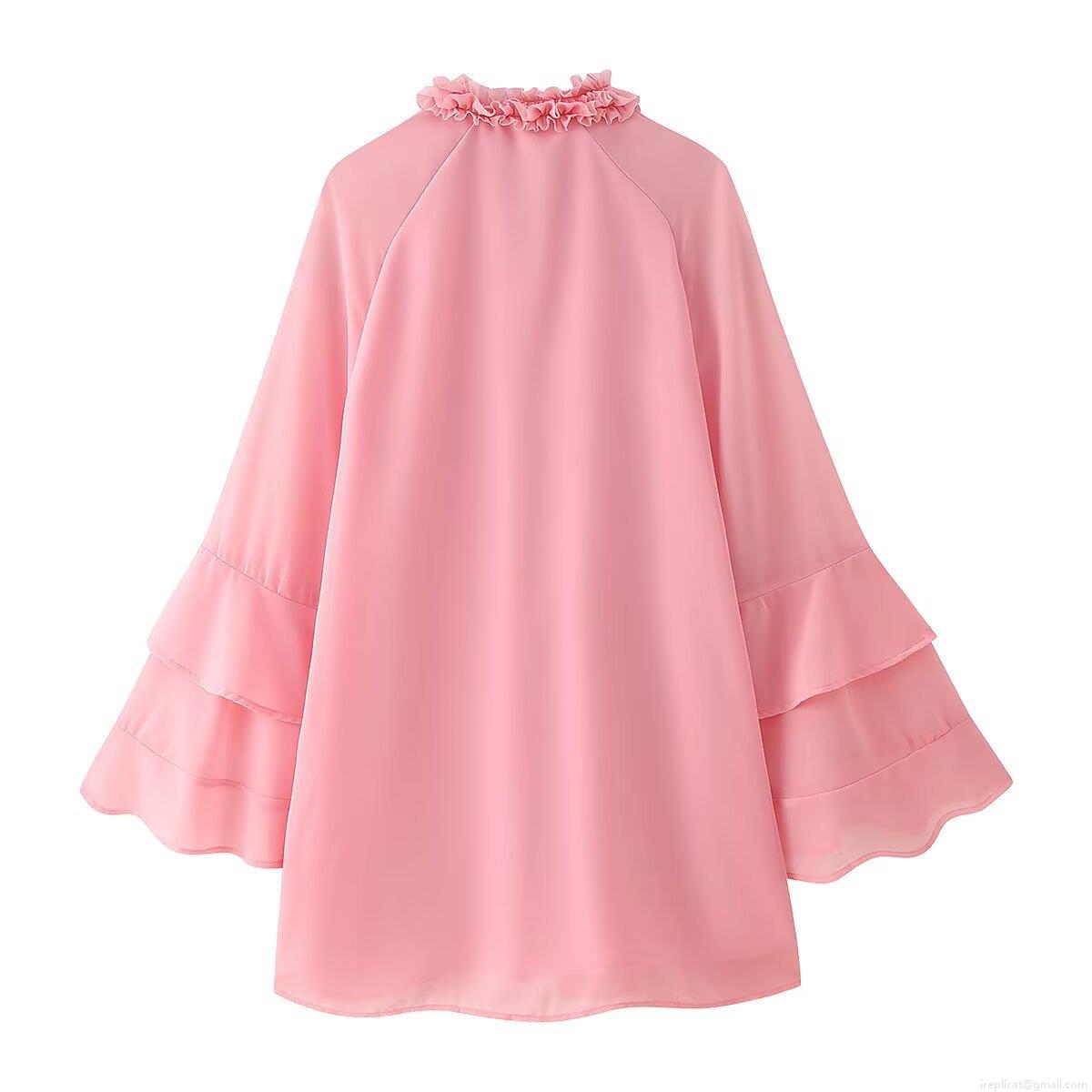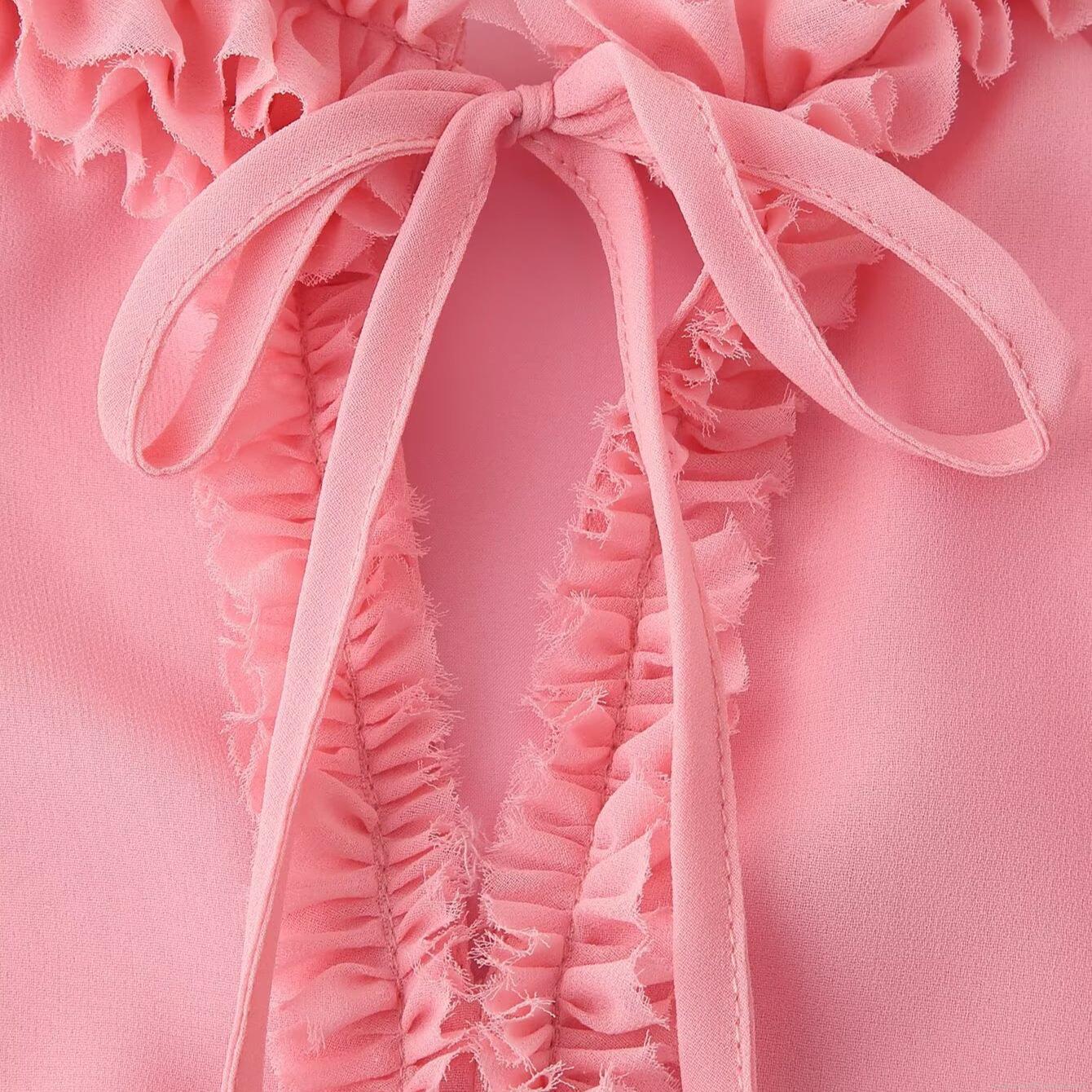 • Bohemian Ruffle Chiffon Blouse For Women Tiered Flared Sleeve Tie Neck Loose Fit Summer Tunic Top Elegant Vacation Shirt Solid Color Chic Apparel