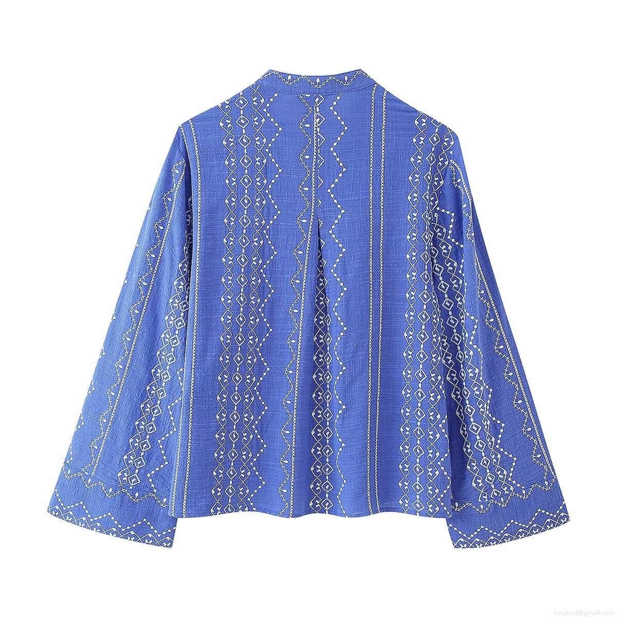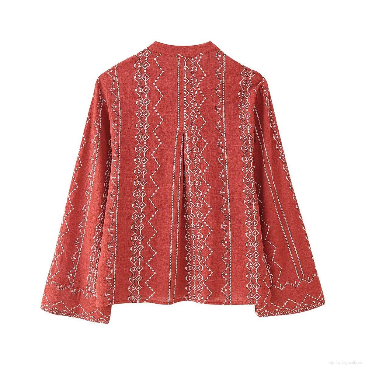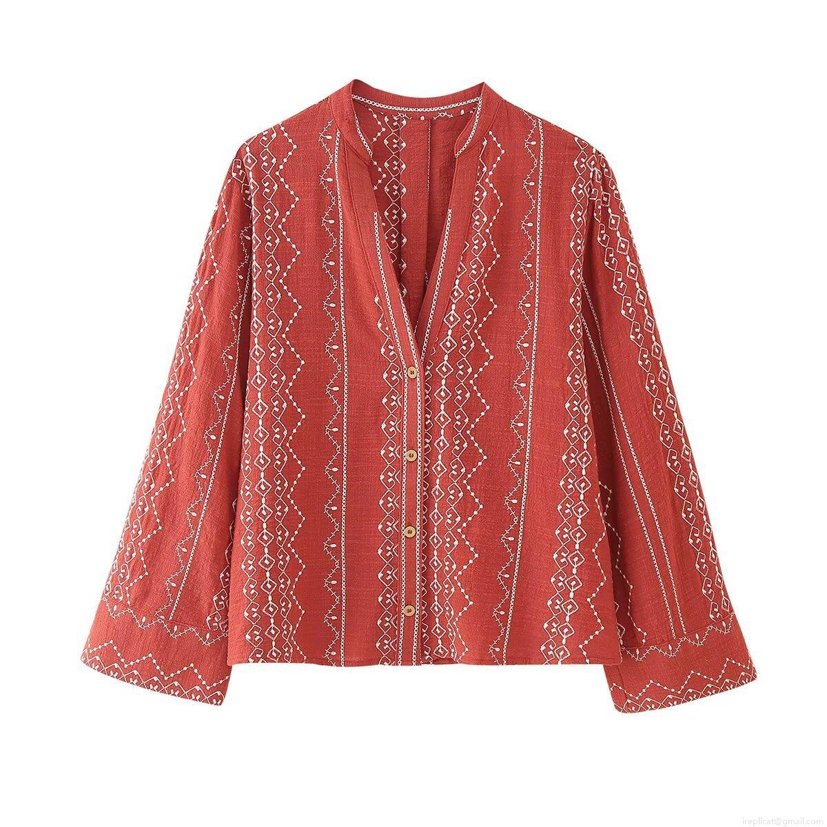 • Bohemian Women's Geometric Embroidery Blouse V-Neck Long Sleeve Shirt Casual Polyester Cotton-Linen Texture Tops With Wood Buttons Ethnic Style For Women
