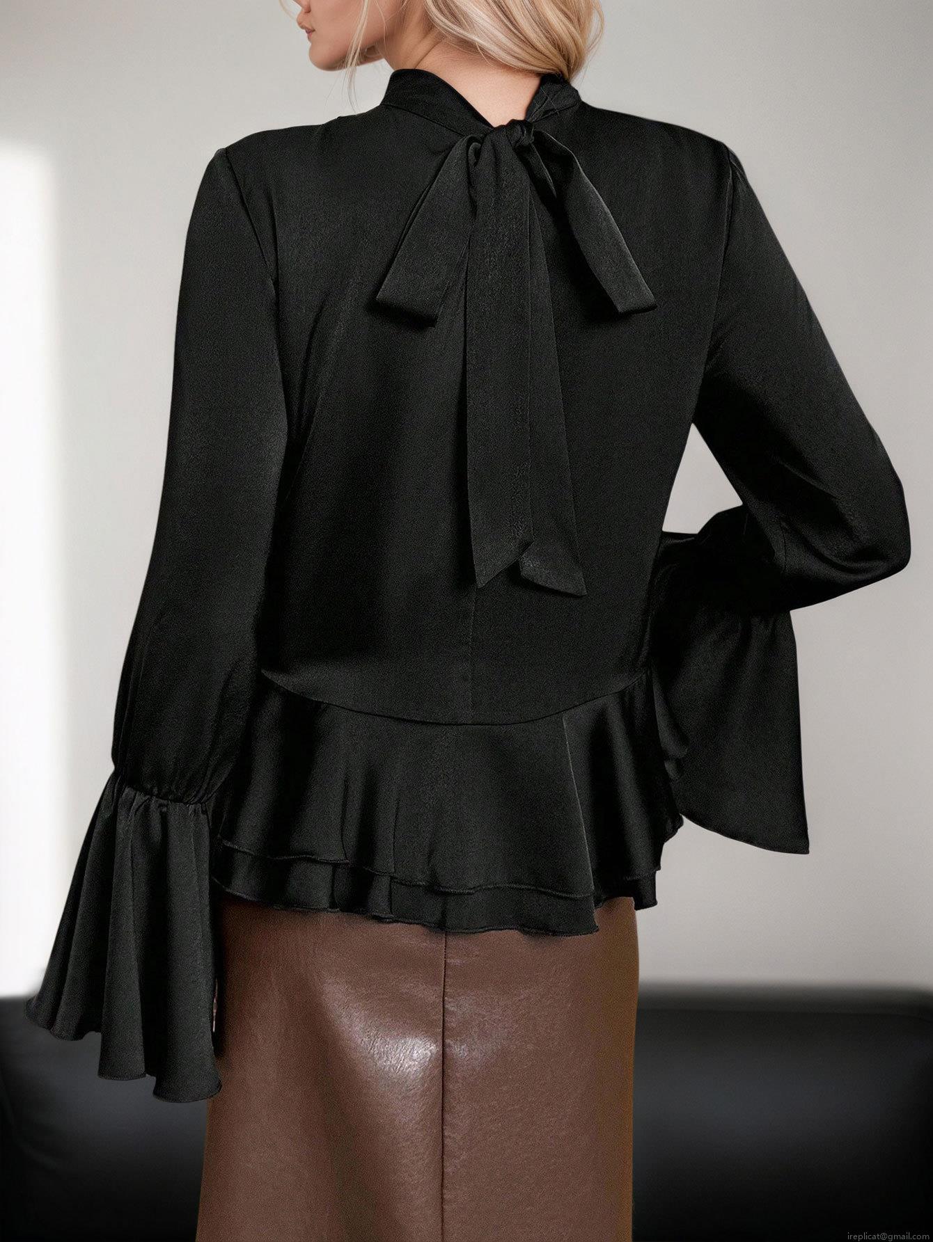 • Elegant 100% Polyester Satin Blouse for Women Ruffle Hem Flare Bell Sleeve Bow Tie Mock Neck Top Casual Office Party Wear