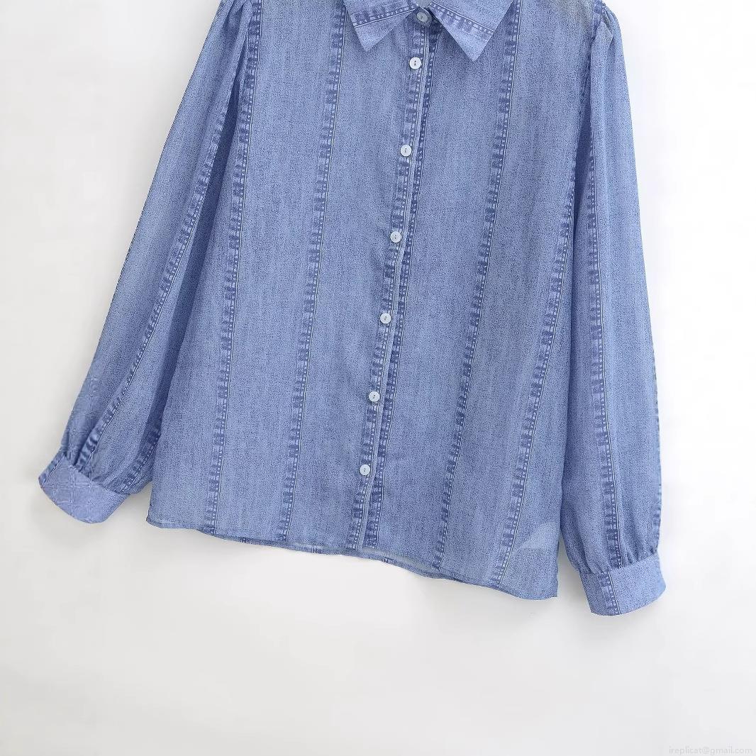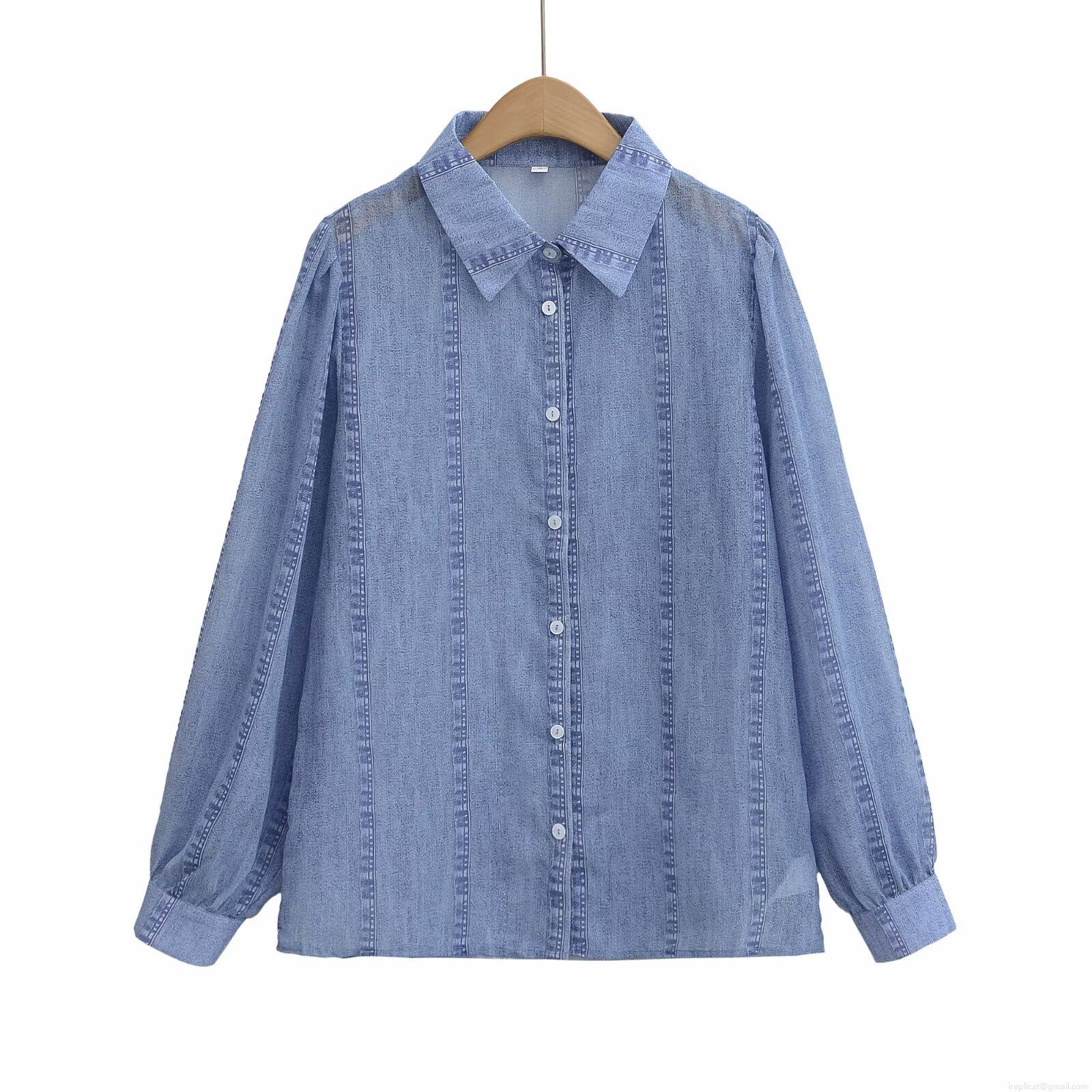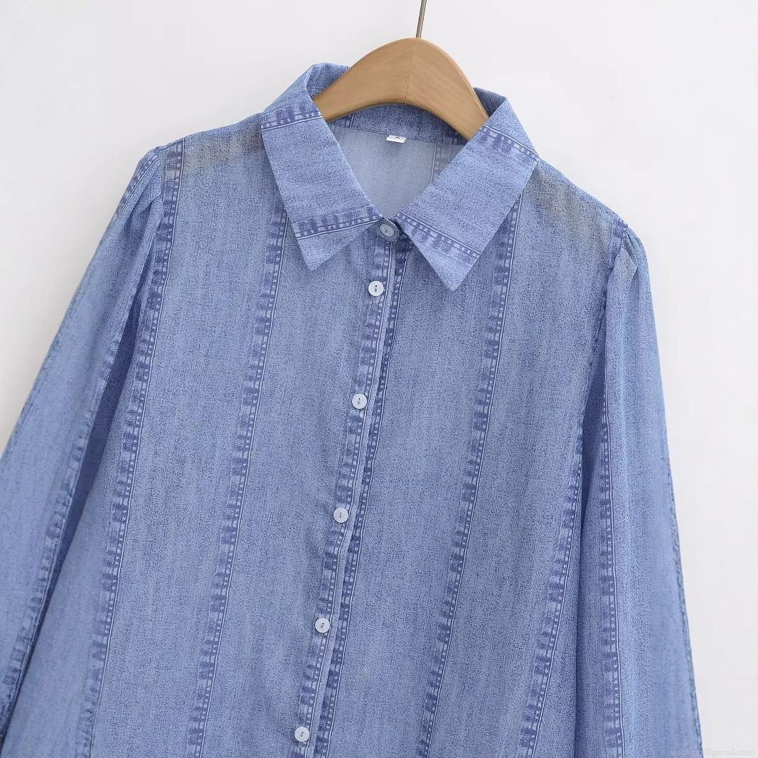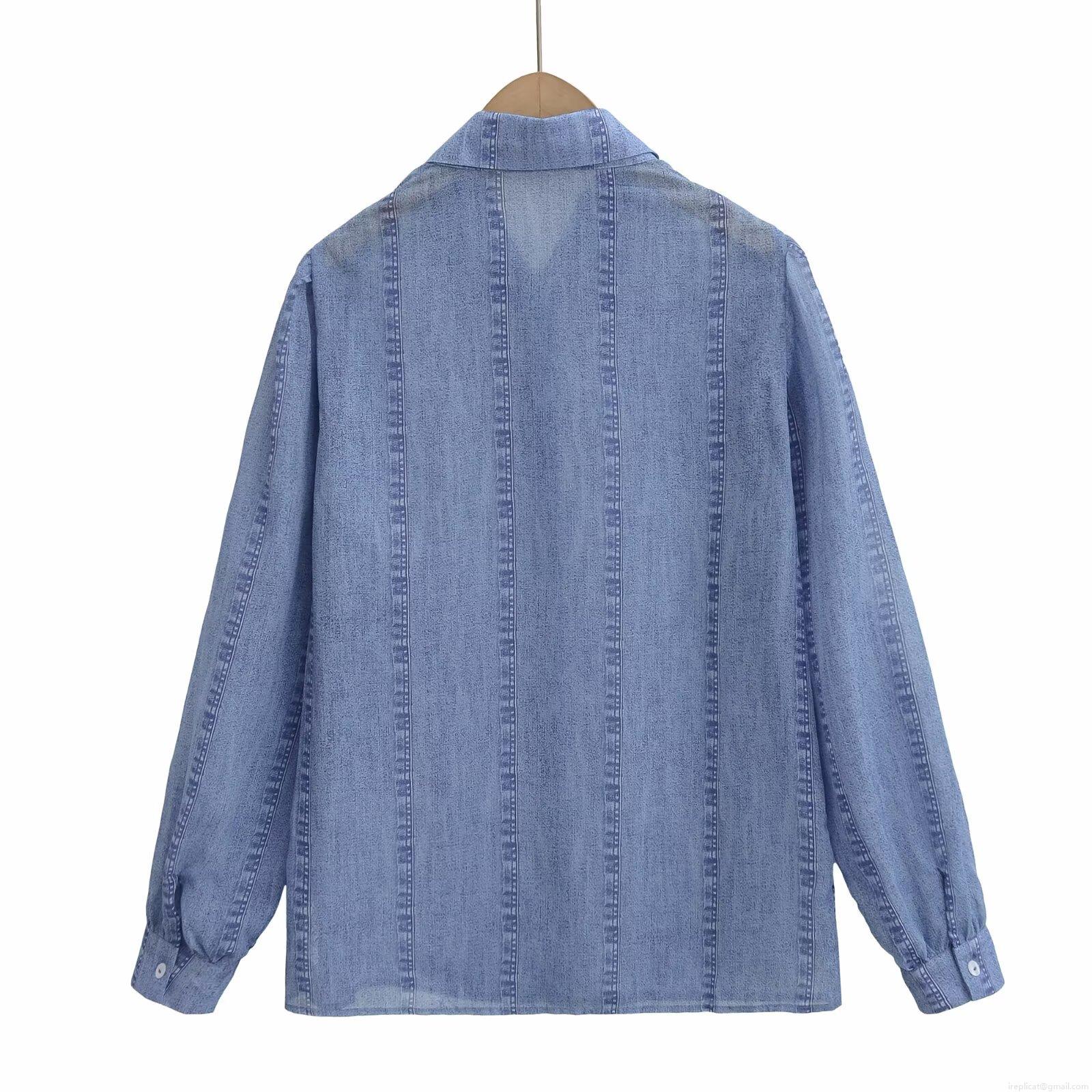 • Elegant Denim Print Long Sleeve Shirt Women Lapel Single Breasted Polyester Blouse Casual Commute Office Fashion Spring Tops