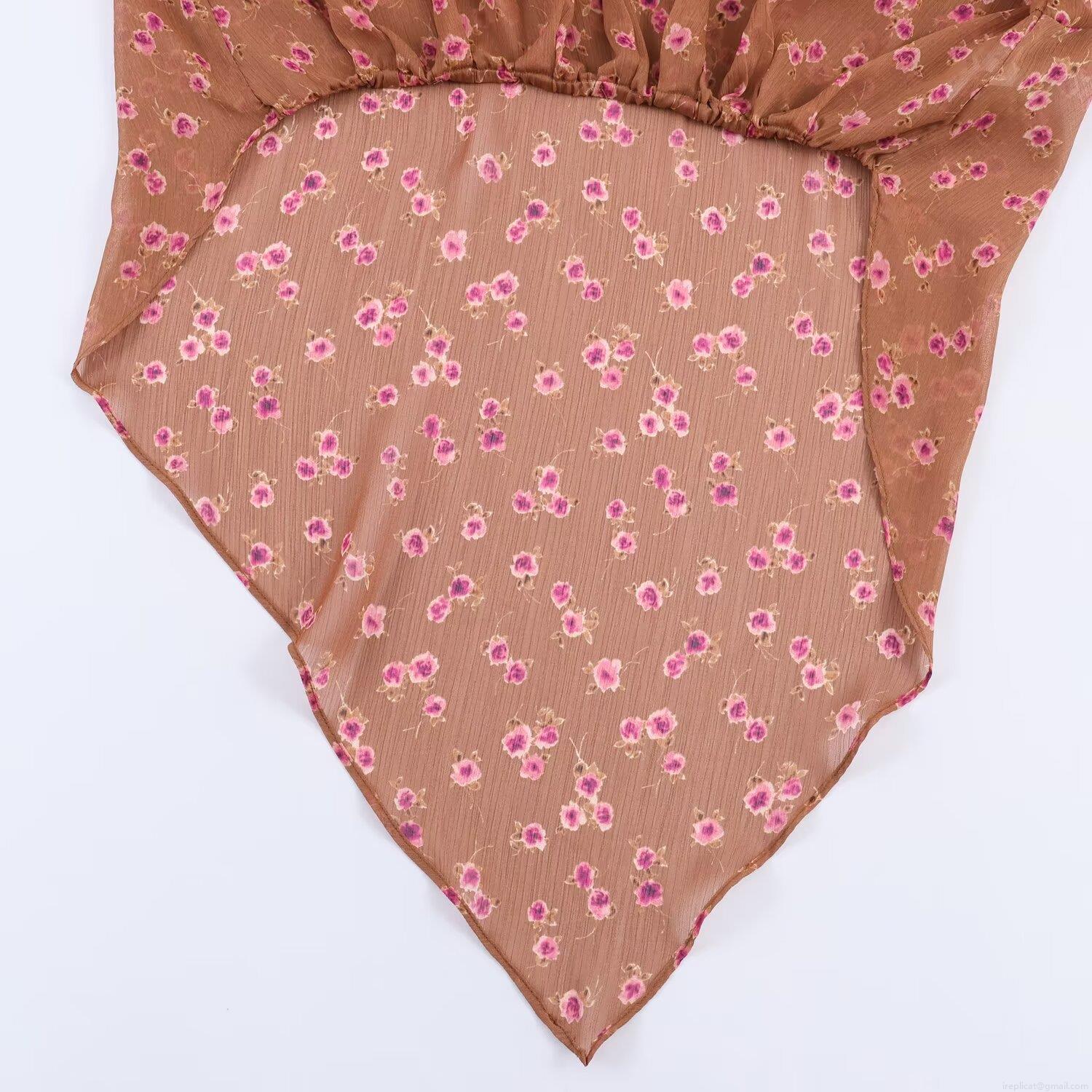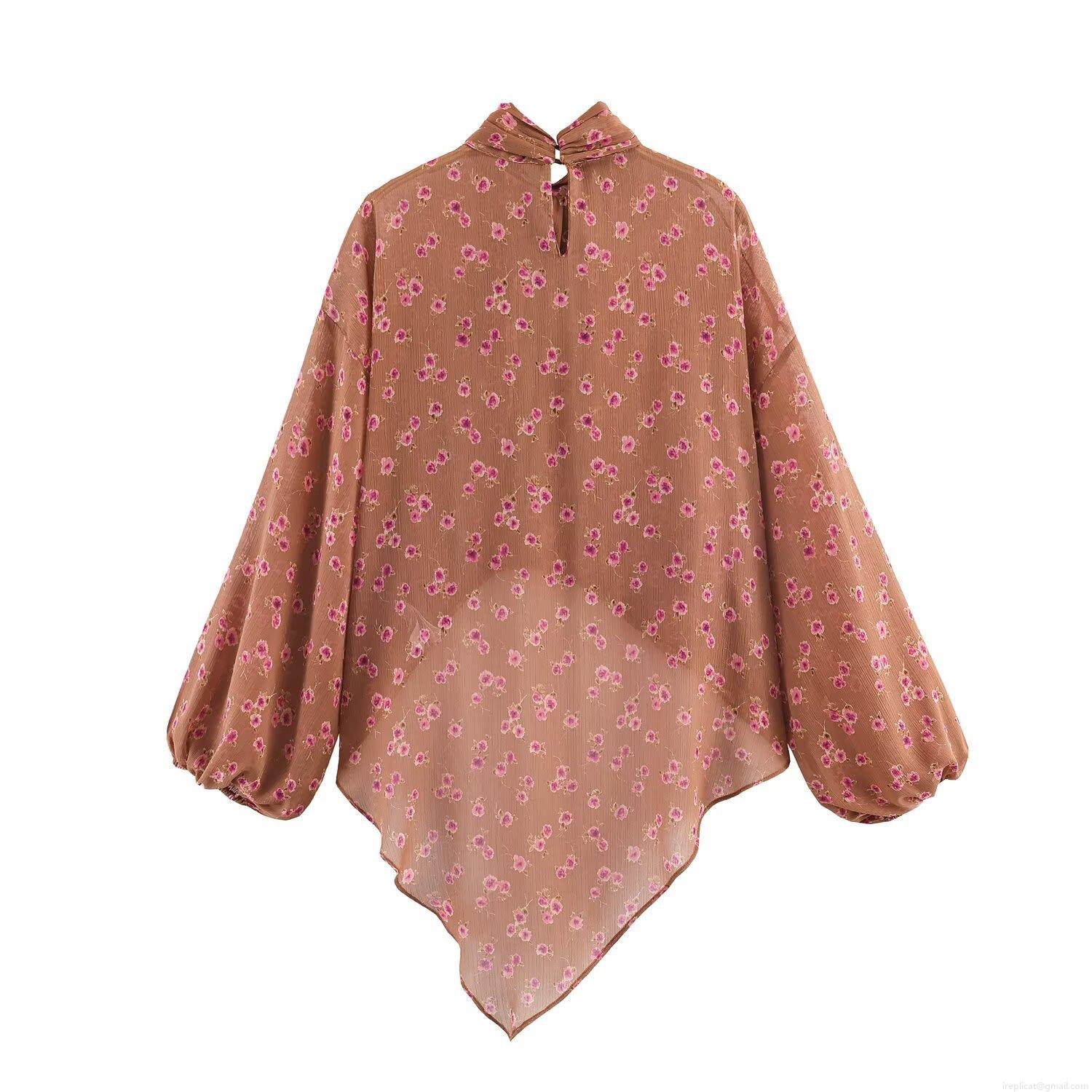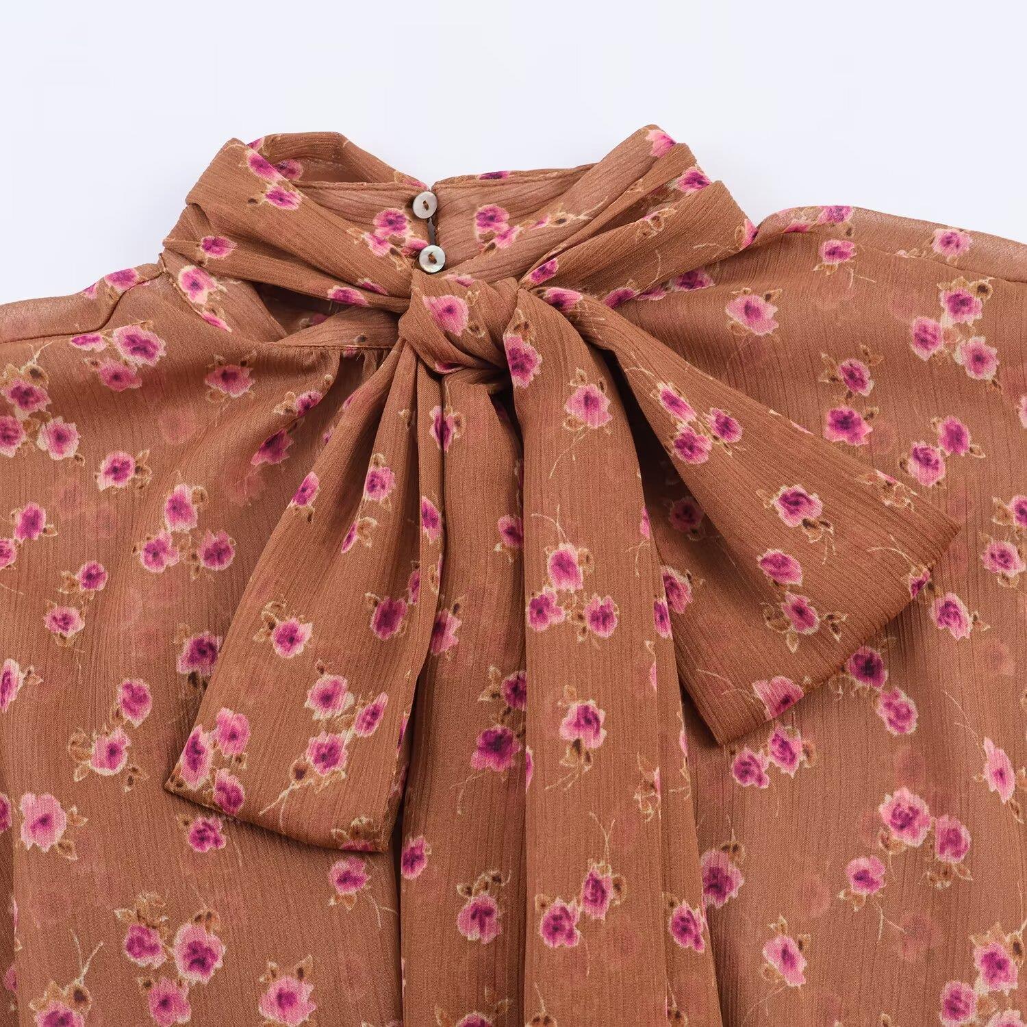 Elegant Floral Chiffon Blouse Women Retro Brown Pink Flower Print Bow Tie High Neck Long Lantern Sleeve Irregular Hem Pullover Shirt Tops