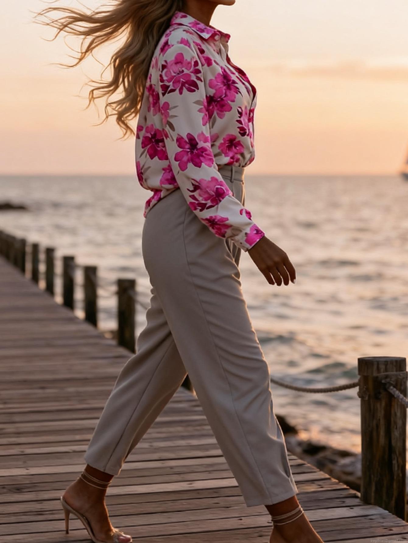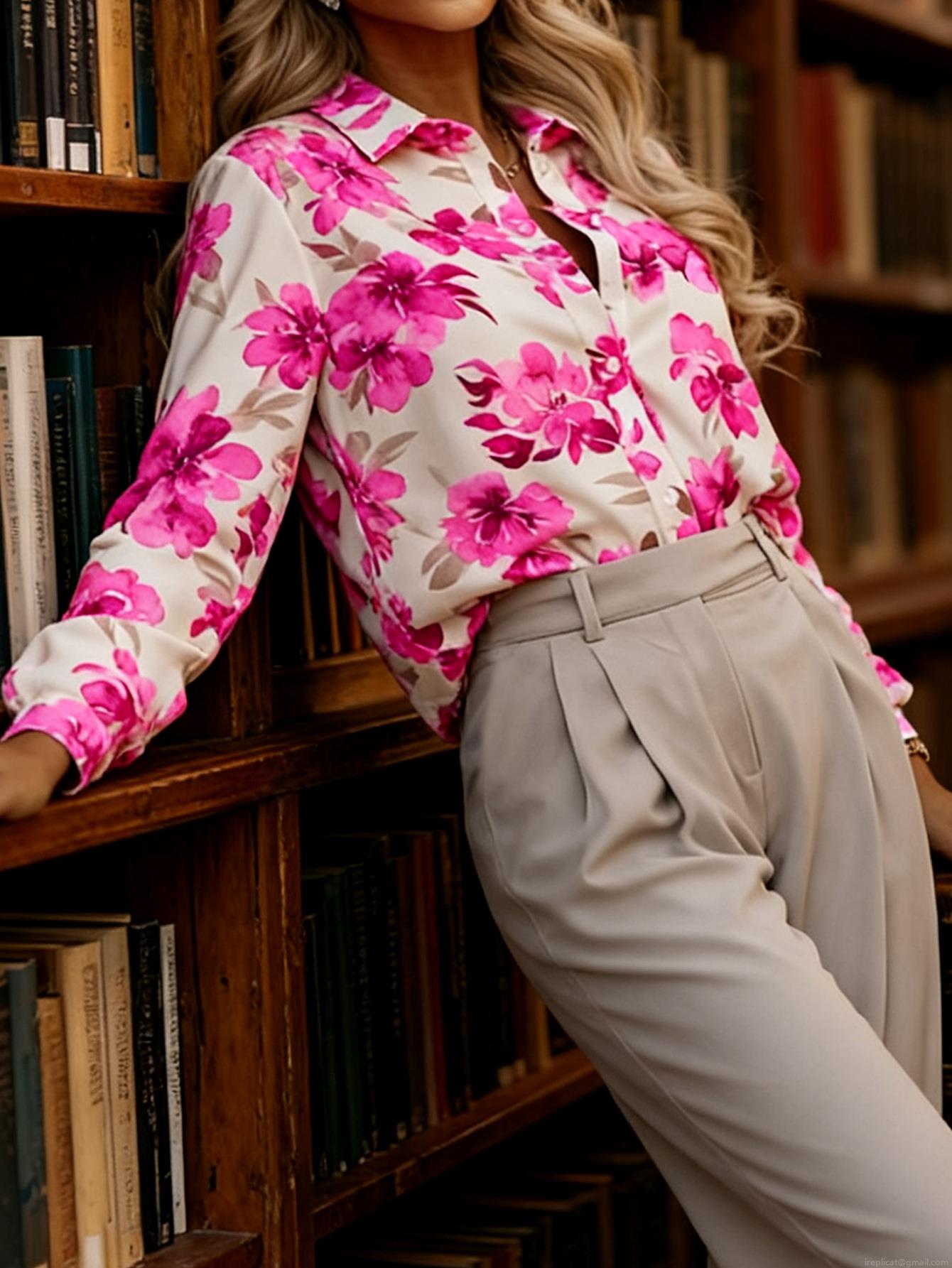 • Elegant Floral Print Long Sleeve Shirt Women's Polo Neck Button Down Polyester Blouse For Commuting Casual Office Wear Floral Pattern Top