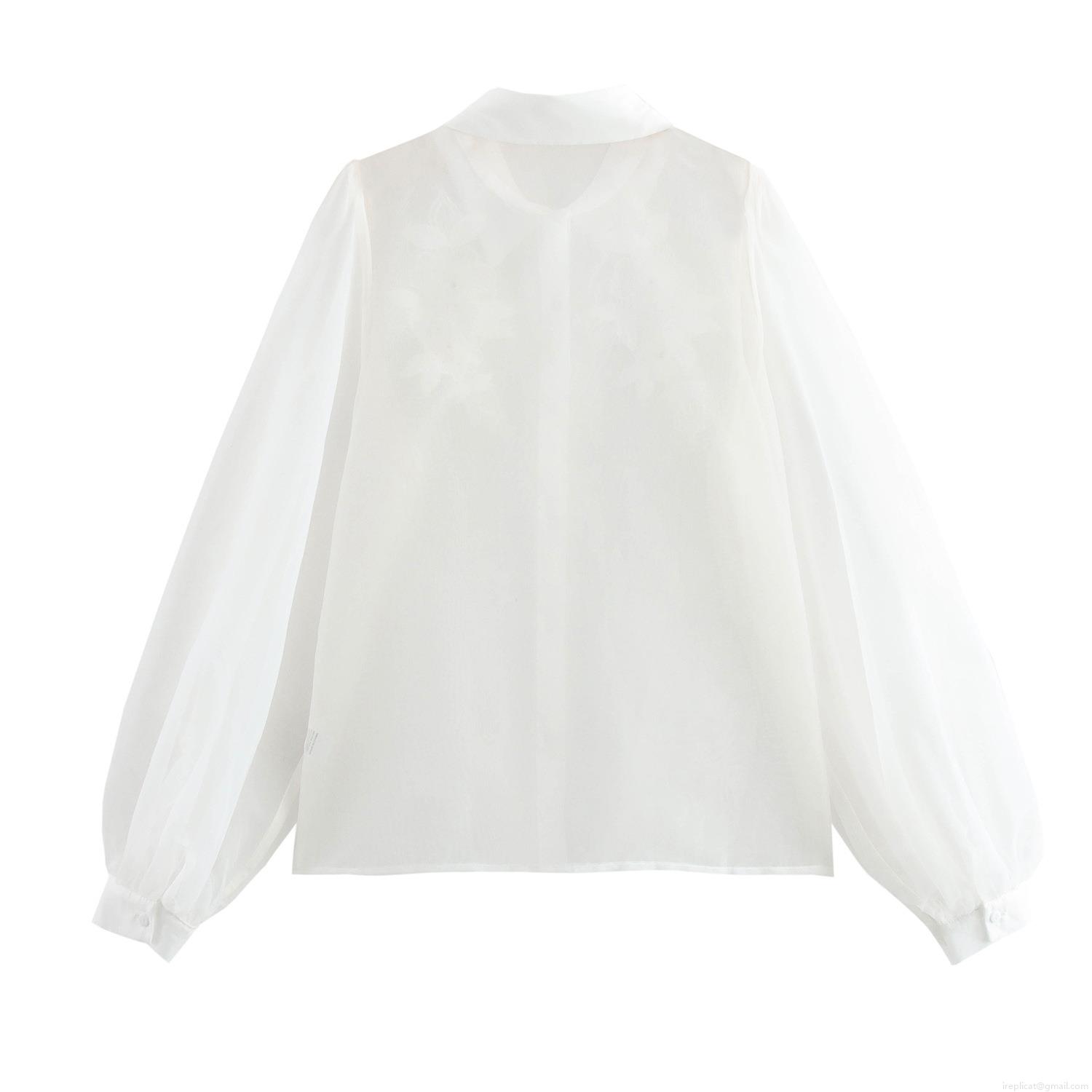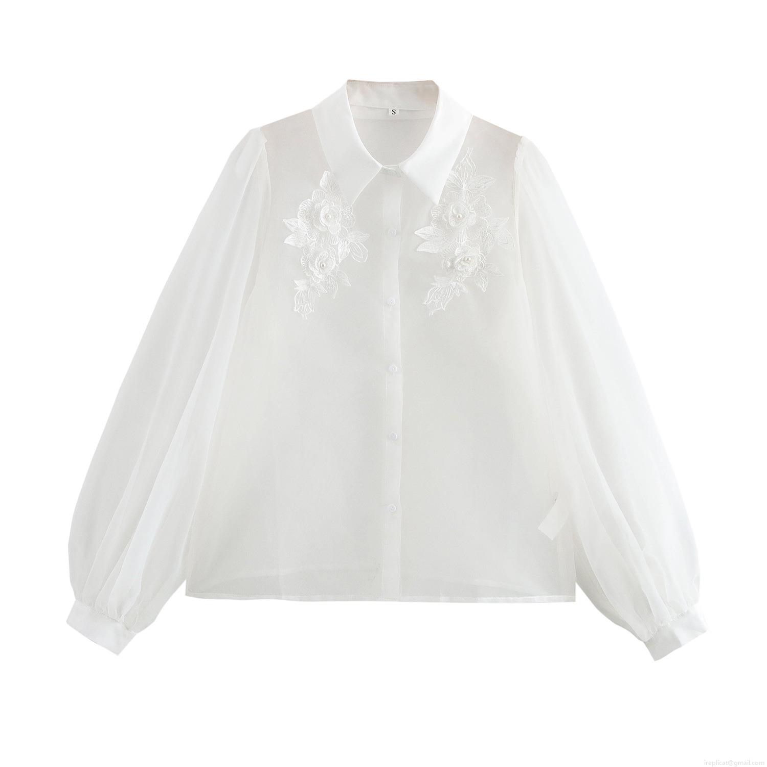 • Elegant French Vintage Organza Blouse Women's Sheer Mesh Floral Embroidery Top With Pearls Lantern Long Sleeve Turnover Collar Button Down Loose Shirt For Vacation