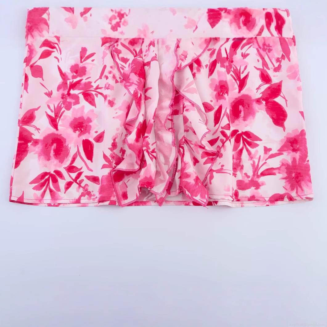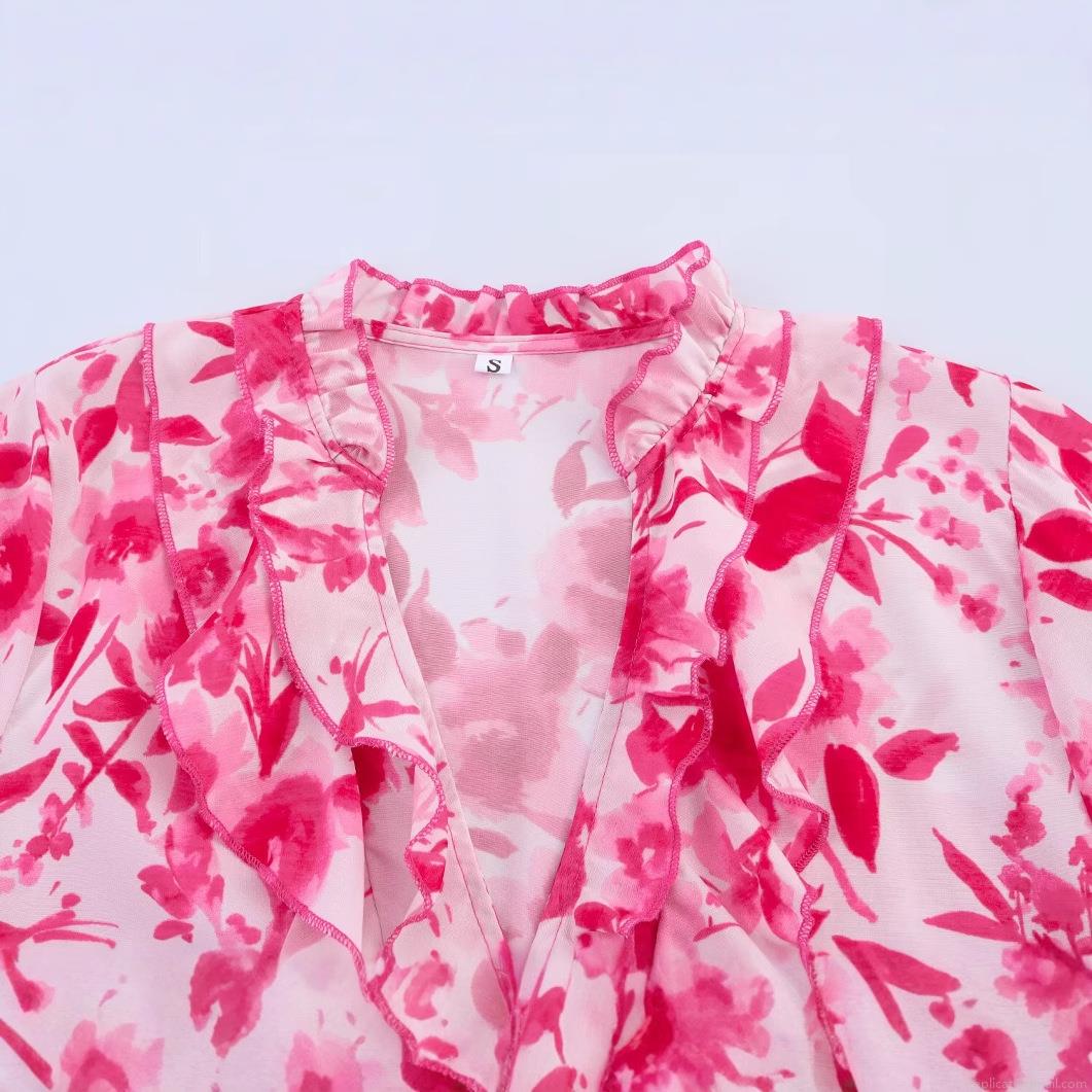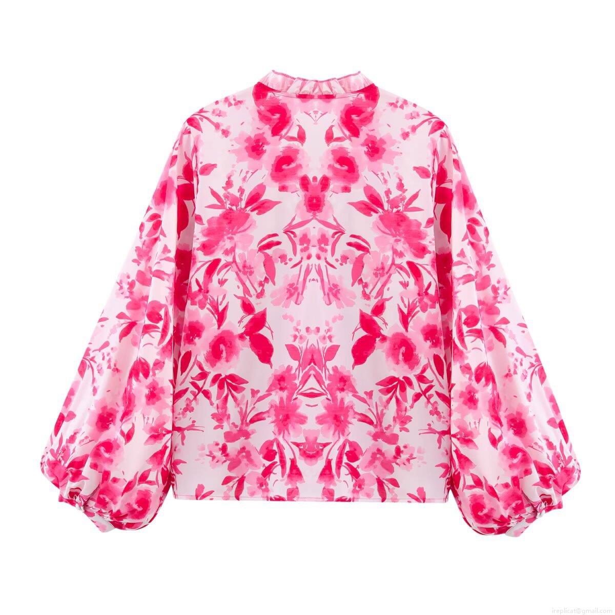 • Elegant Pink Floral Print Shirt Women's Layered Ruffle Stand Collar Long Puff Sleeve Blouse Casual Polyester Chiffon Tops For Dating Daily