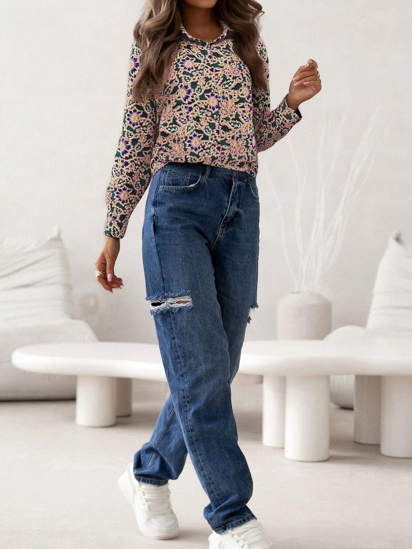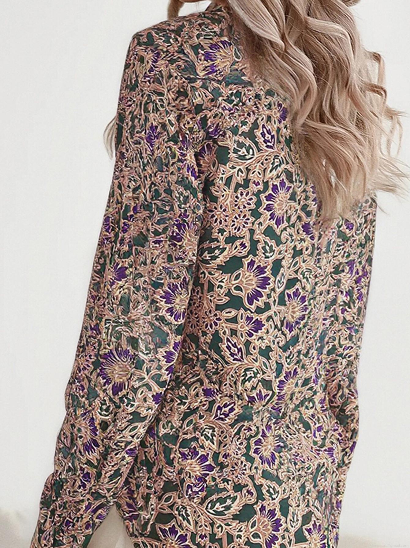 • Elegant Retro Floral Print Blouse For Women V Neck Single Breasted Long Sleeve Bohemian Polyester Shirt For Commuting Office Daily Wear