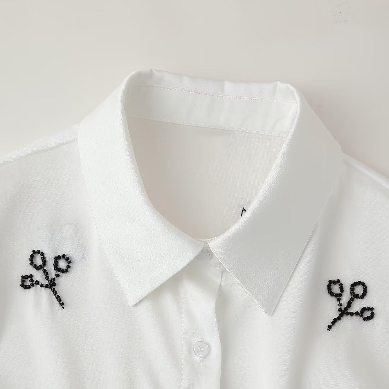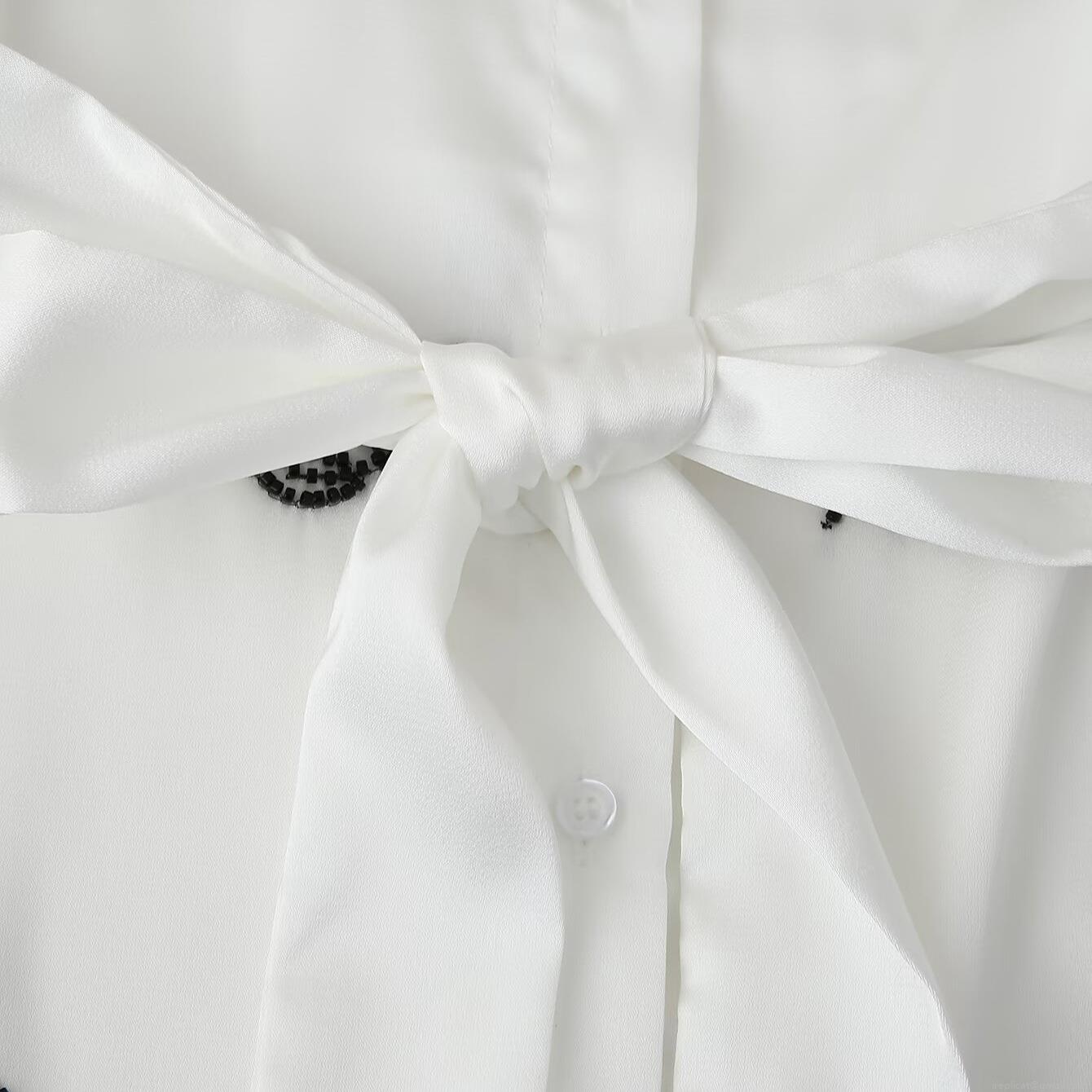 • Elegant White Beaded Leaf Pattern Blouse Women's Long Sleeve Lapel Waist Tie Shirt Office Commute Polyester Tops For Lady