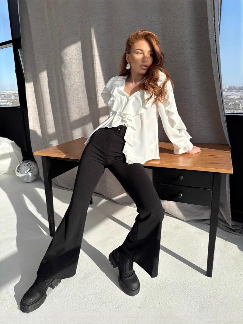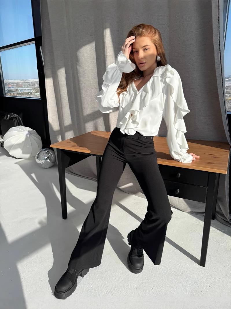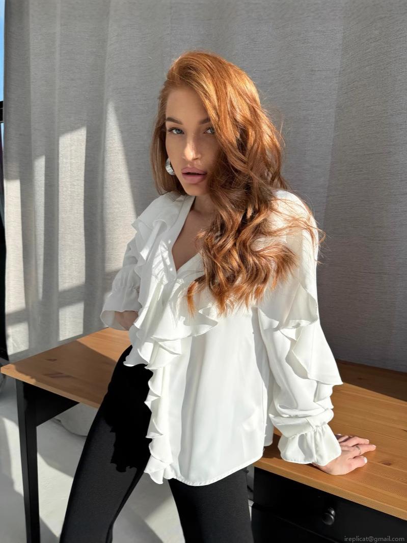 • Elegant White Chiffon Ruffle Blouse For Women V-Neck Long Sleeve Flare Cuff Shirt Stylish Office Commuting Daily Casual Loose Fit Pullover Top