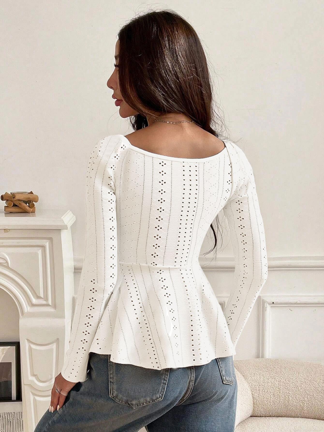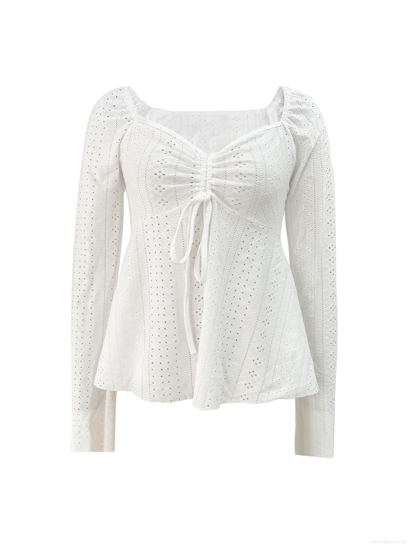 • Elegant White Eyelet Embroidery Long Sleeve Top For Women Slim Fit Drawstring U-Neck Peplum Blouse For Spring Autumn French Style Shirts