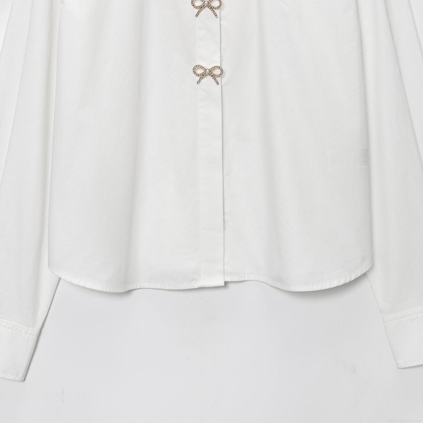 Elegant White Poplin Long Sleeve Blouse For Women With Rhinestone Bow Jewelry Buttons Office Commute Work Shirt Spring Autumn Fashion