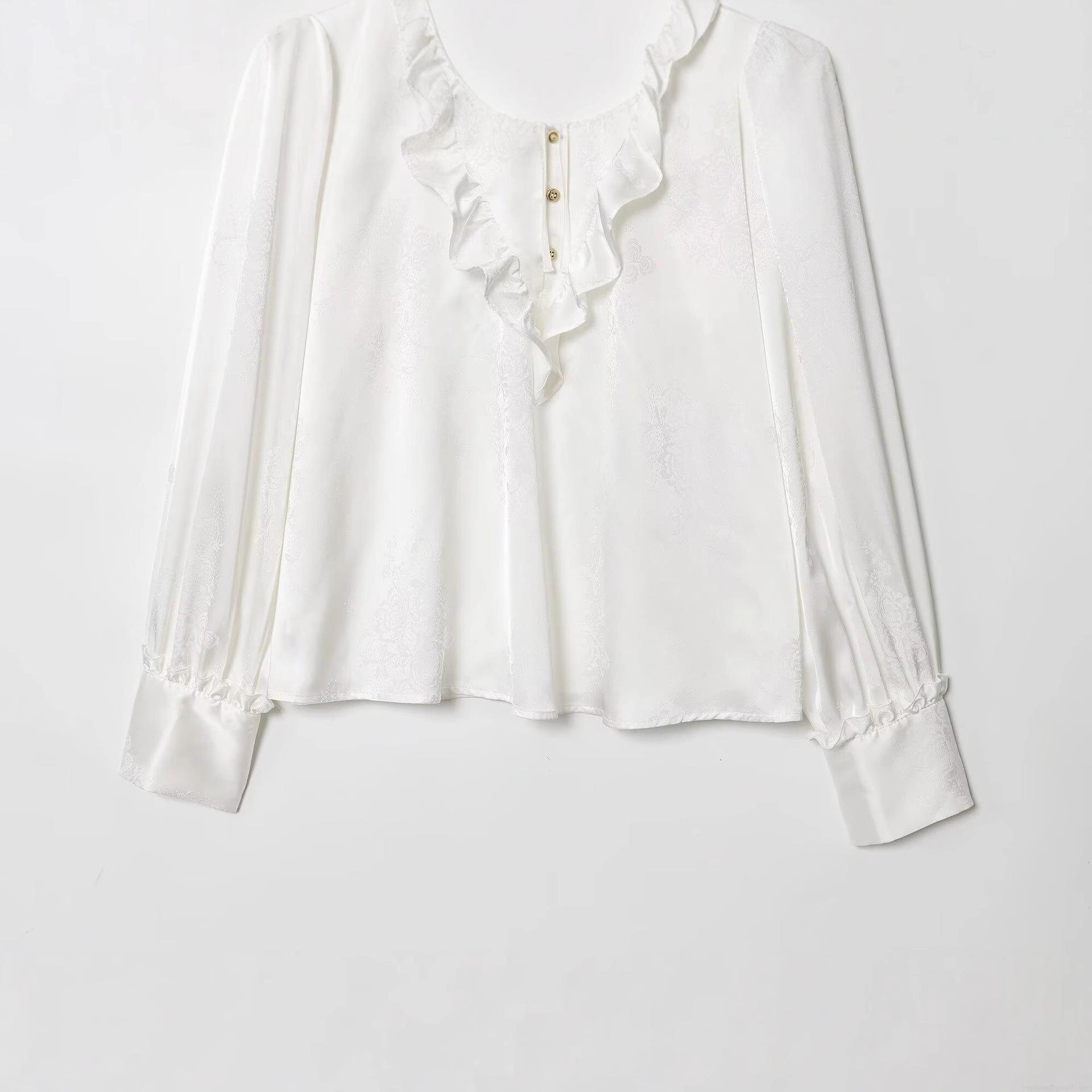 Elegant White Satin Jacquard Women Blouse With Ruffle Stand Collar Gold Buttons Long Sleeve Polyester Shirt Vintage Socialite Tops For Party Daily
