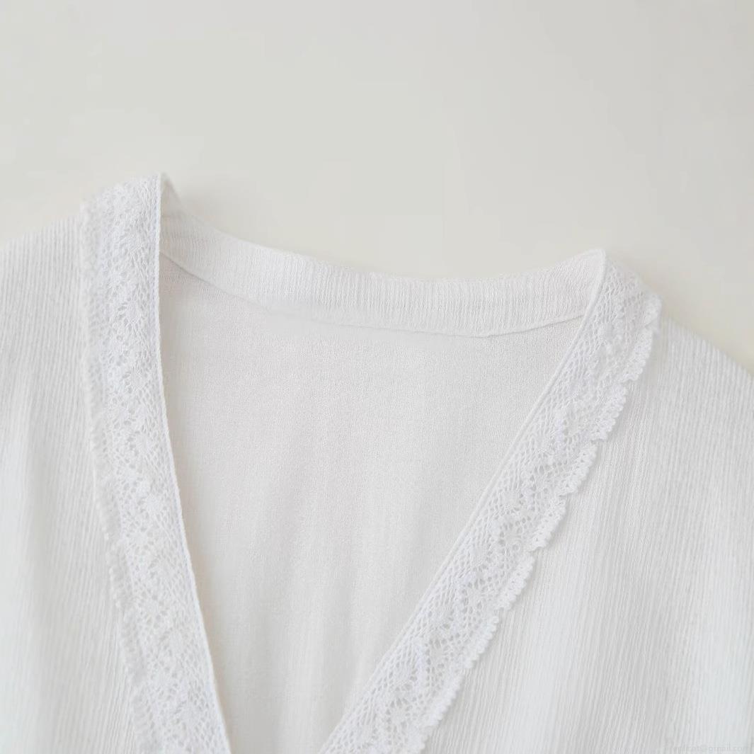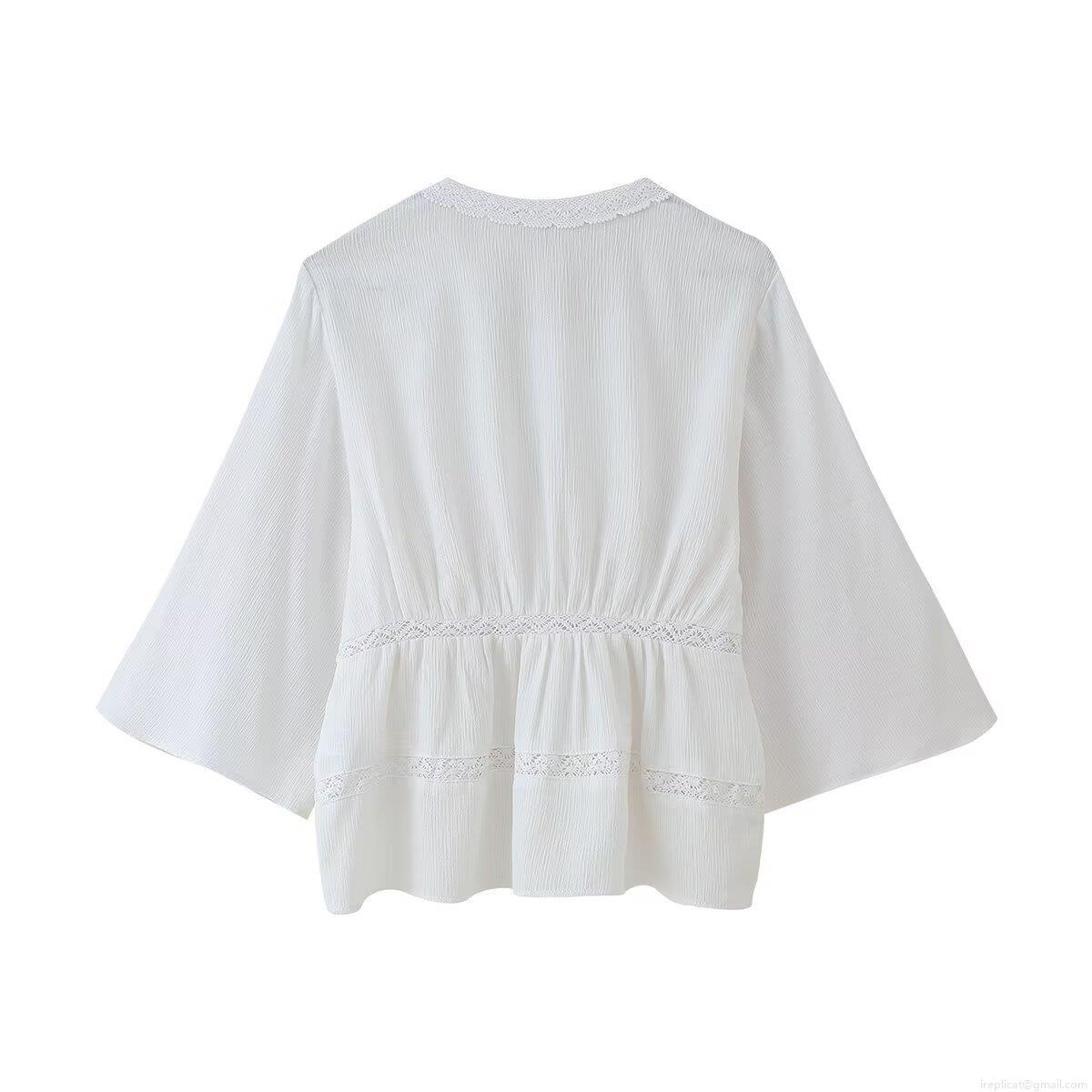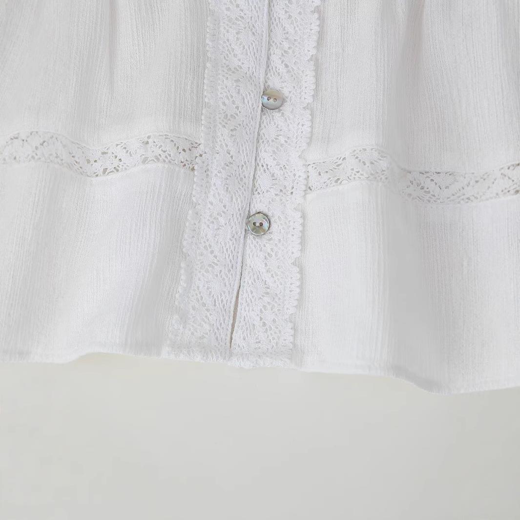 • Elegant White V-Neck Lace Blouse For Women Vintage Textured Long Flared Sleeve Button Up Shirt French Sweet Smocked Waist Tops For Party Daily