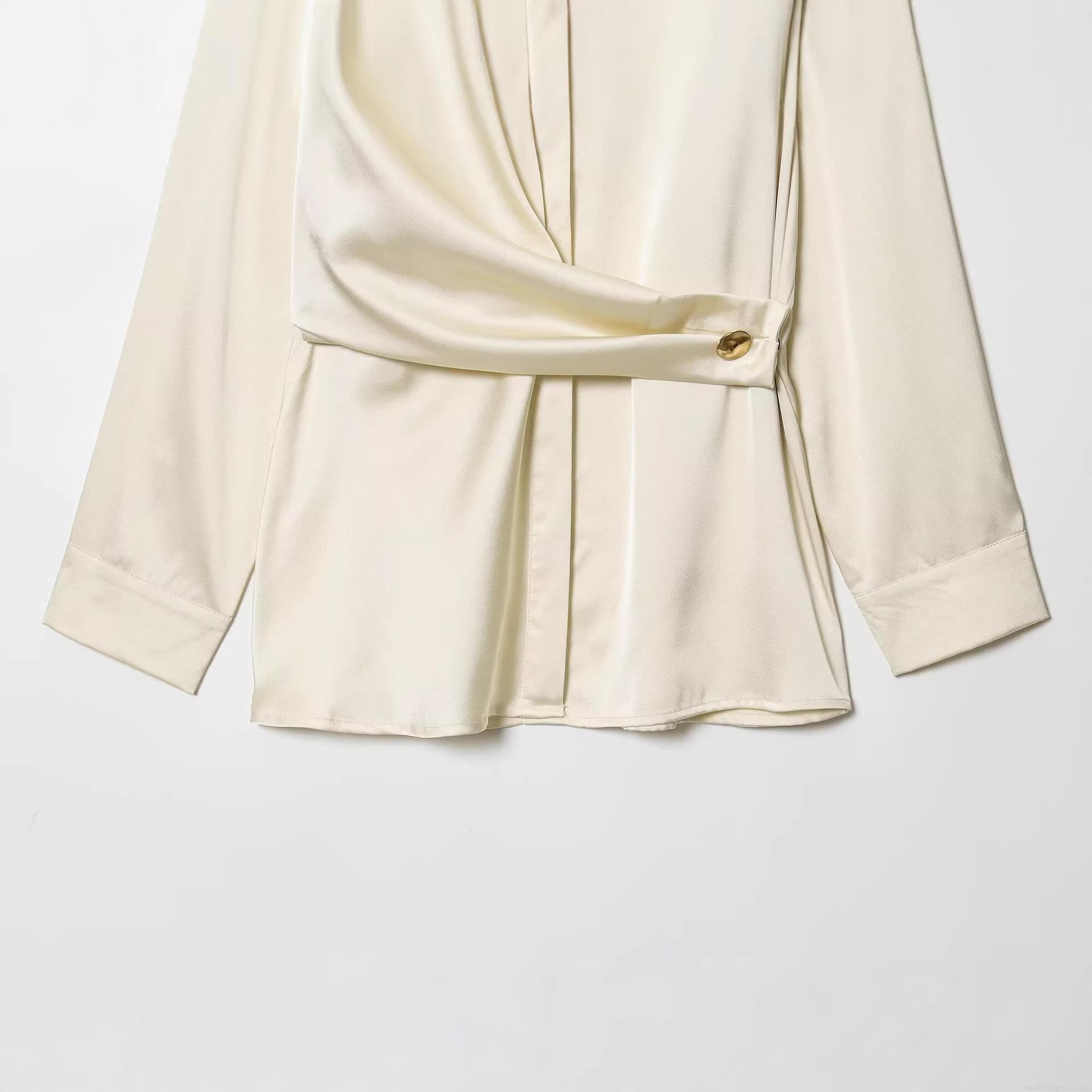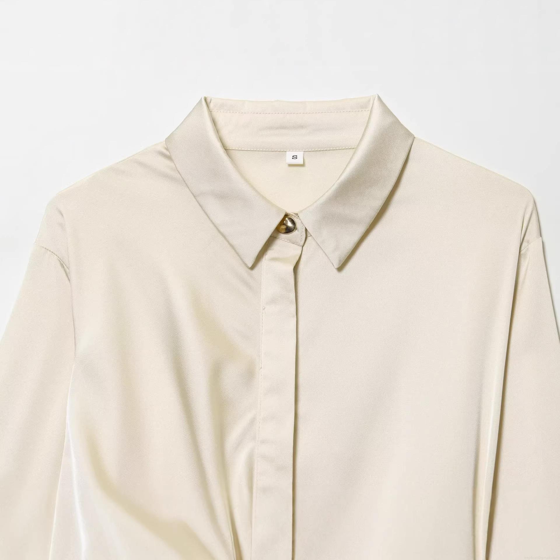 • Elegant Women Acetate Satin Long Sleeve Blouse Turnover Collar Single Breasted Shirt With Waist Twist Pleated Design Metal Button For Office Street Casual Champagne Beige