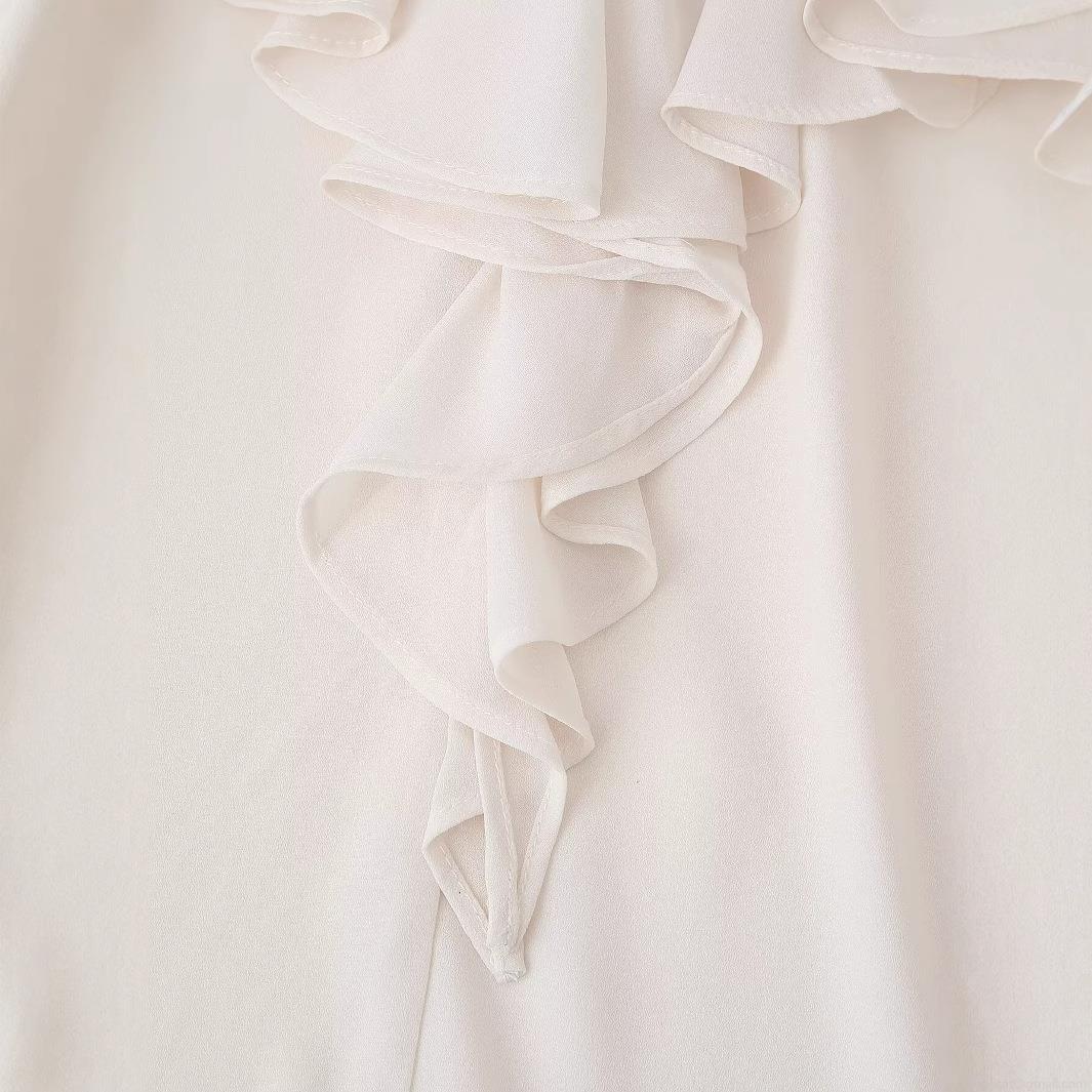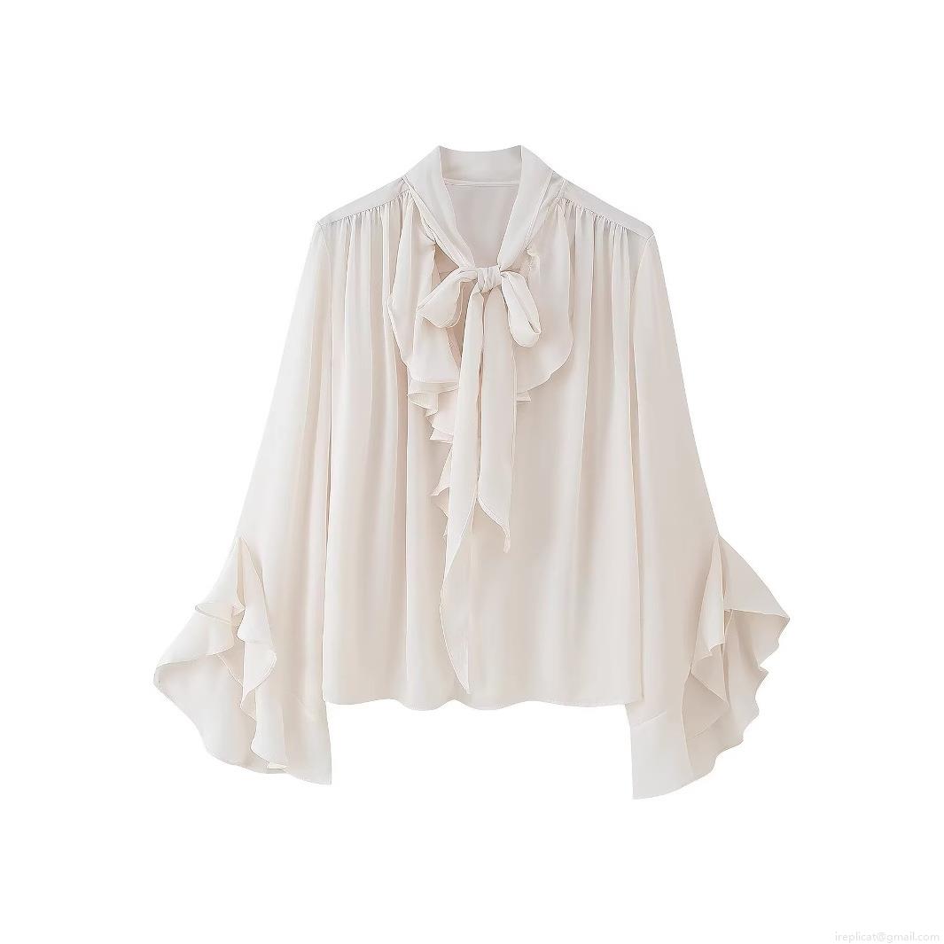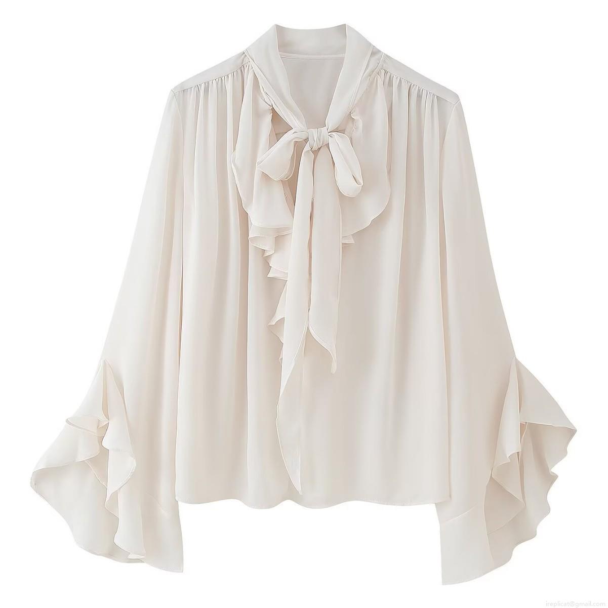 • Elegant Women Chiffon Blouse Long Sleeve Ruffle Flare Cuff Bow Tie Neck Top Ivory Cream Solid Color Sweet Chic Casual Work Office Shirt For Ladies Spring Autumn Fashion