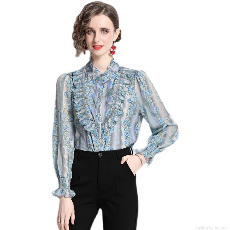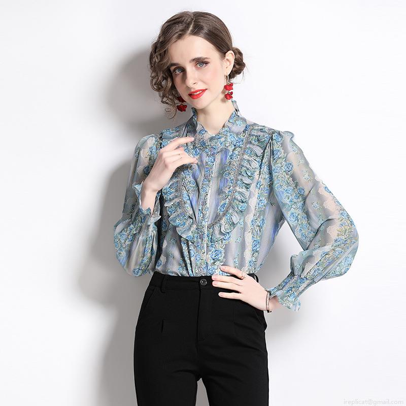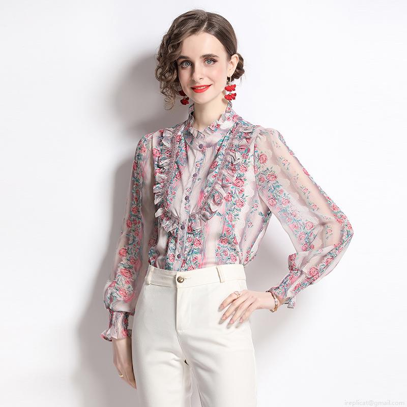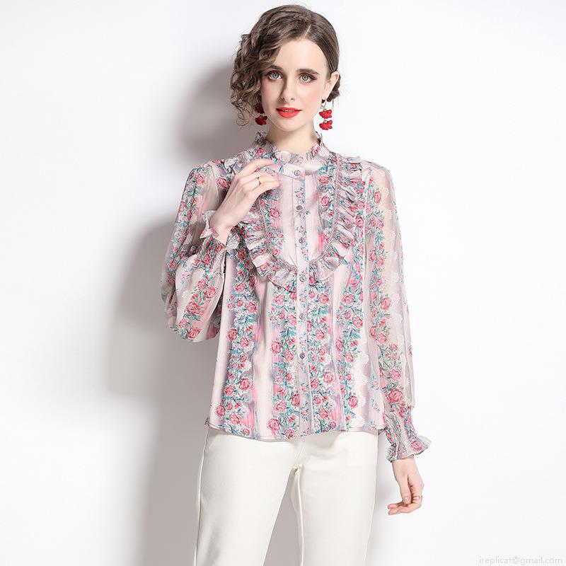• Elegant Women Floral Print Blouse Shirt Vintage Ruffle Stand Collar Long Sleeve Single Breasted Polyester Chiffon Texture Tops For Women Work Party