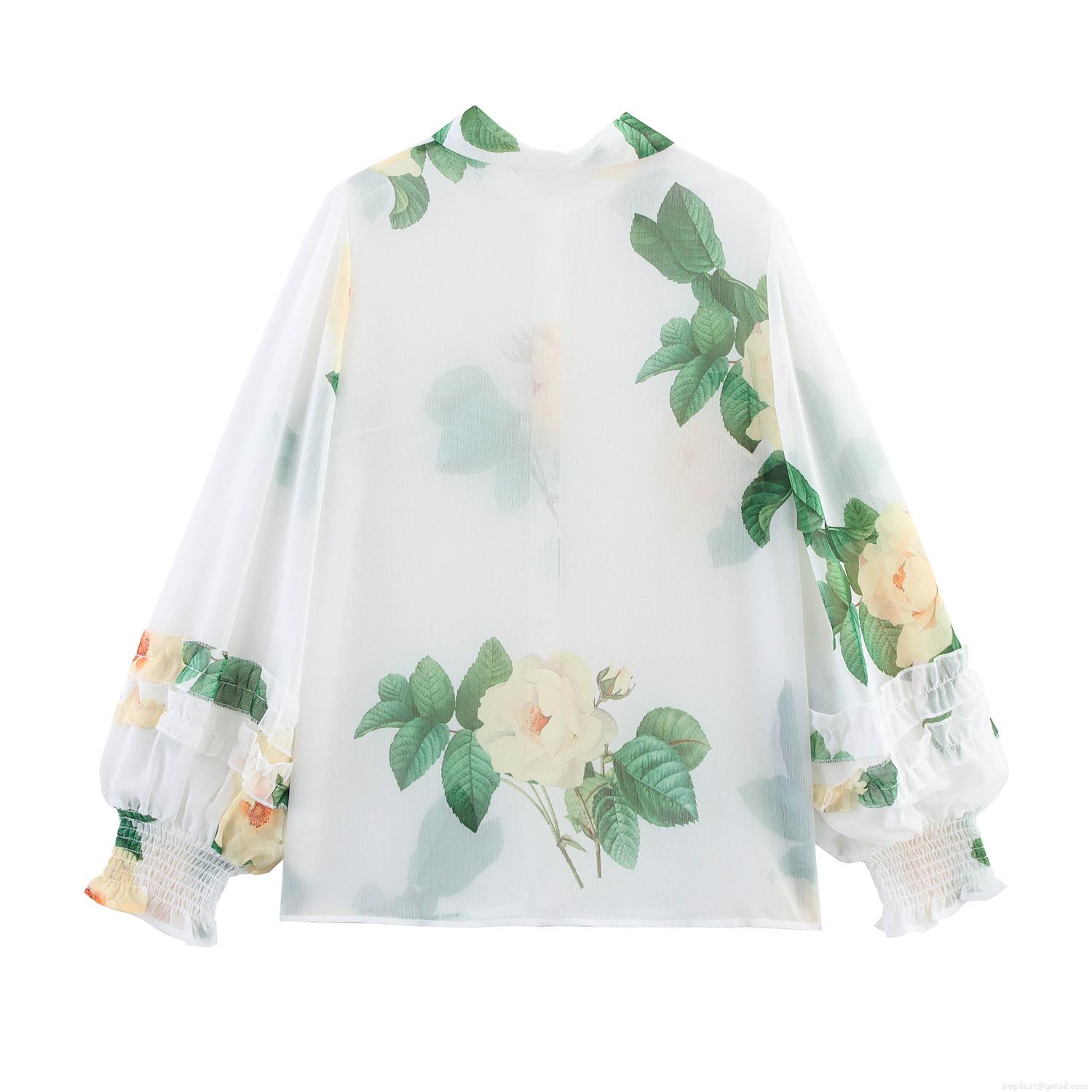 • Elegant Women Floral Print Lantern Sleeve Blouse Chiffon Turndown Collar Single Breasted Shirt with Smocking Cuffs Wood Ear Trim Office Work Top