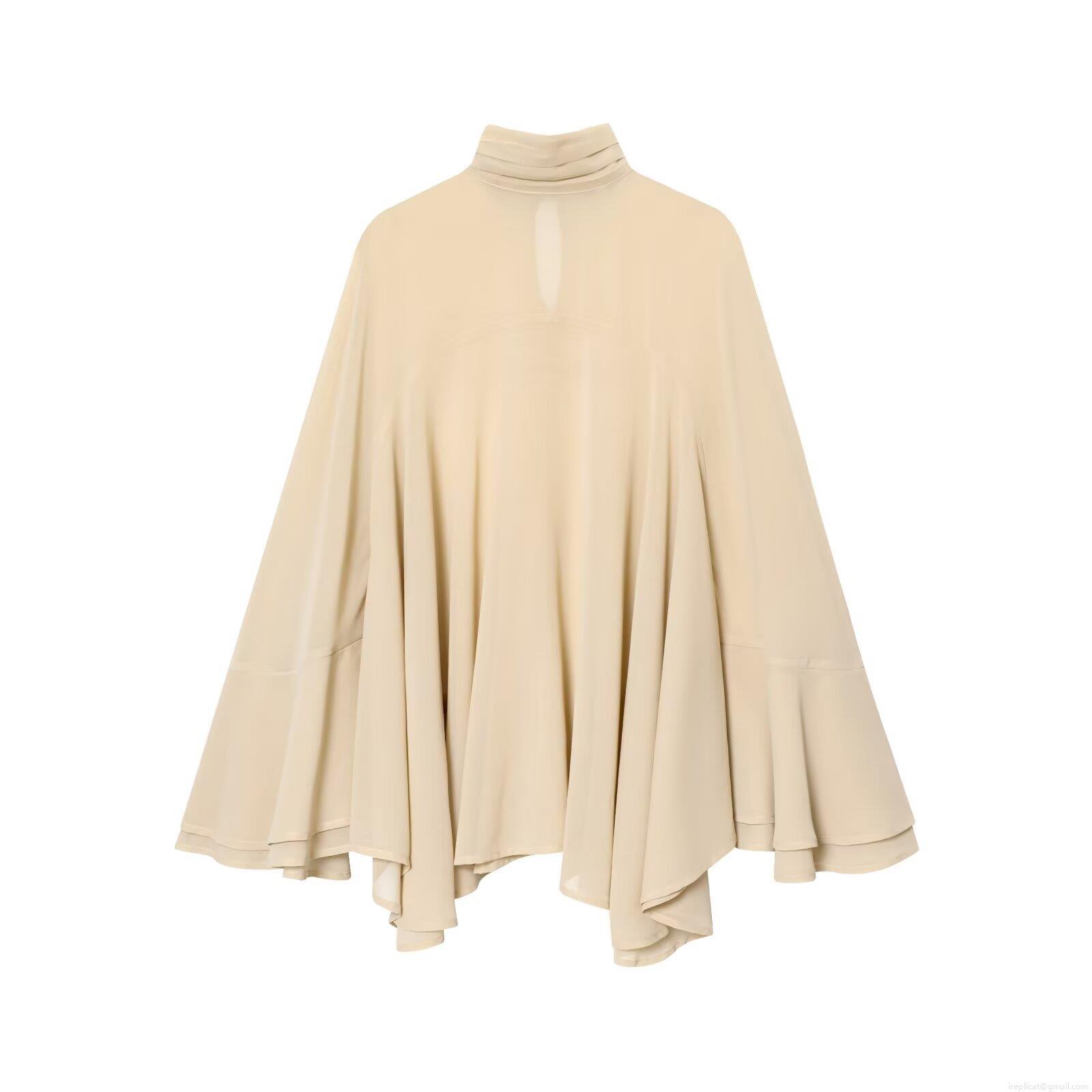 • Elegant Women High Neck Pearl Chiffon Blouse Cape Style Tiered Ruffle Long Flared Sleeve Top For Party Office Solid Color Loose Fit Blouse
