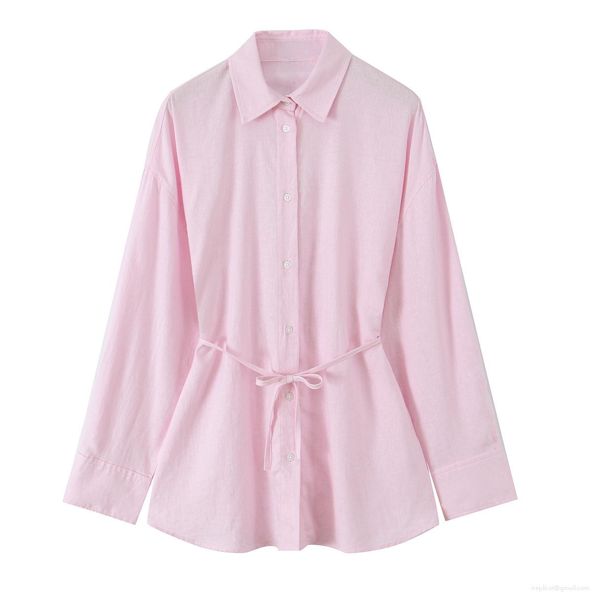 • Elegant Women Long Sleeve Linen Blend Lapel Shirt Solid Color Waist Drawstring Button Down Blouse For Spring Daily Casual Office