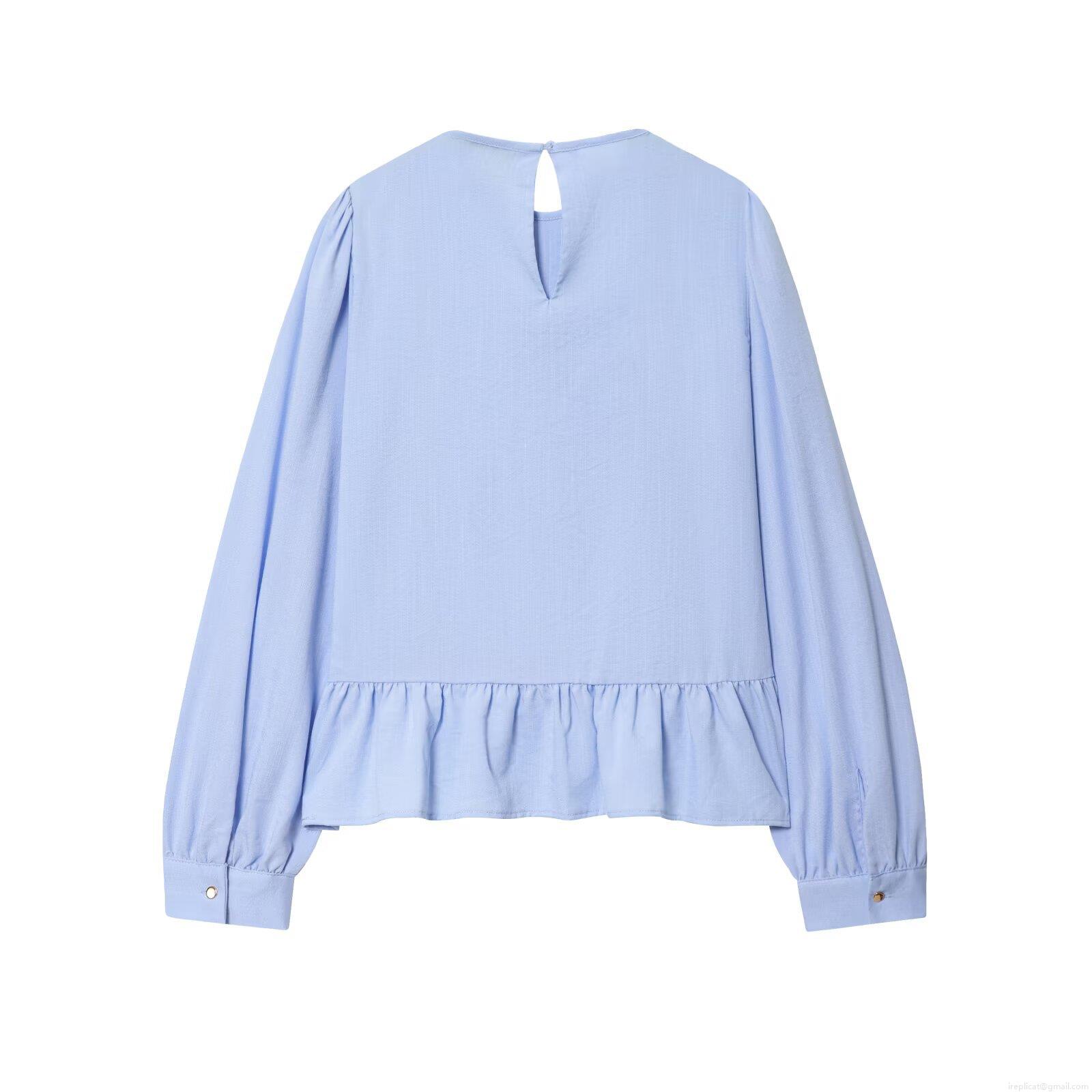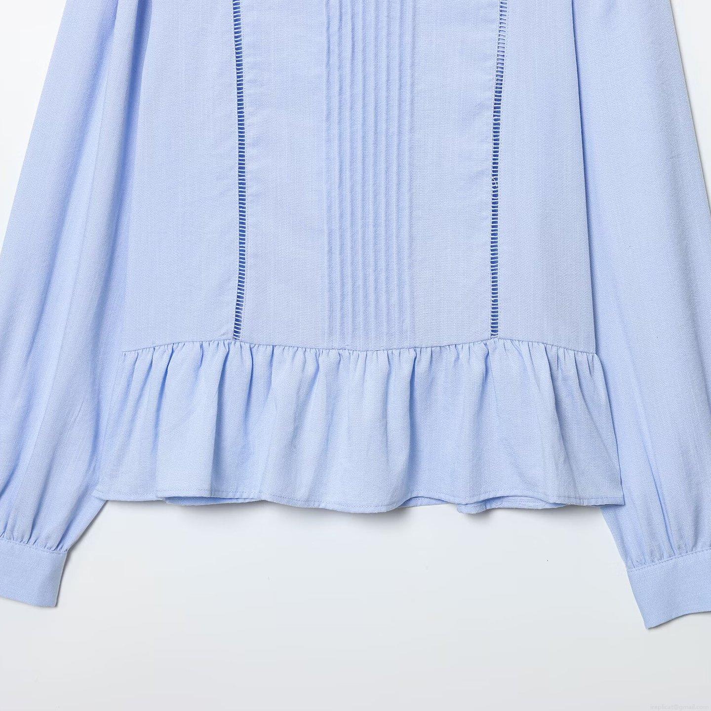 • Elegant Women Round Neck Pintuck Blouse Long Sleeve Polyester Spandex Top With Hollow Out Lace And Ruffle Peplum Hem Casual Daily Shirt For Work School