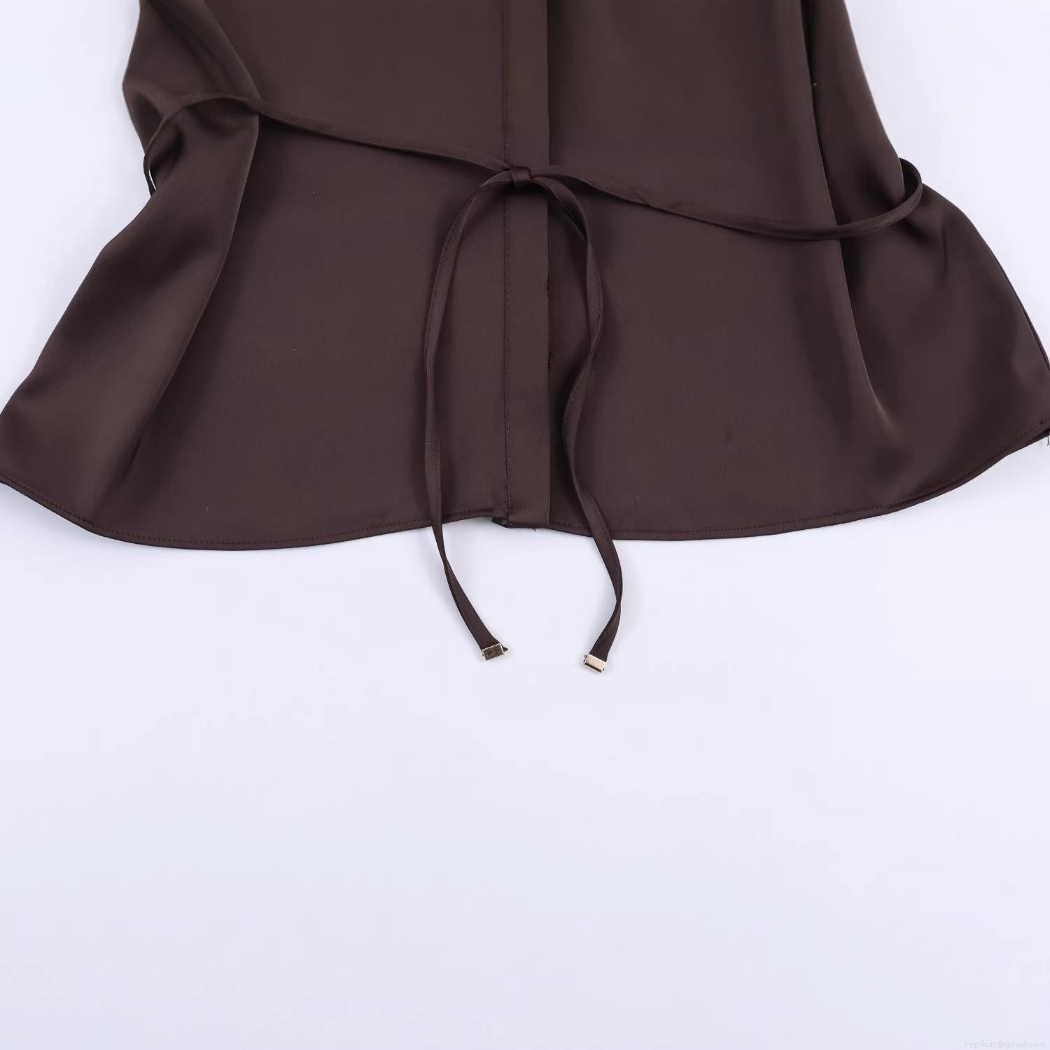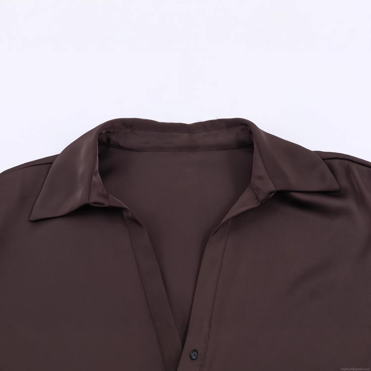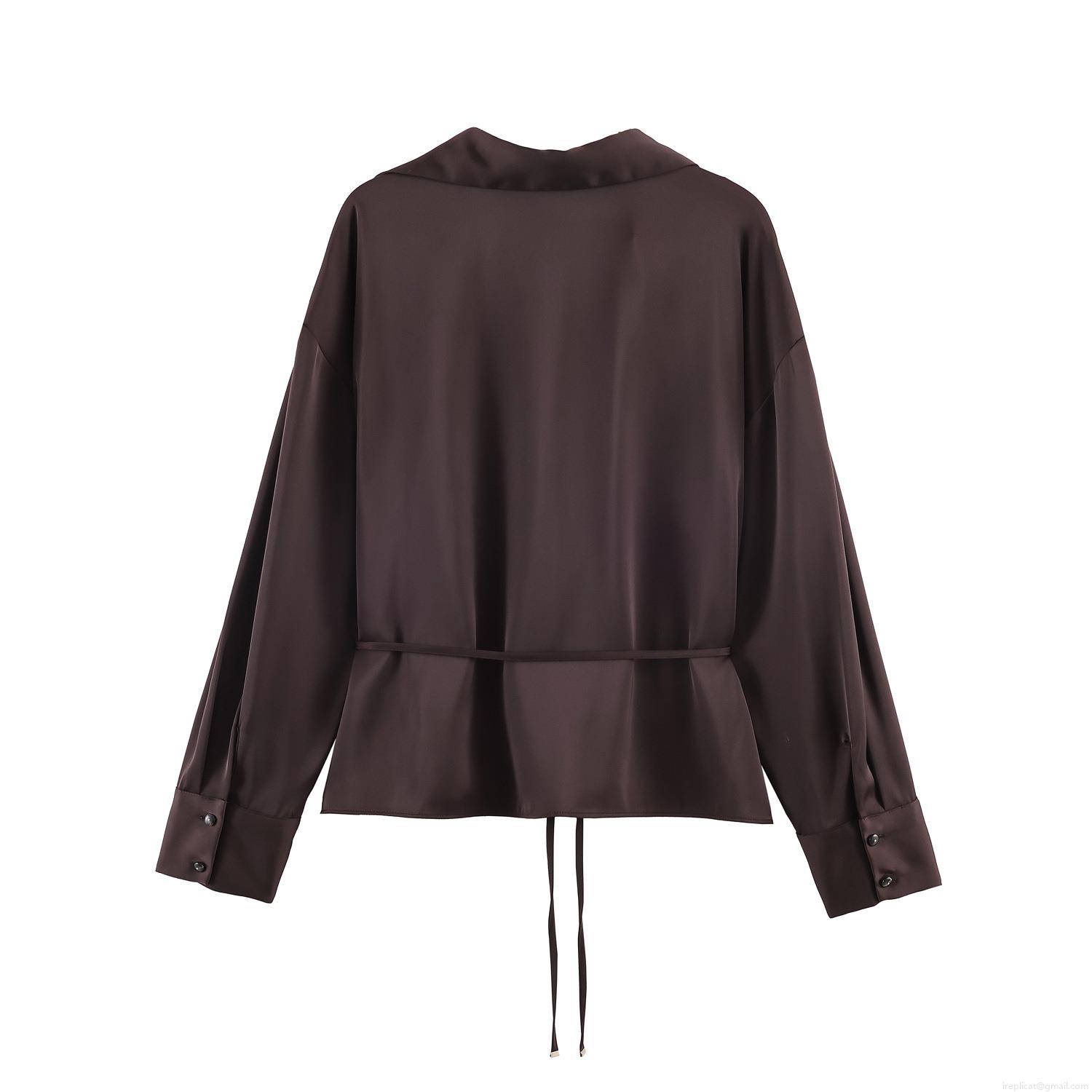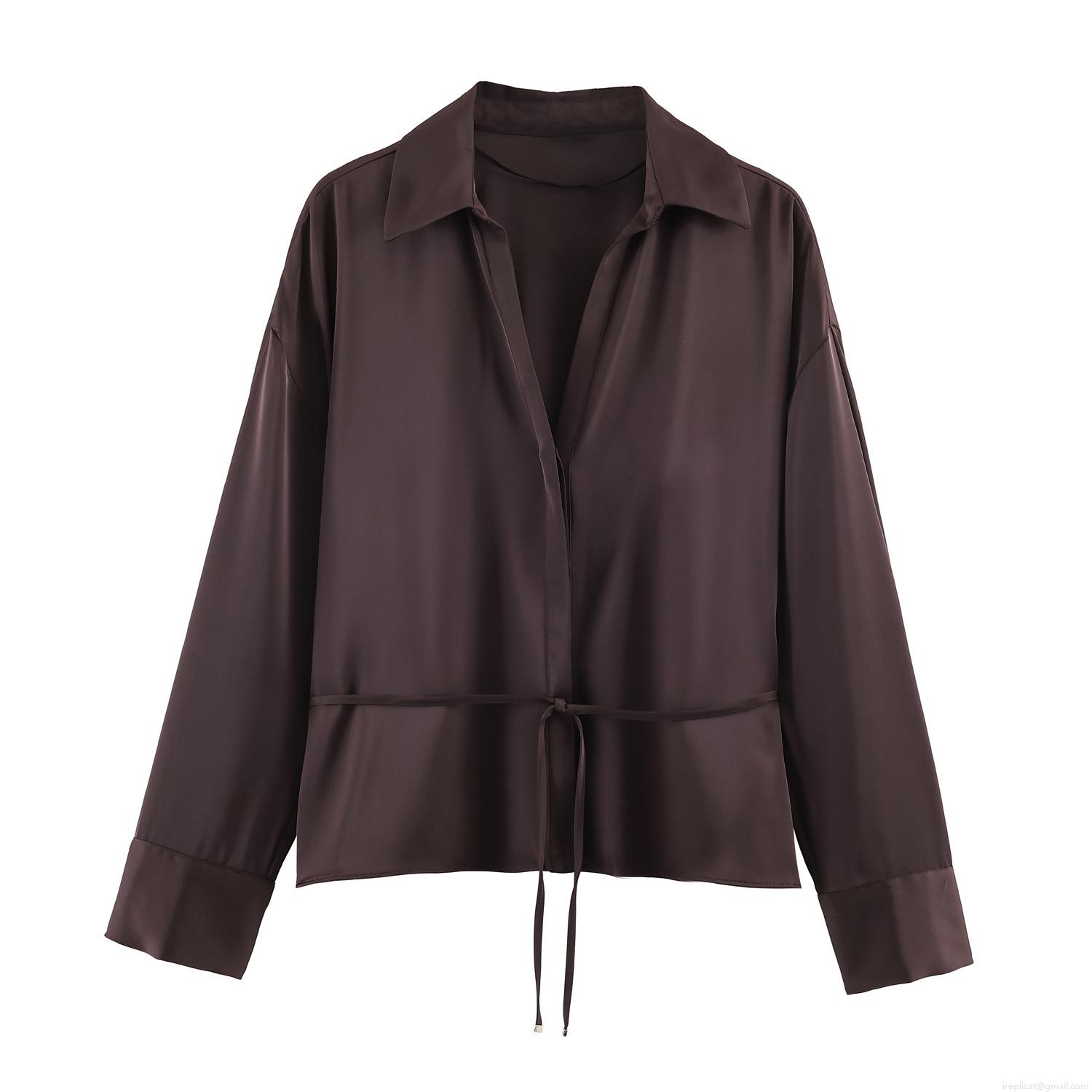 • Elegant Women Satin Polyester Long Sleeve Blouse Silk Texture Button Down Shirt With Waist Tie Drawstring For Office Party Casual