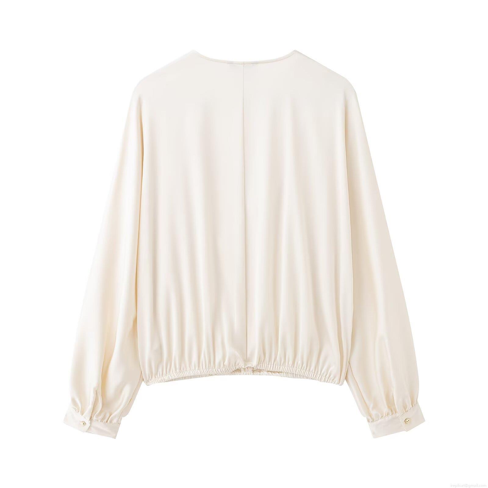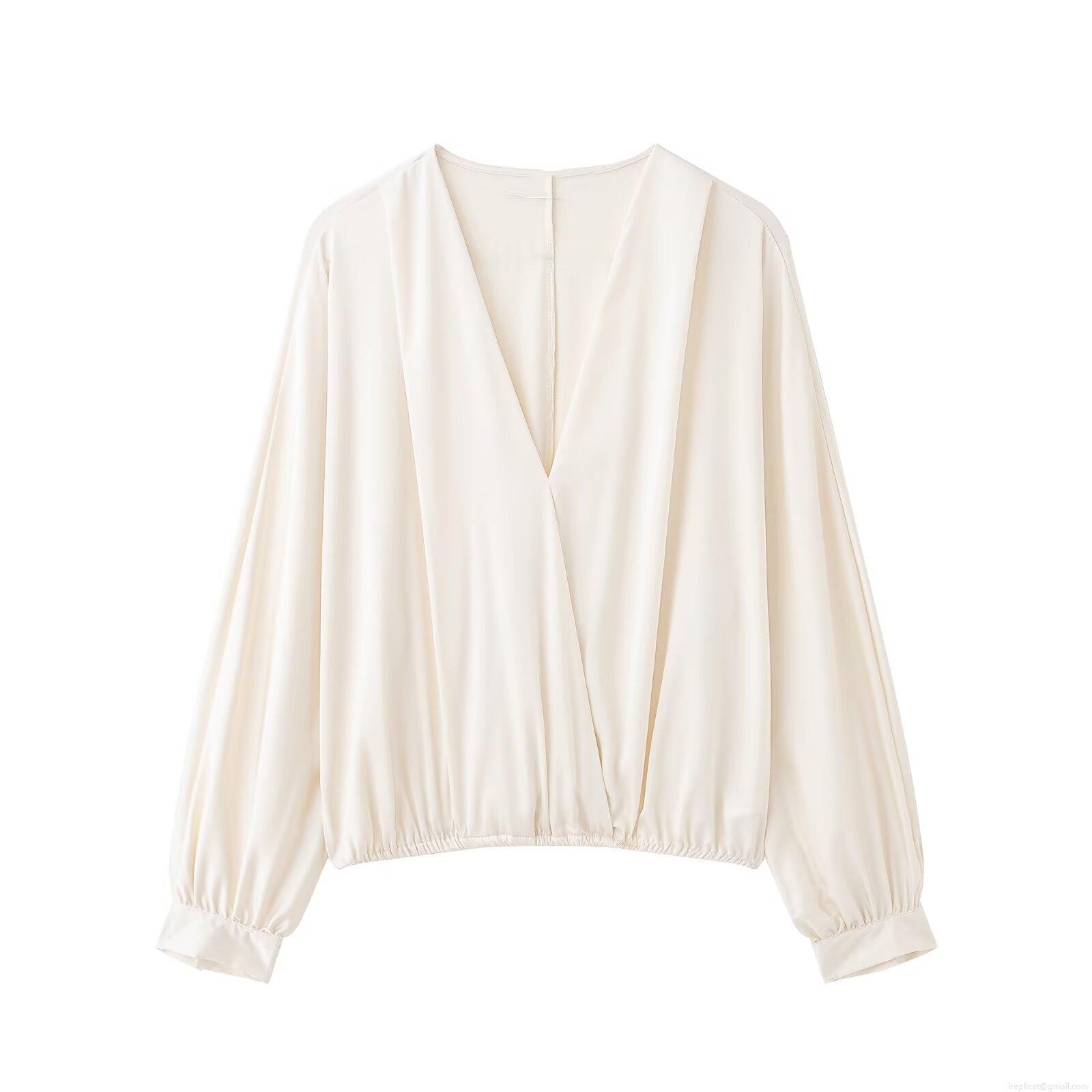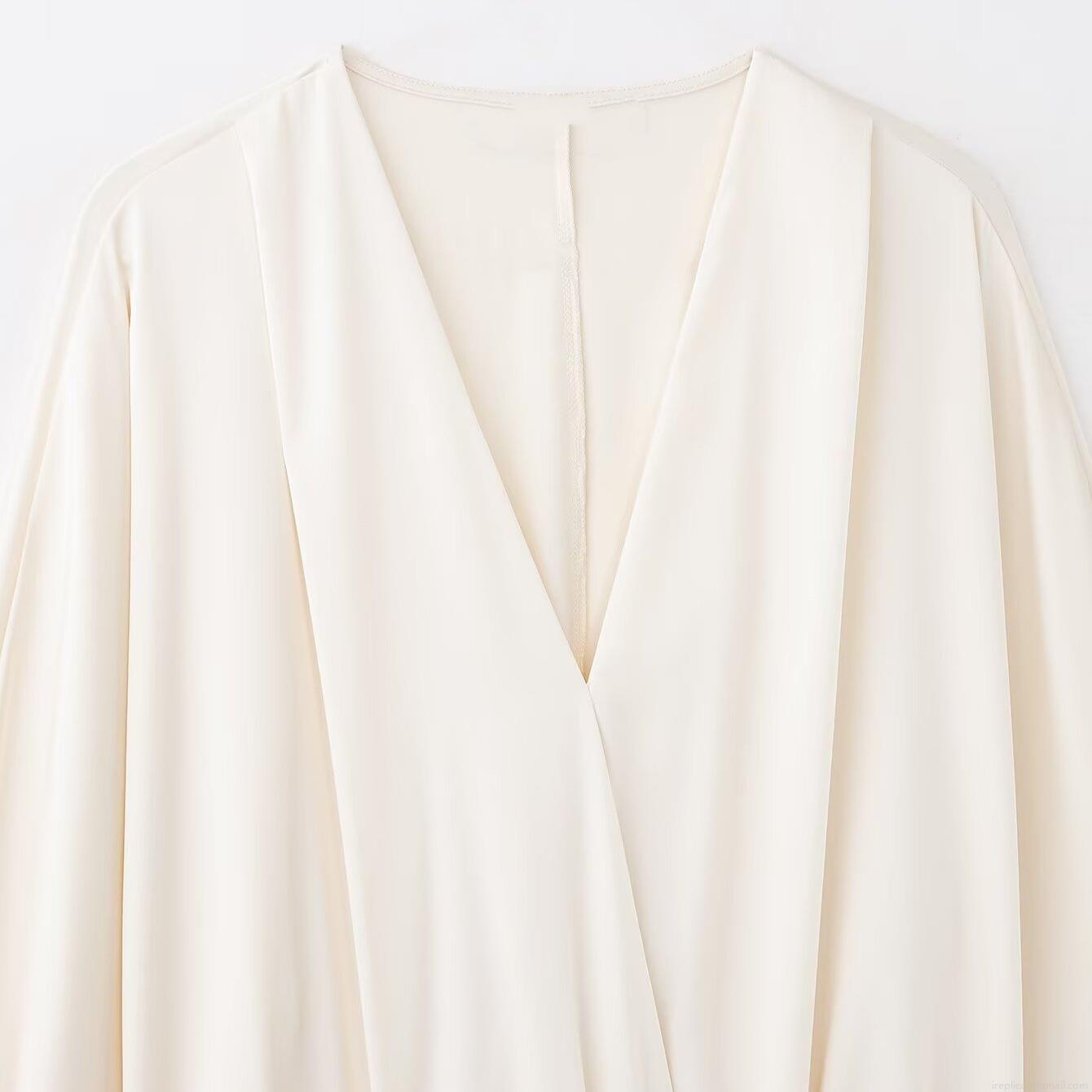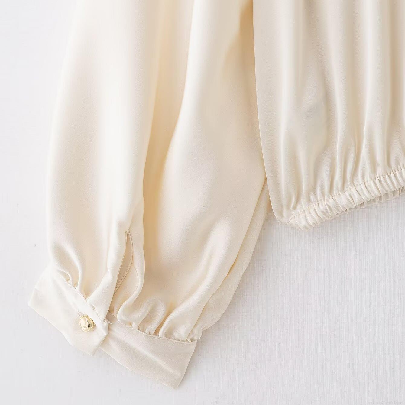 • Elegant Women Satin V-Neck Wrap Blouse Long Lantern Sleeve Solid Color Office Lady Silk Texture Chic Top Off-White Polyester Shirt