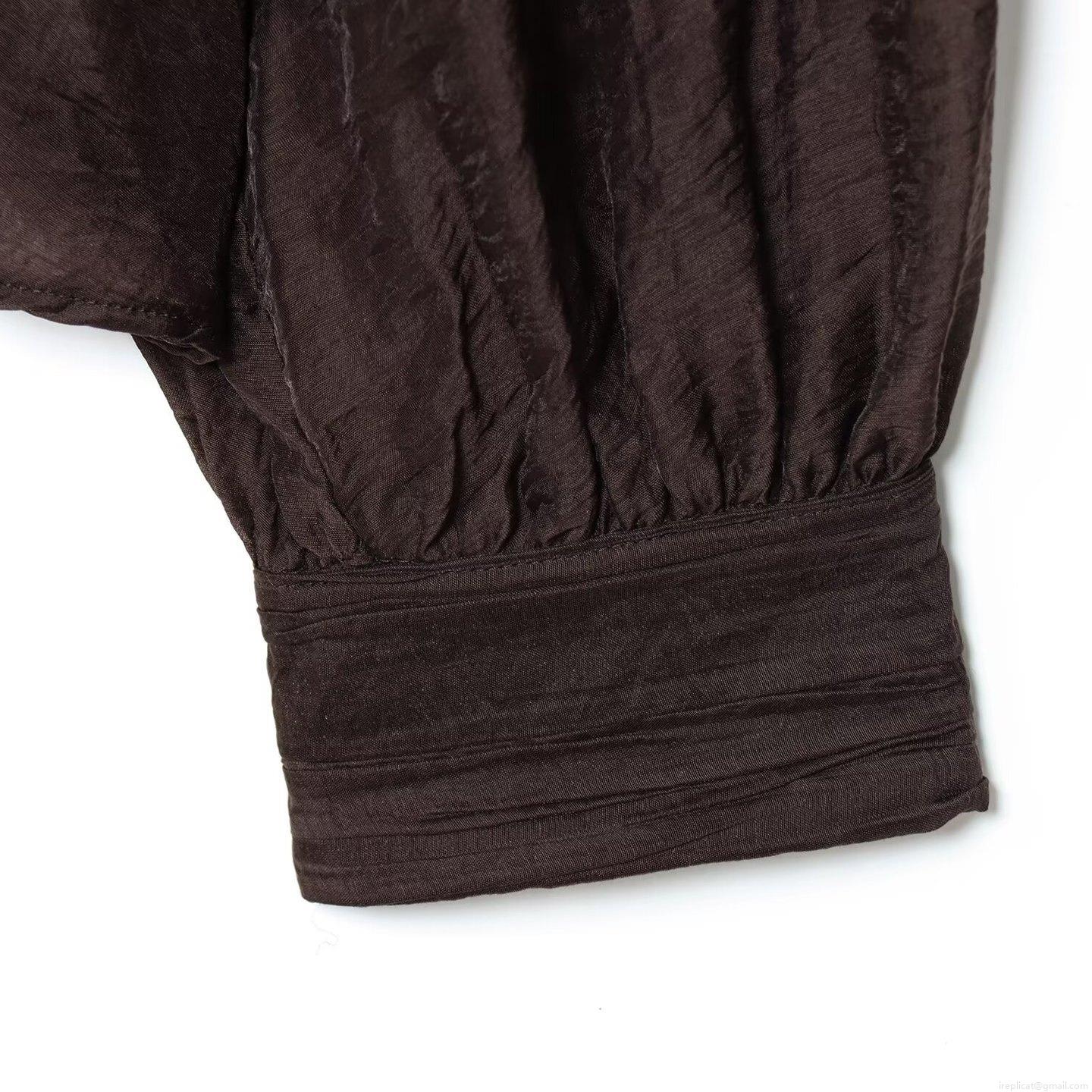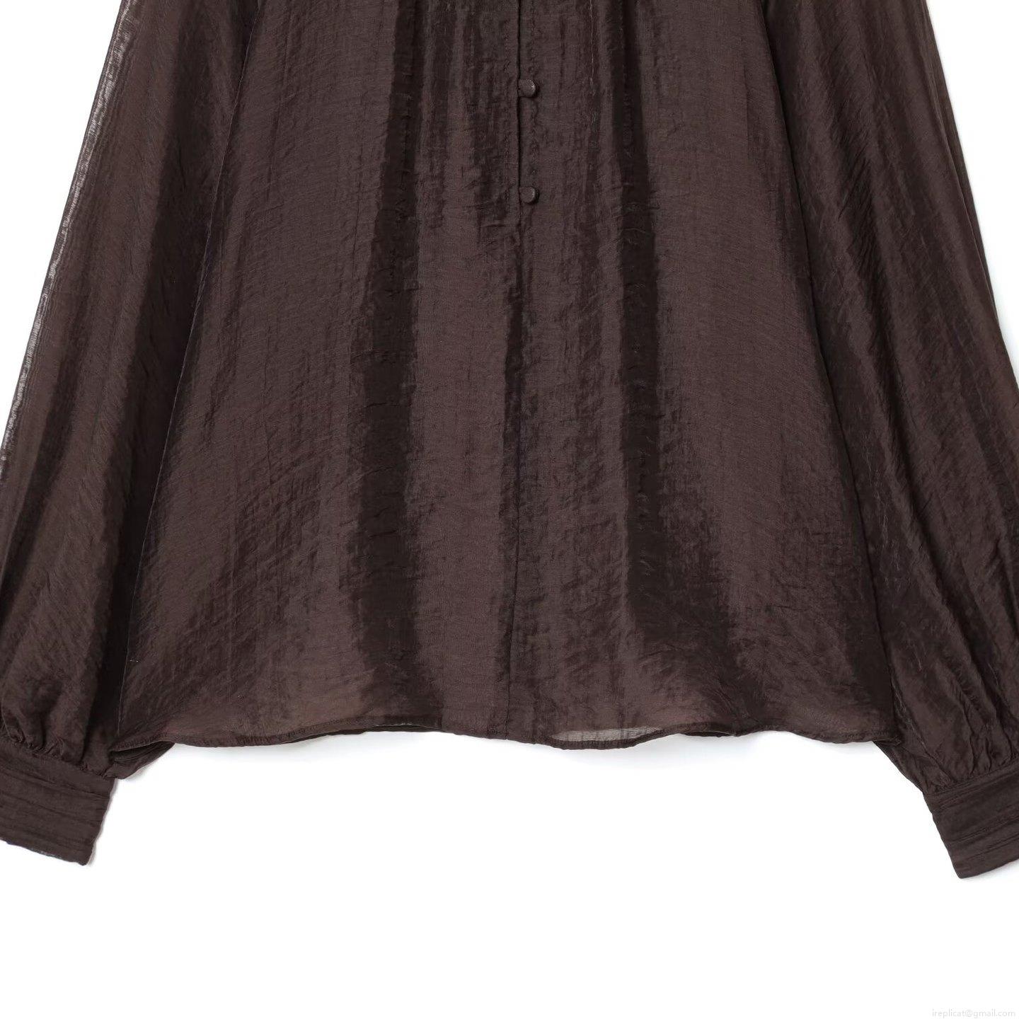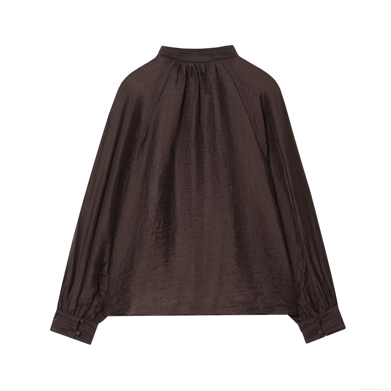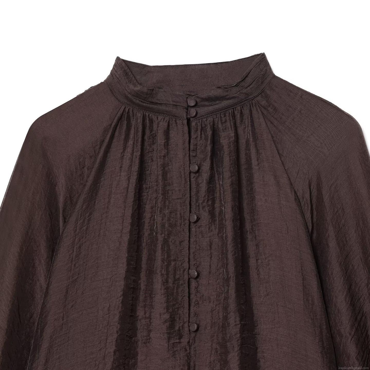 • Elegant Women Tencel Blend Translucent Blouse Stand Collar Long Bubble Sleeve Solid Coffee Shirt Minimalist Casual Glossy Top for Autumn