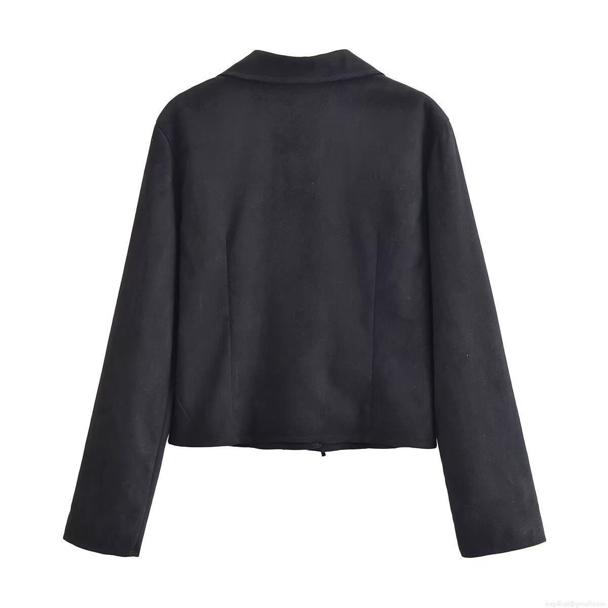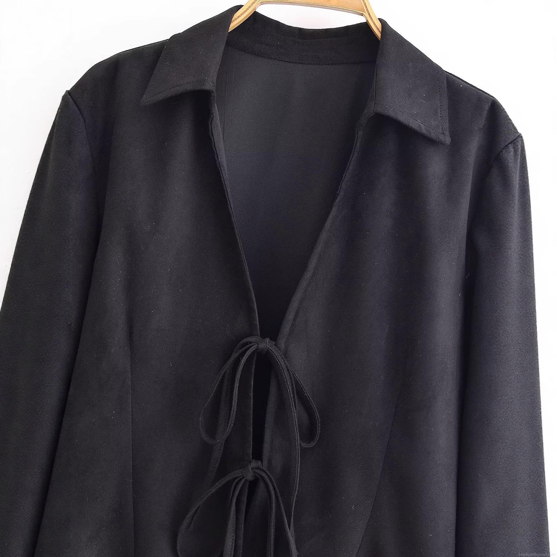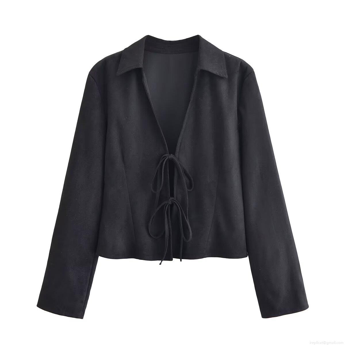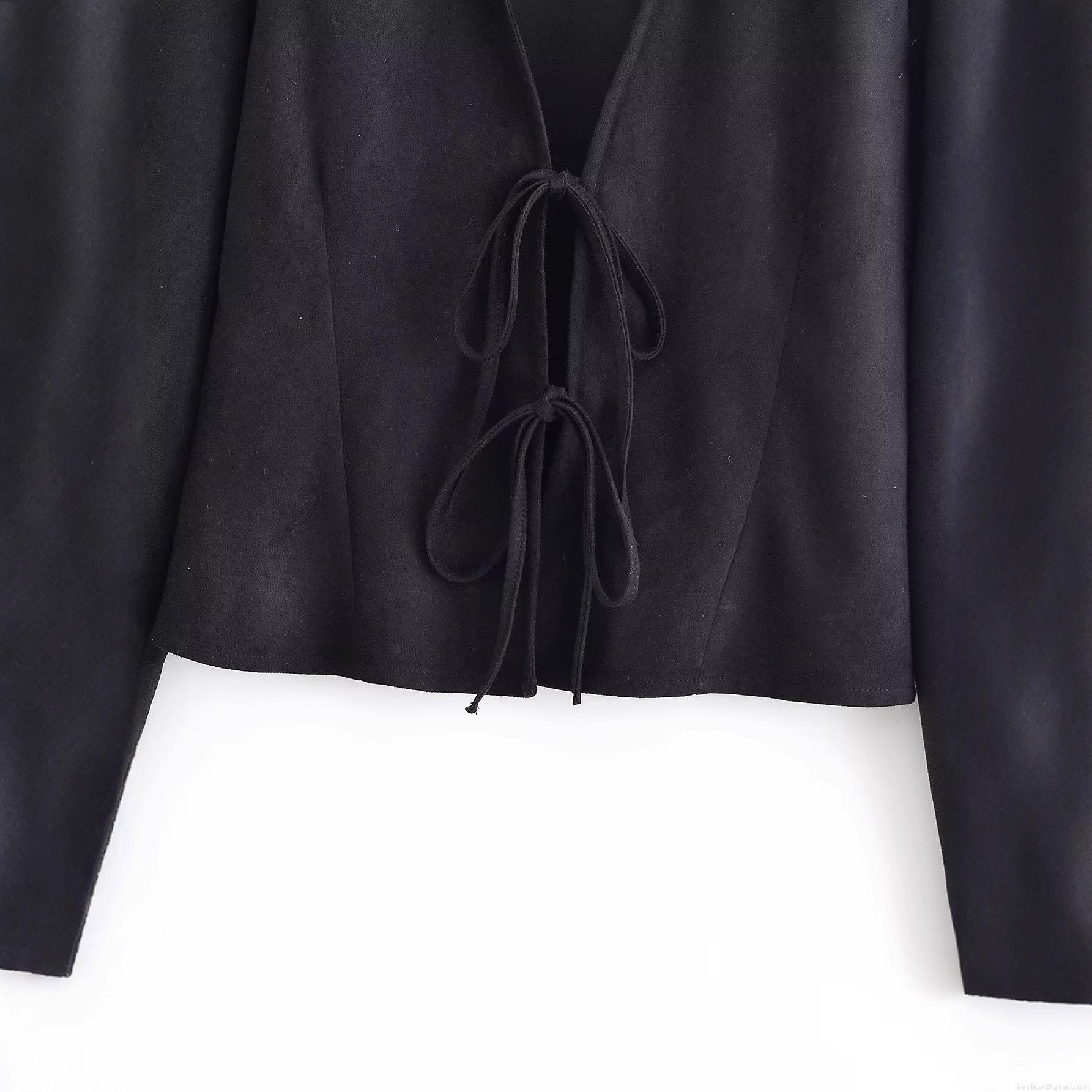 Elegant Women's Black Faux Suede Blouse Long Sleeve Tie-up Bow Front Slim Fit Top For Casual Party Dating