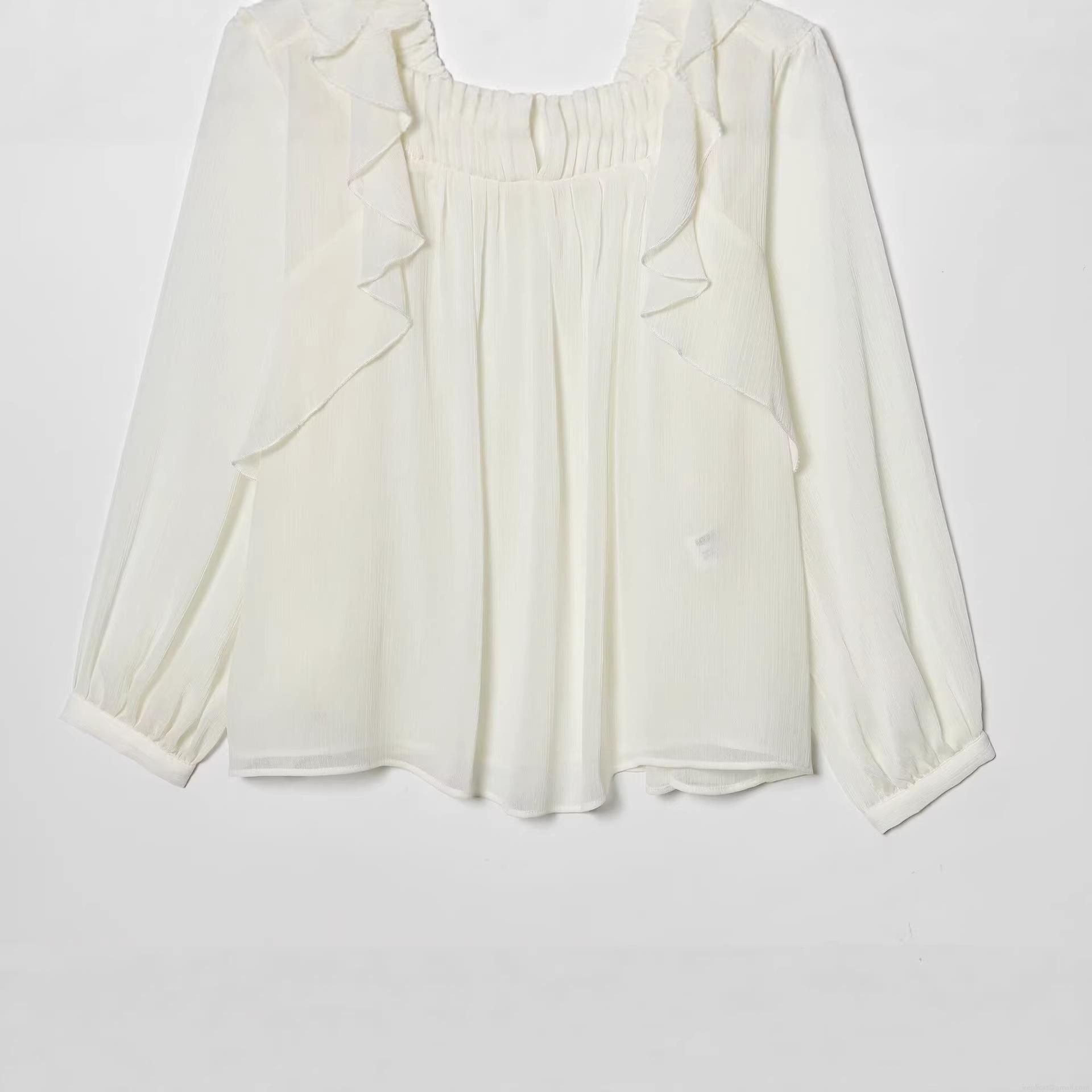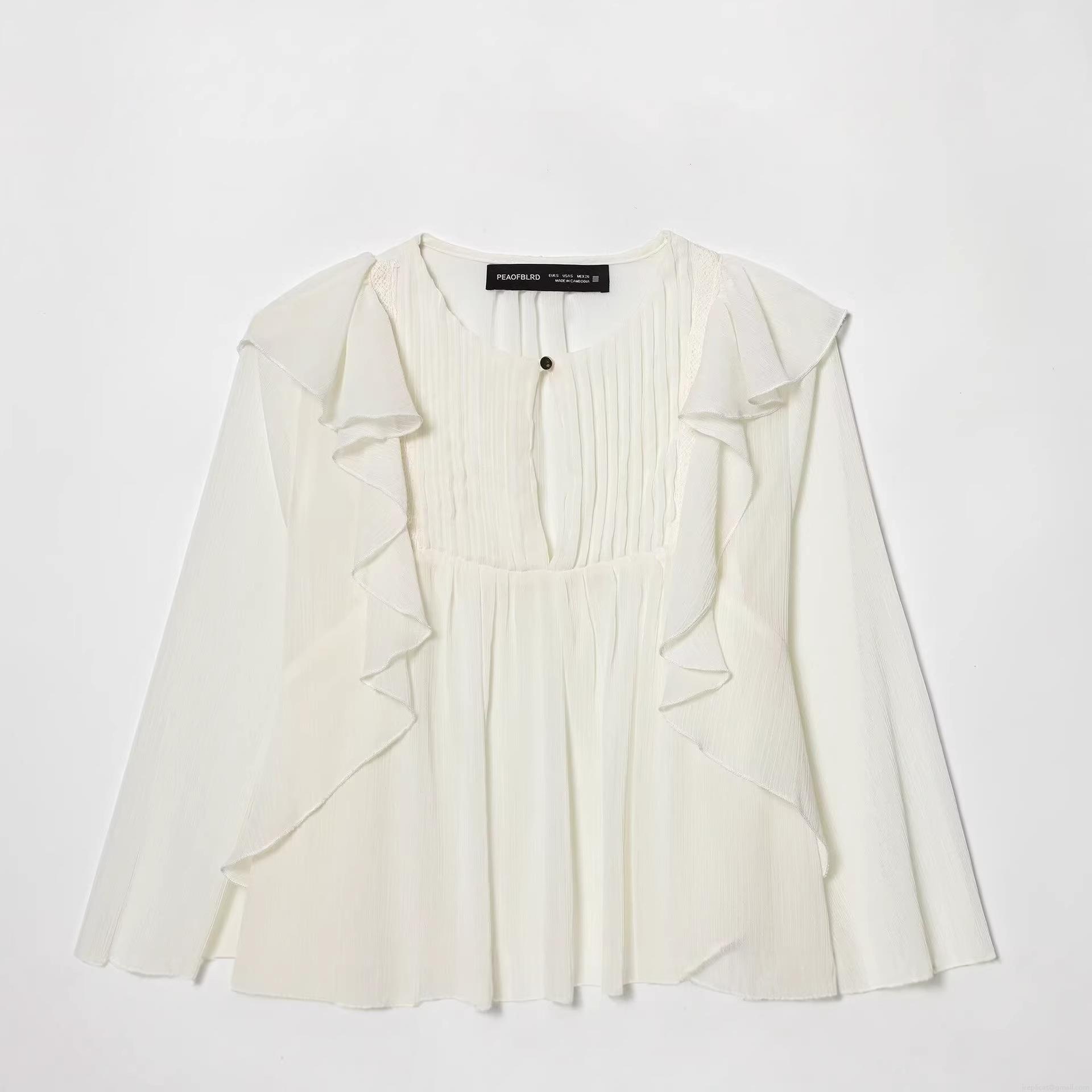 • Elegant Women's Creamy White Long Sleeve Chiffon Blouse With Ruffle Detail And Pleated Design Fashion Single-Breasted Solid Color Top For Spring Autumn Women's Clothing
