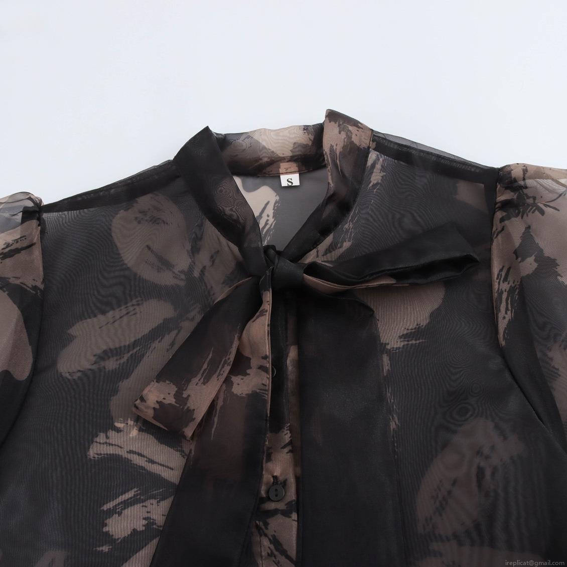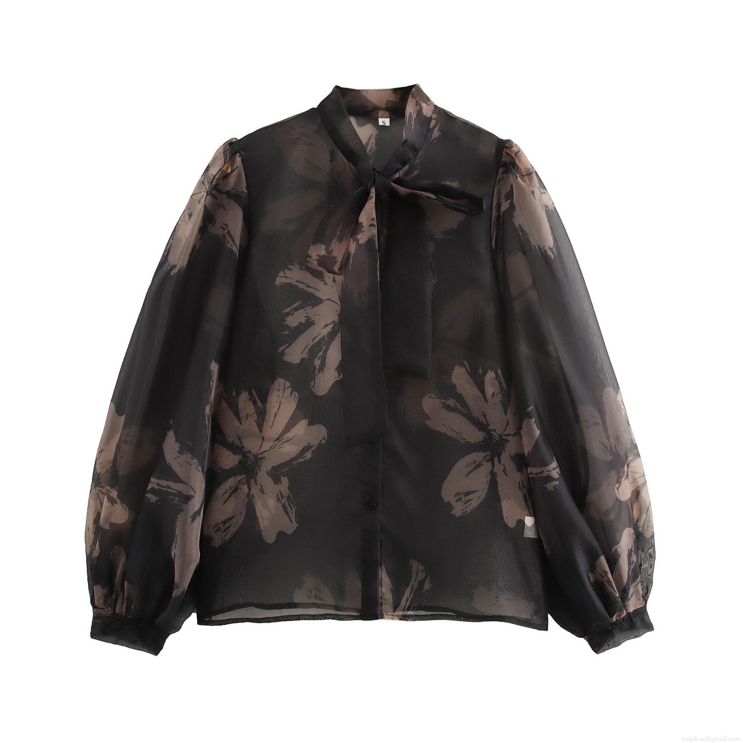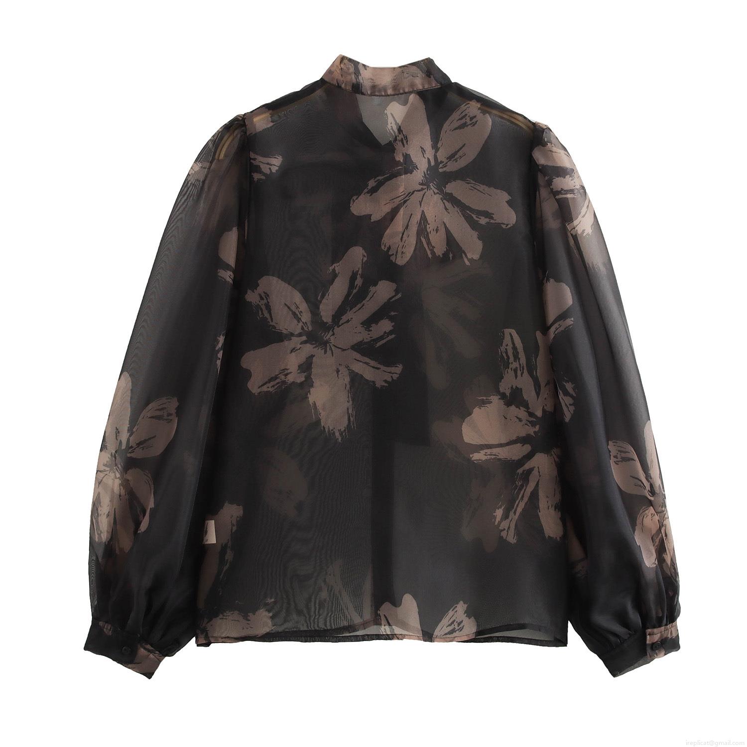 • Elegant Women's Floral Print Organza Blouse Sheer Mesh Long Sleeve Top With Bow Tie Neck Vintage Loose Fit See-Through Shirt For Office Party Daily Wear